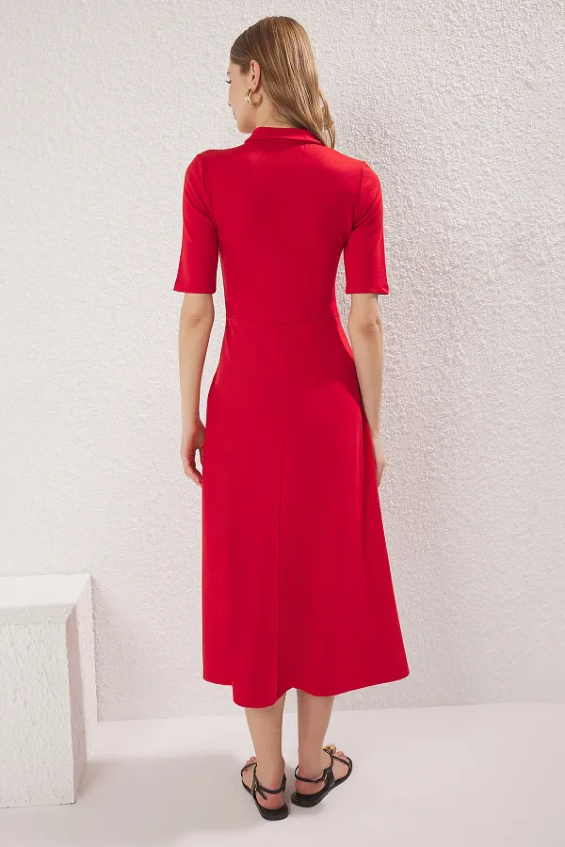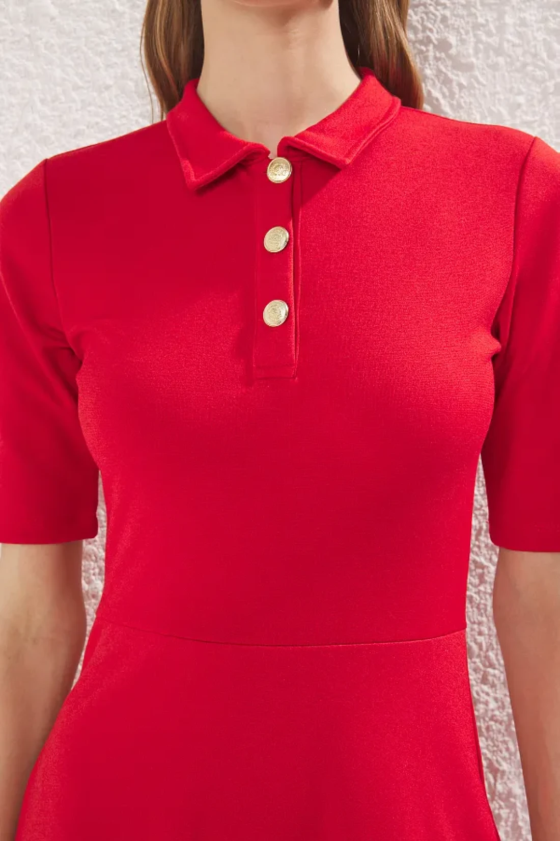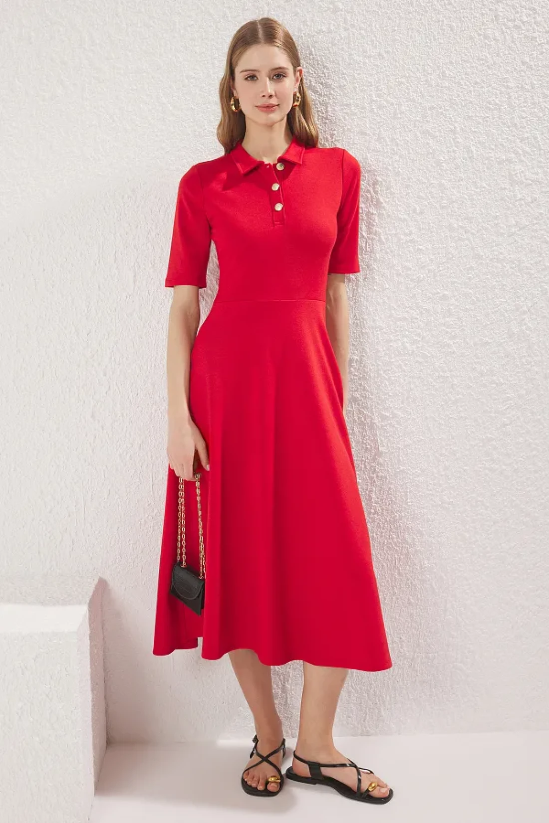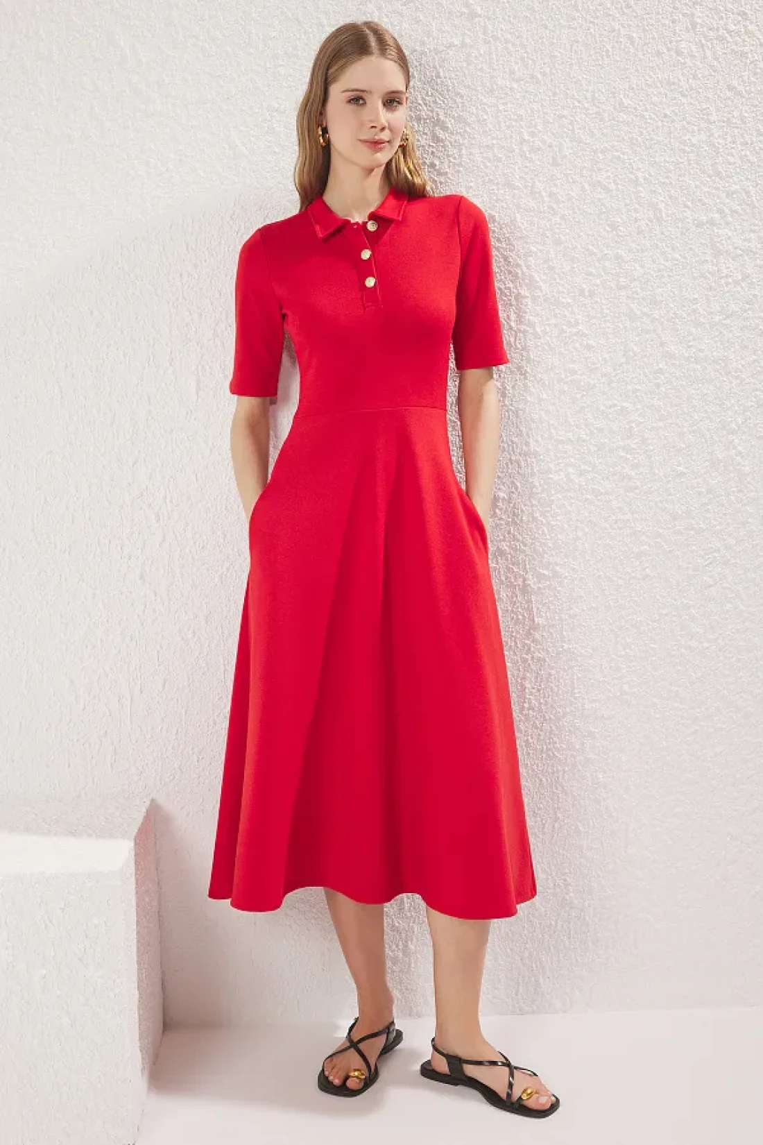 Collection Red Midi Knitted Dress - Three Quarter Sleeve, Button-Down Collar, Skater Style - Twoaw25El00518