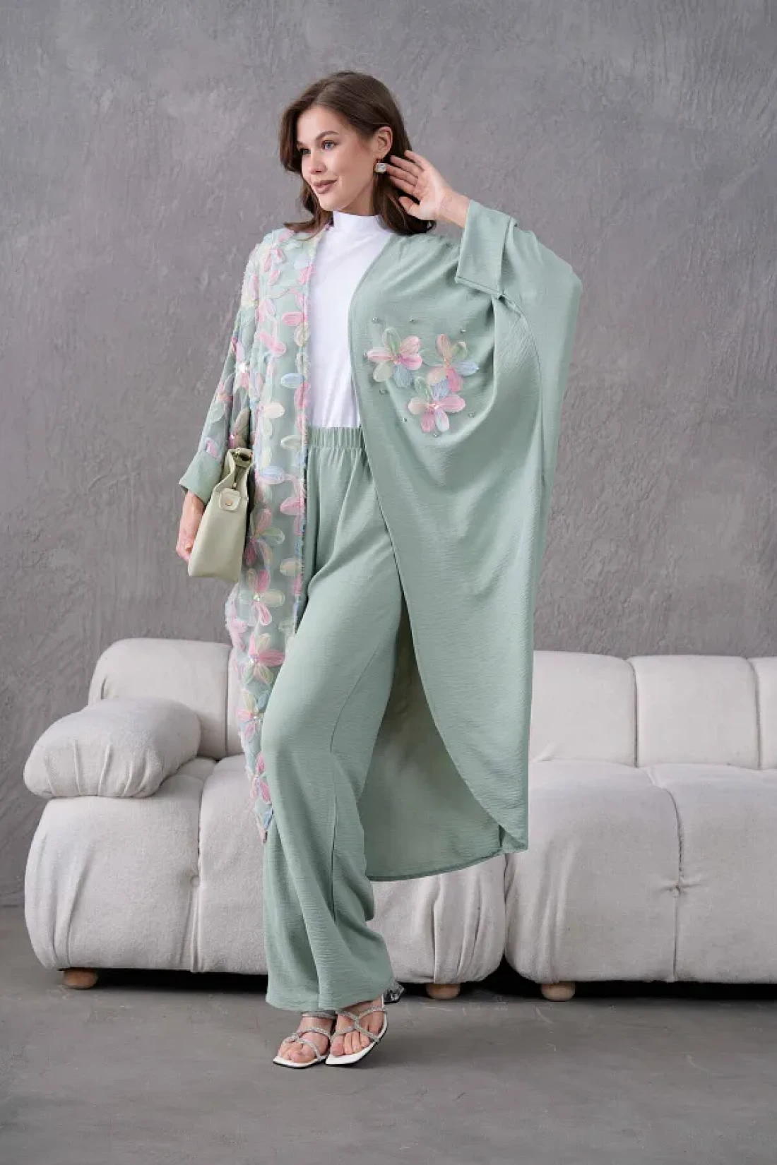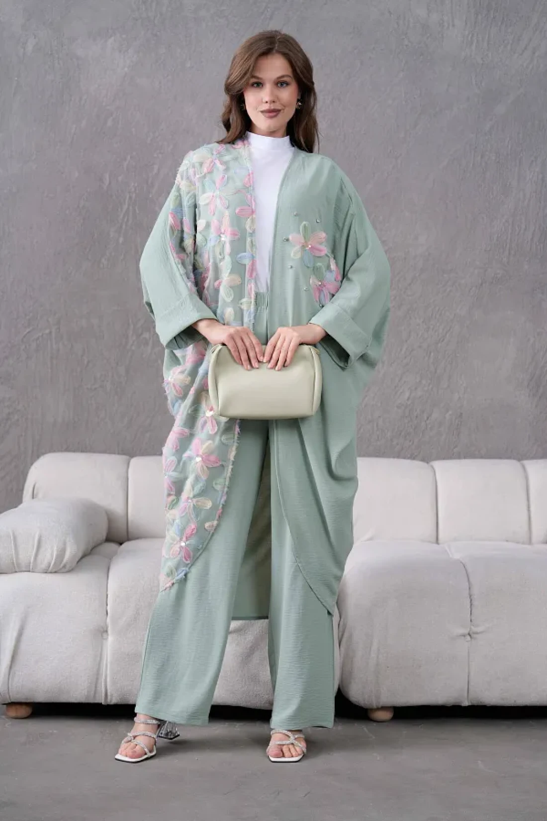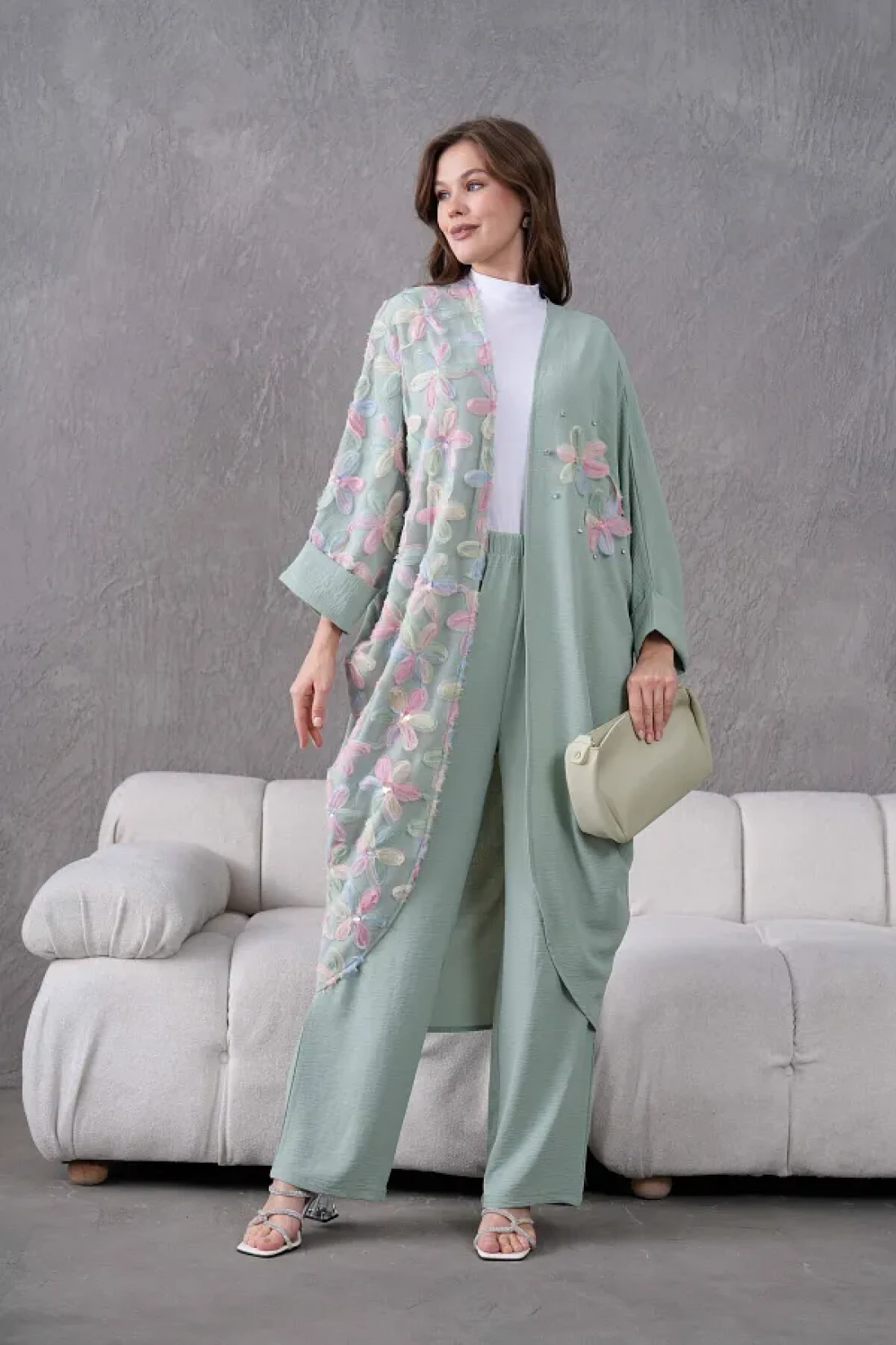 -miss allos women's front tulle flower embroidered stone detailed linen kimono and trouser bottom set - this set, consisting of long-sleeved and wide-leg trousers, offers comfort and elegance together. This set, reflecting the energy of the summer months with its green color tone, is ideal for daily use. Thanks to its linen material, it provides a comfortable experience with its light and breathable structure. Floral patterned tulle details are added for a feminine touch, giving it a striking appearance.