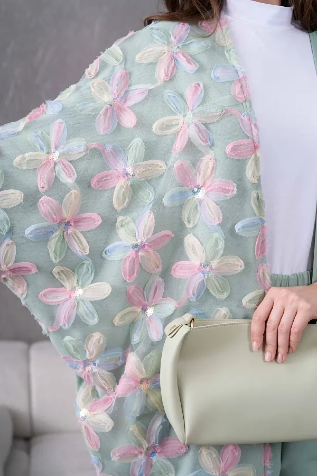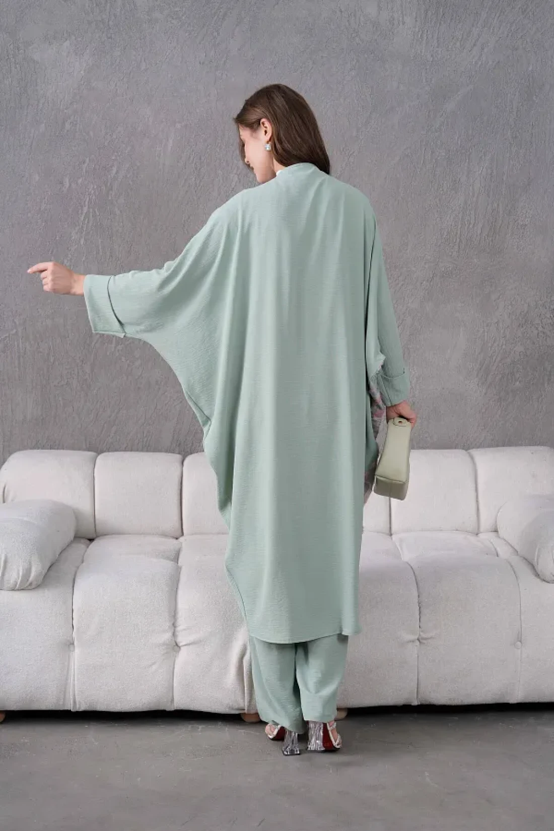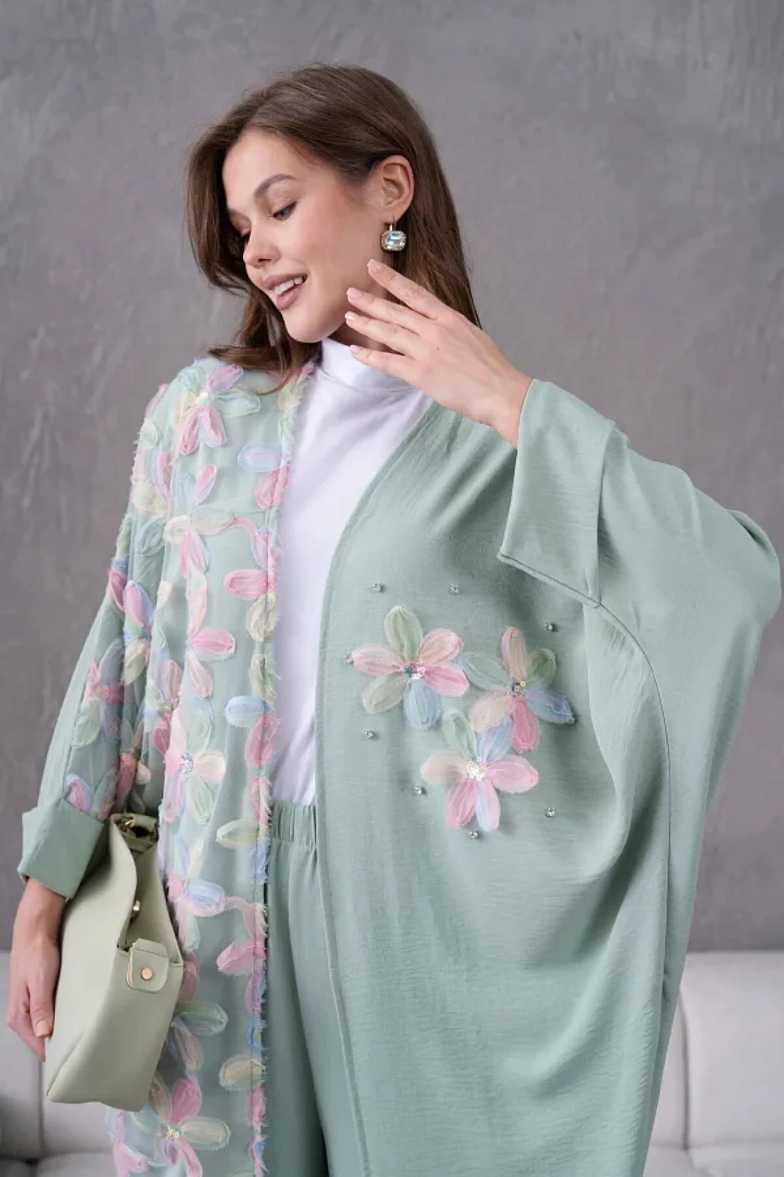-miss allos women's front tulle flower embroidered stone detailed linen kimono and trouser bottom set - this set, consisting of long-sleeved and wide-leg trousers, offers comfort and elegance together. This set, reflecting the energy of the summer months with its green color tone, is ideal for daily use. Thanks to its linen material, it provides a comfortable experience with its light and breathable structure. Floral patterned tulle details are added for a feminine touch, giving it a striking appearance.