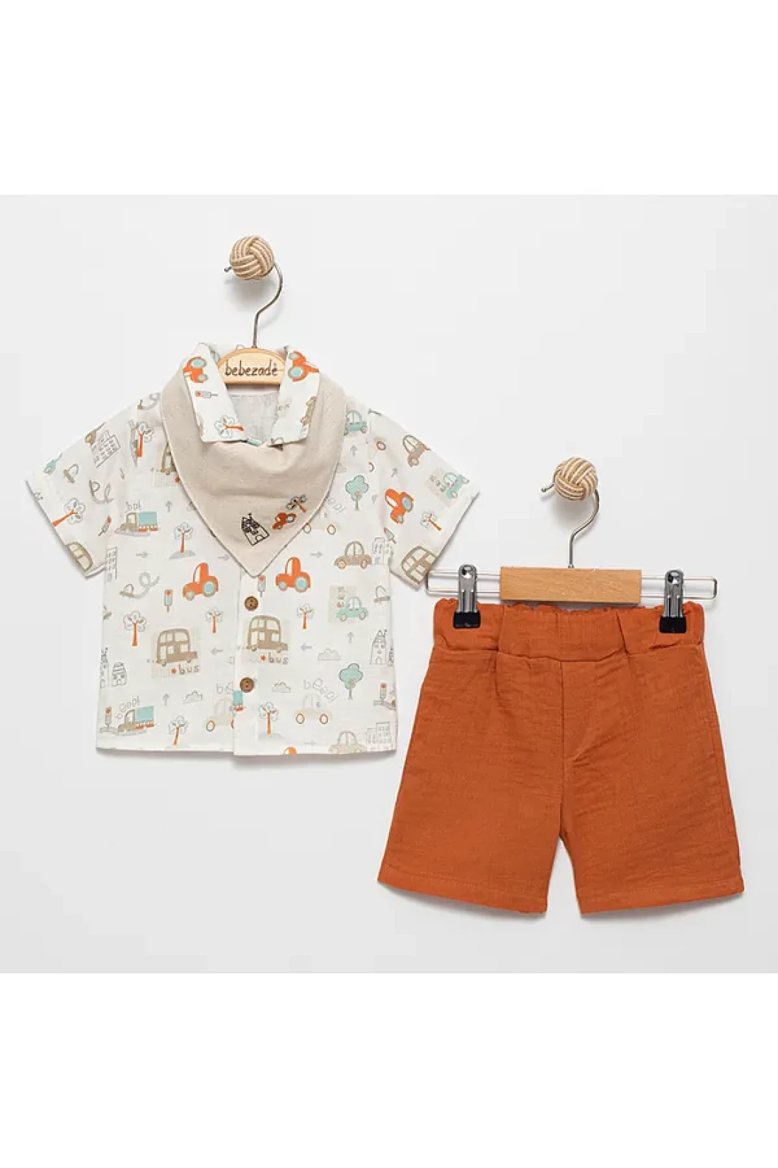 Baby boy apron detailed car printed summer shirt shorts set