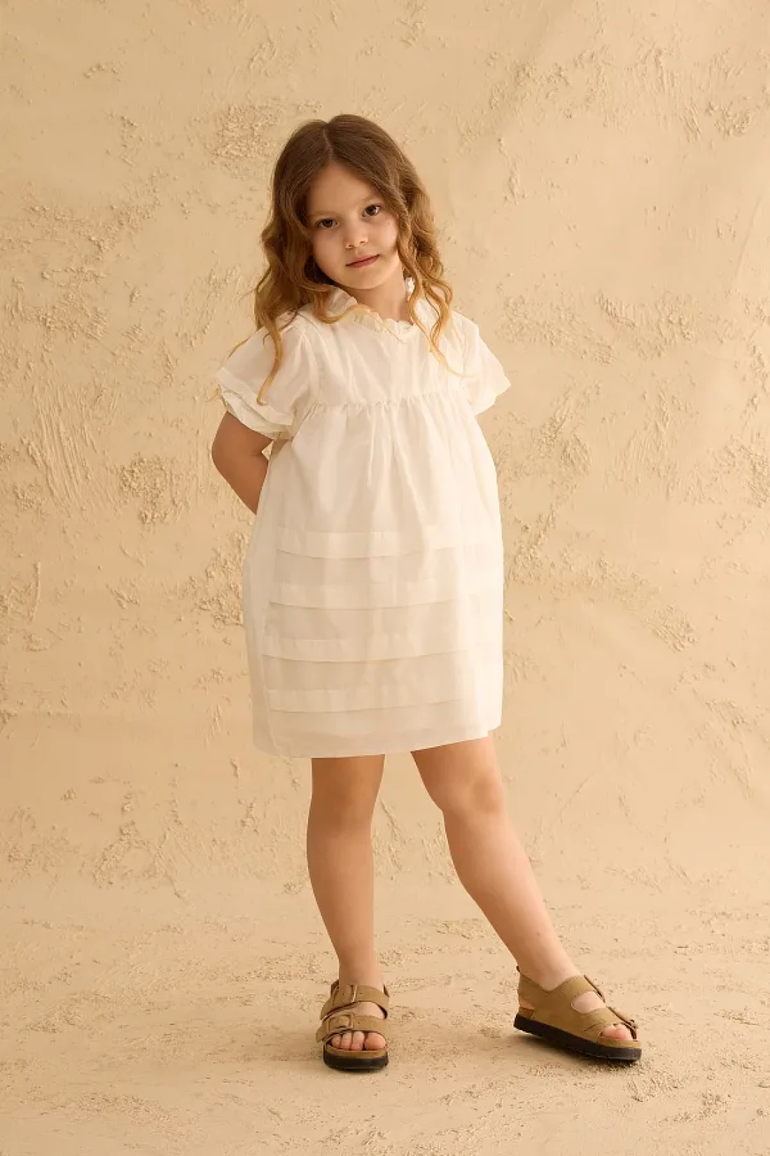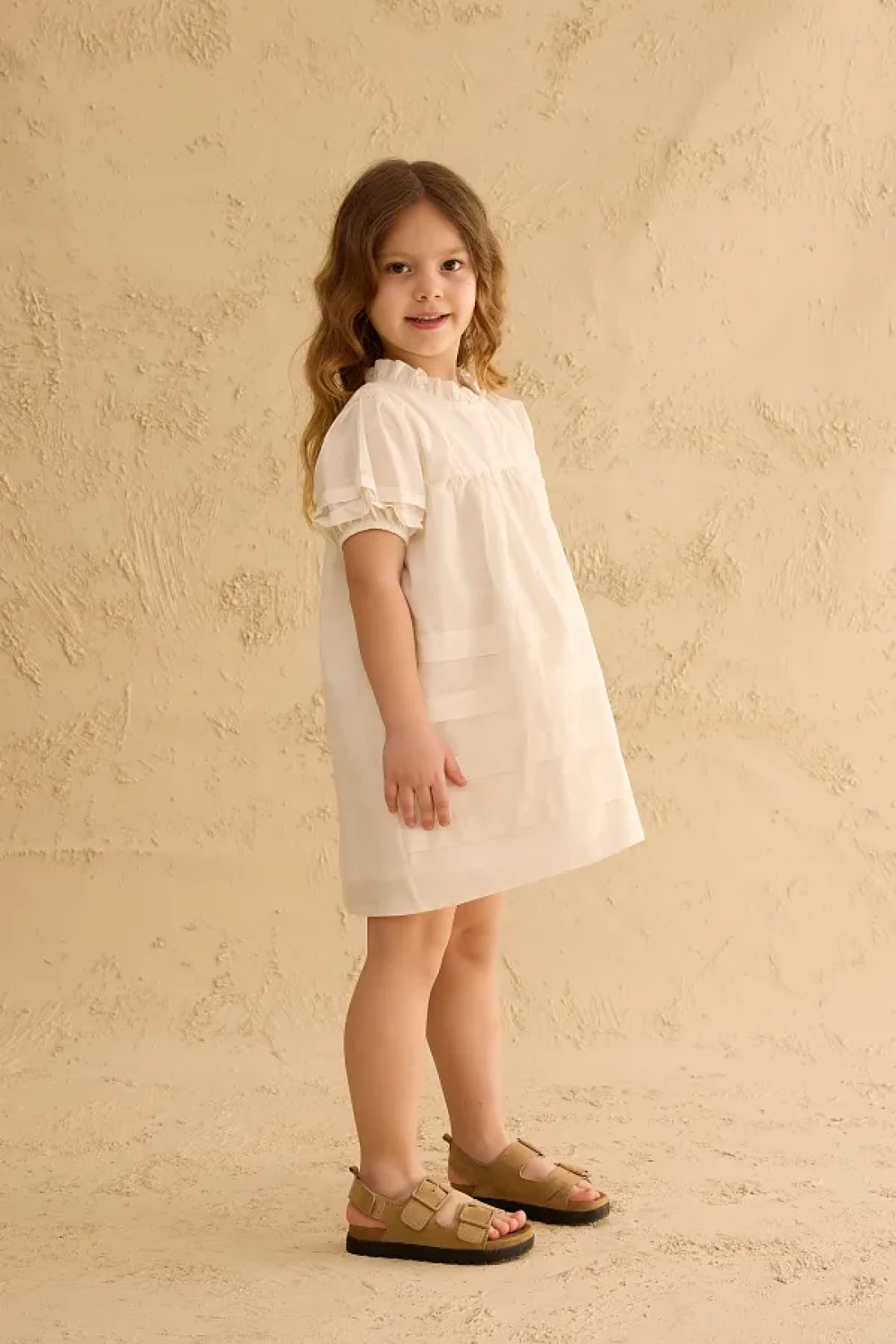 Dress made of 100% cotton voile fabric, with a zippered back closure, ruffled collar, and ribbed detail.