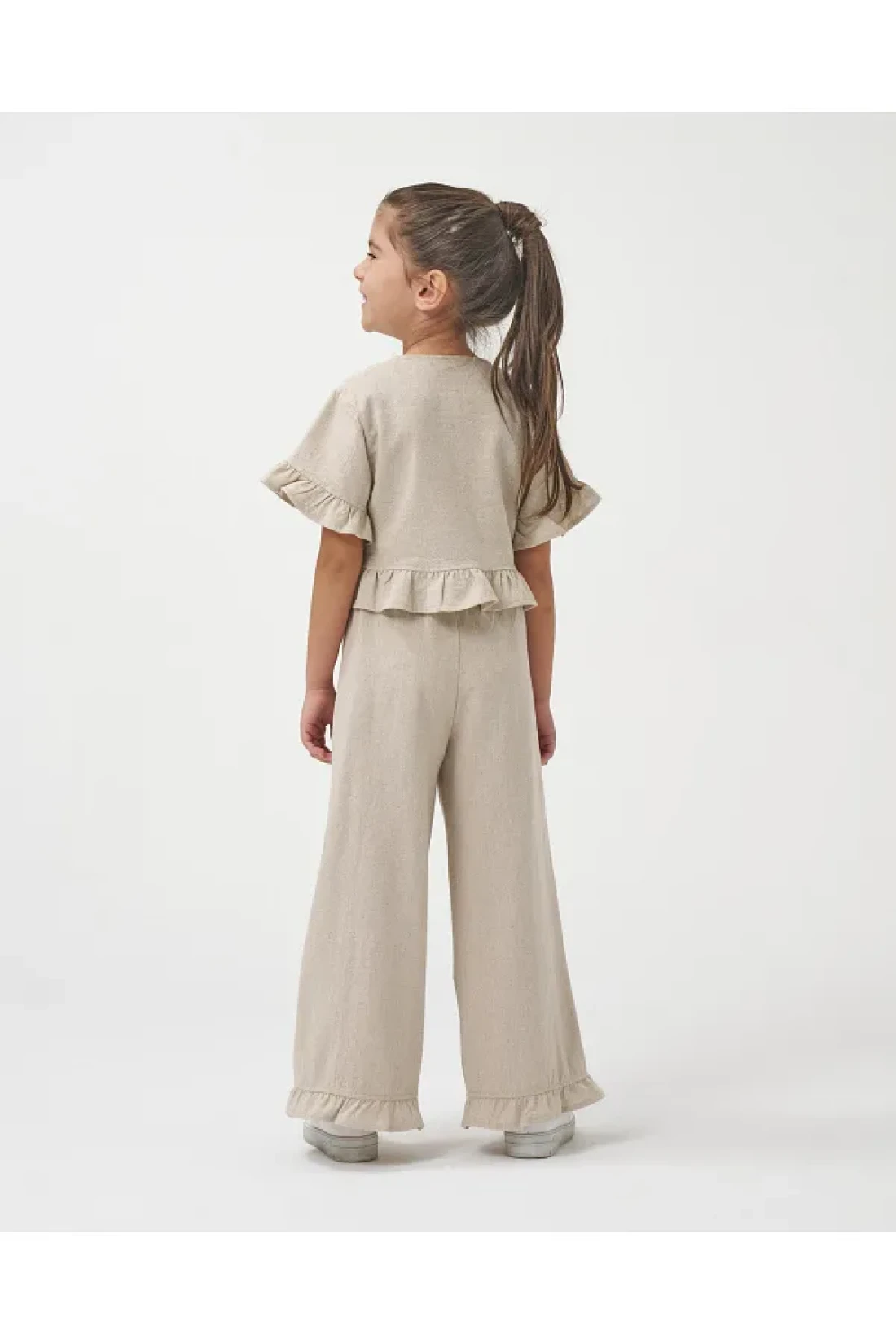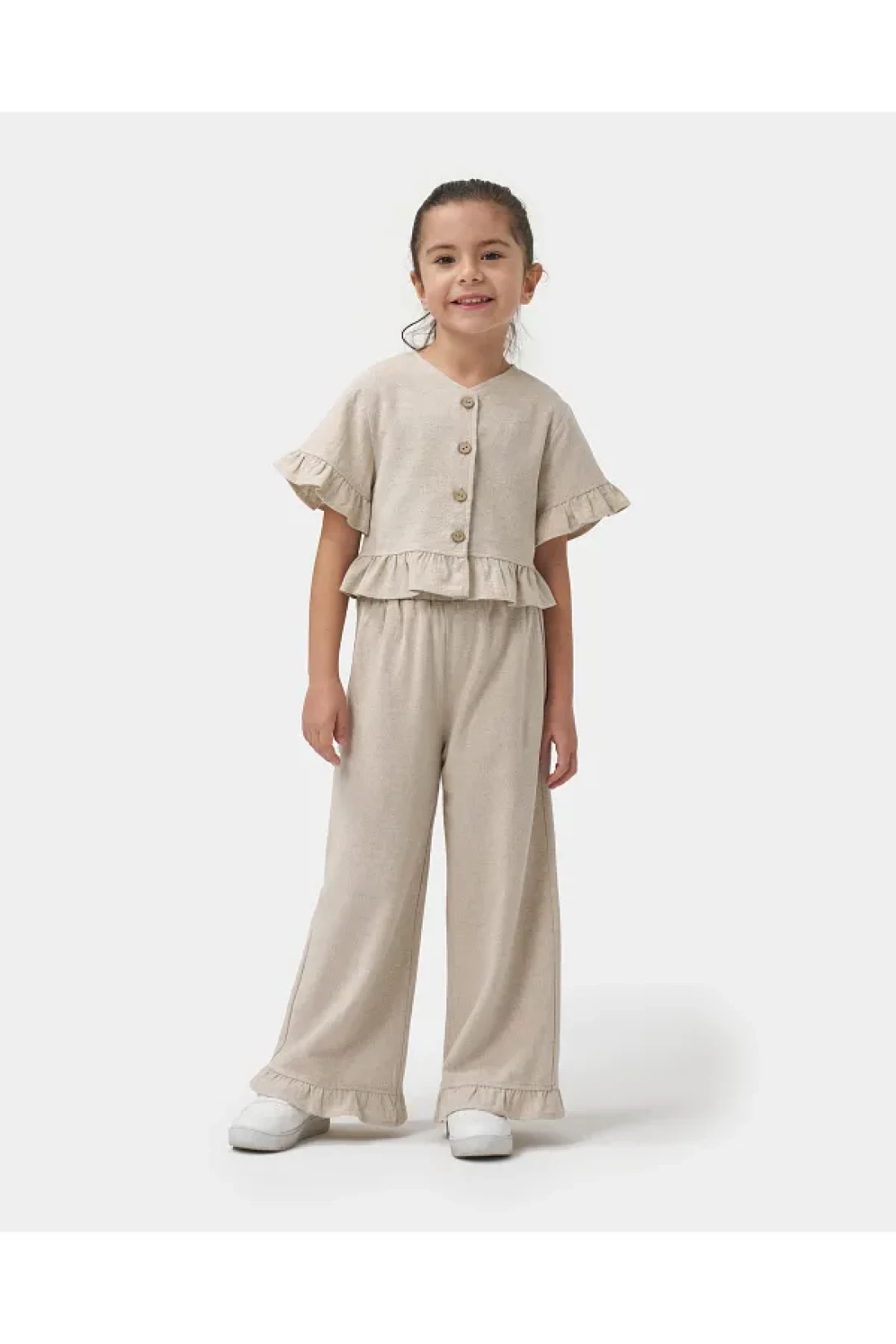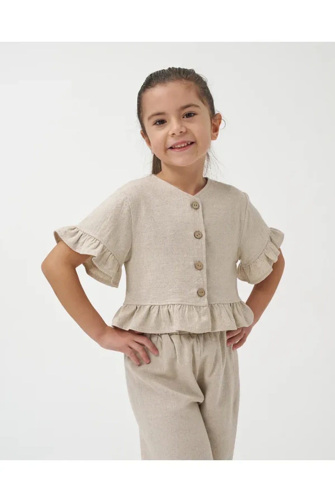 With its 100% linen fabric, it has a natural and light structure. it offers a modern elegance with its front buttoned top design. it has a sweet appearance with elegant ruffle decorations. it offers comfort in daily use. this girl's clothing product, which will be the favorite of summer combinations, will highlight your little girl's elegance both in daily outings and special events with this special design girl's double set. A great choice for little ones who don't want to compromise their style during the summer season!