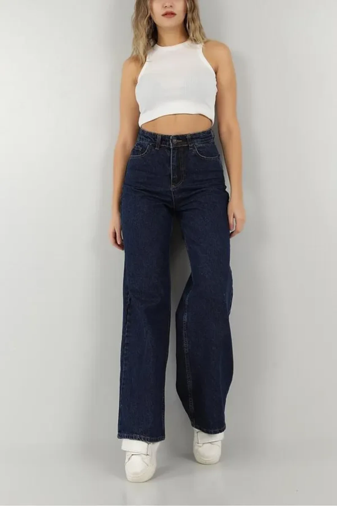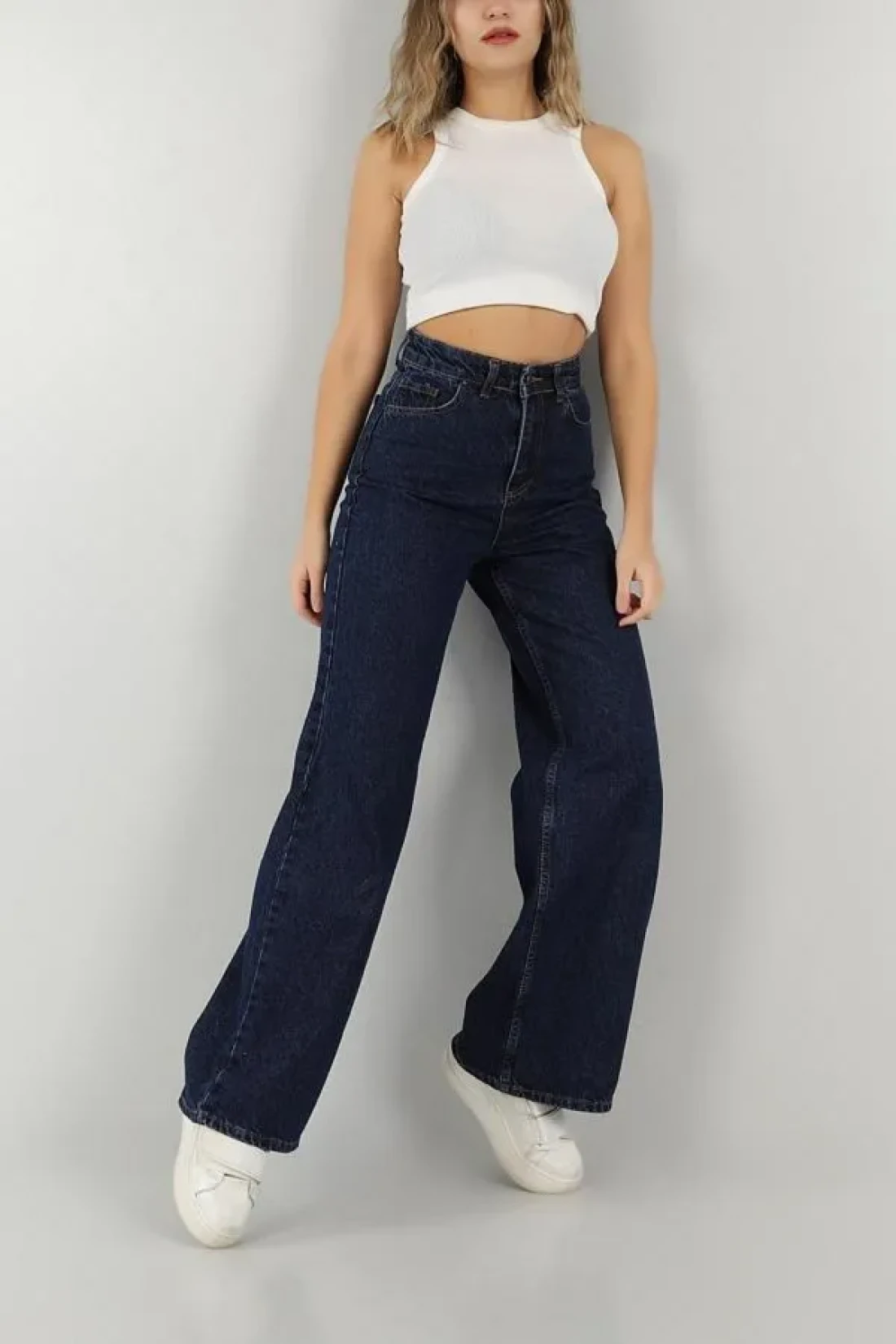 From the drc trend collection, navy blue flat super high waist loose Stretch Fabric jeans. extra high waist loose leg model measurements: height: 170 cm waist: 61 cm chest: 88 cm hip: 89 cm. the product size on the model is for jeans, waist: 36, height: 32. other products are available in s size. Dark blue palazzo, navy blue loose leg palazzo jeans