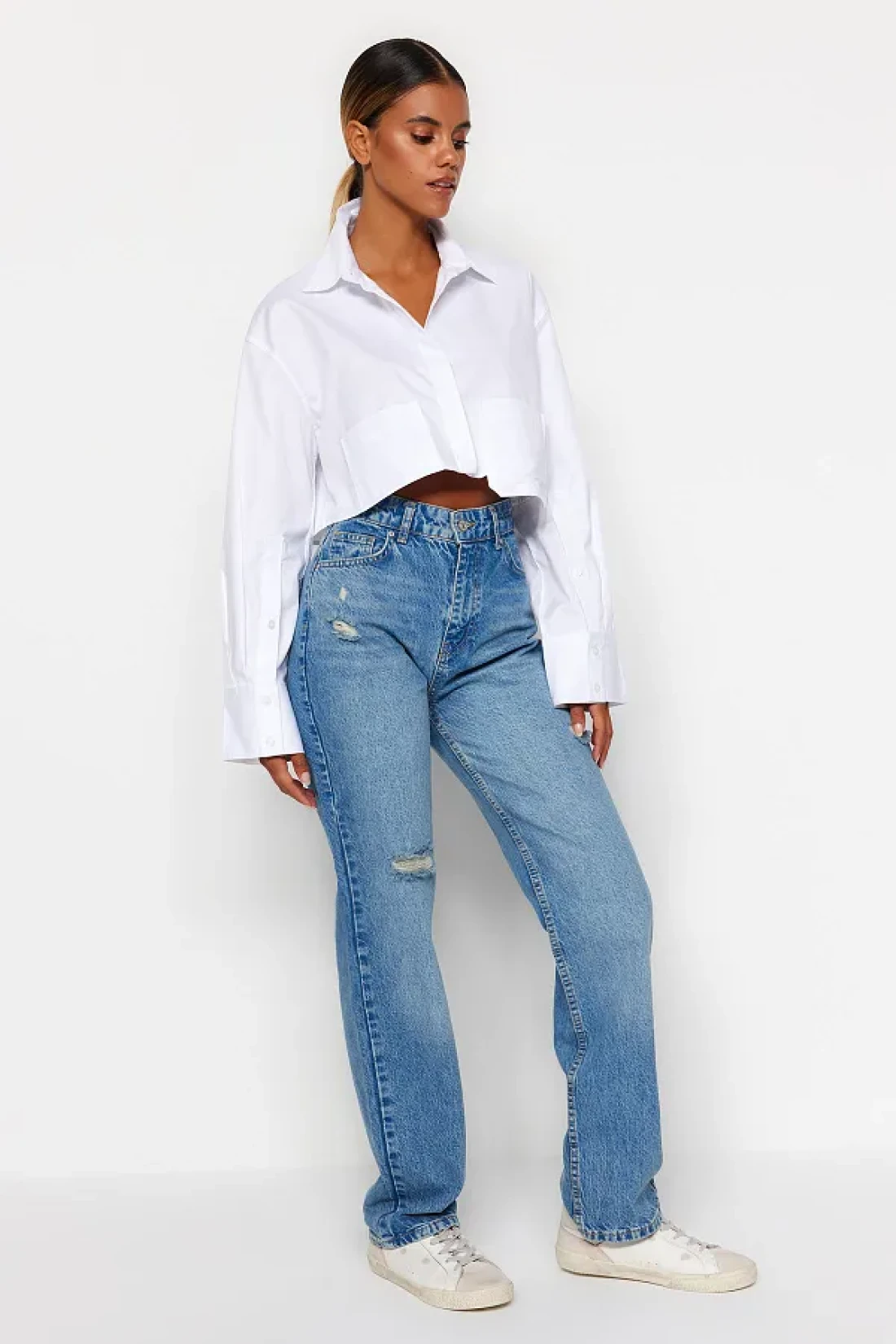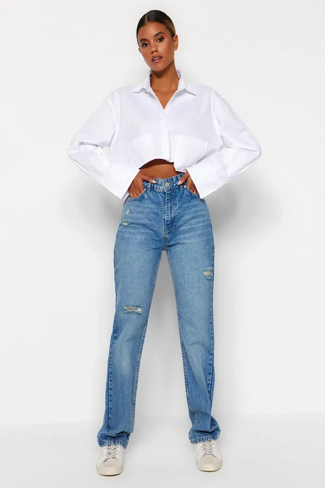 Collection Blue Ripped High Waist Long Straight Jeans TWOAW24JE00033
