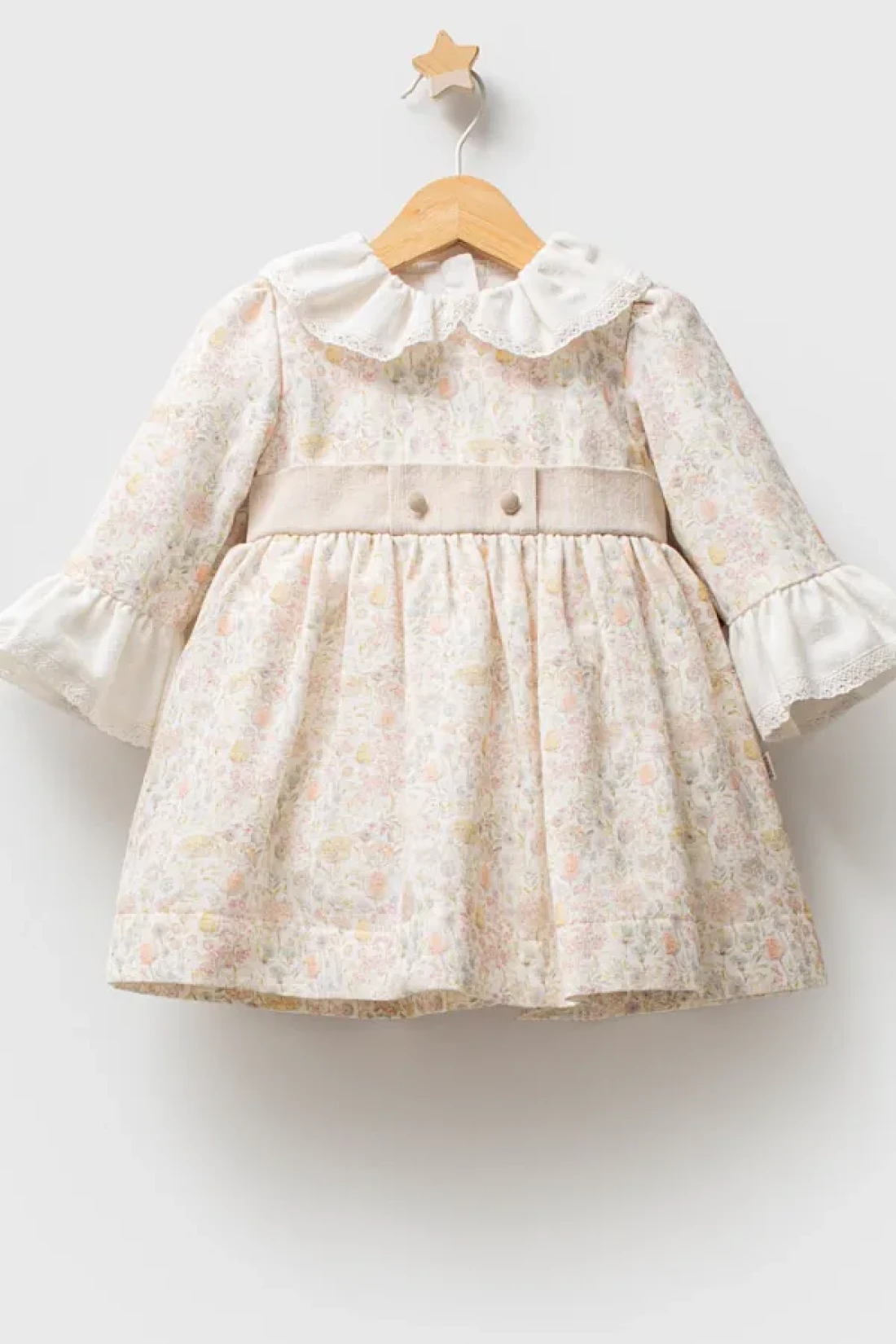 Designed specifically for baby girls, this dress features an eye-catching design with an elegant beige tone and detailed craftsmanship.