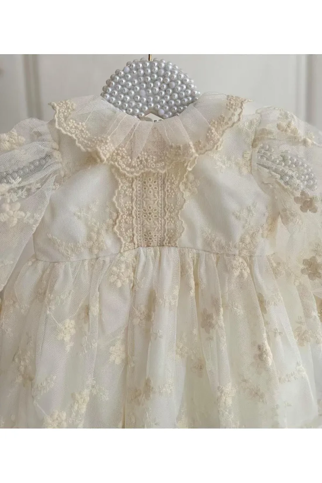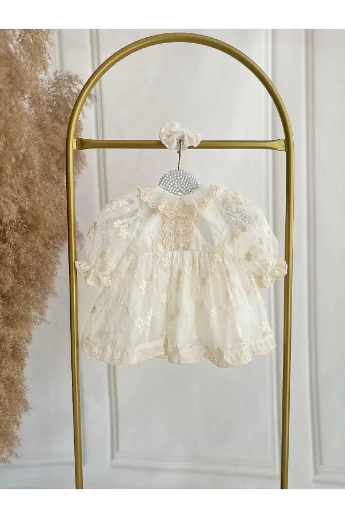 The baby dress, which emphasizes elegance and grace with its cream color, is ideal for any special occasion or daily use. It is designed to adapt to the growth periods of babies with the option of choosing a 1-year-old size. With its regular silhouette and long-sleeved design, it fits your baby perfectly without restricting their freedom of movement.