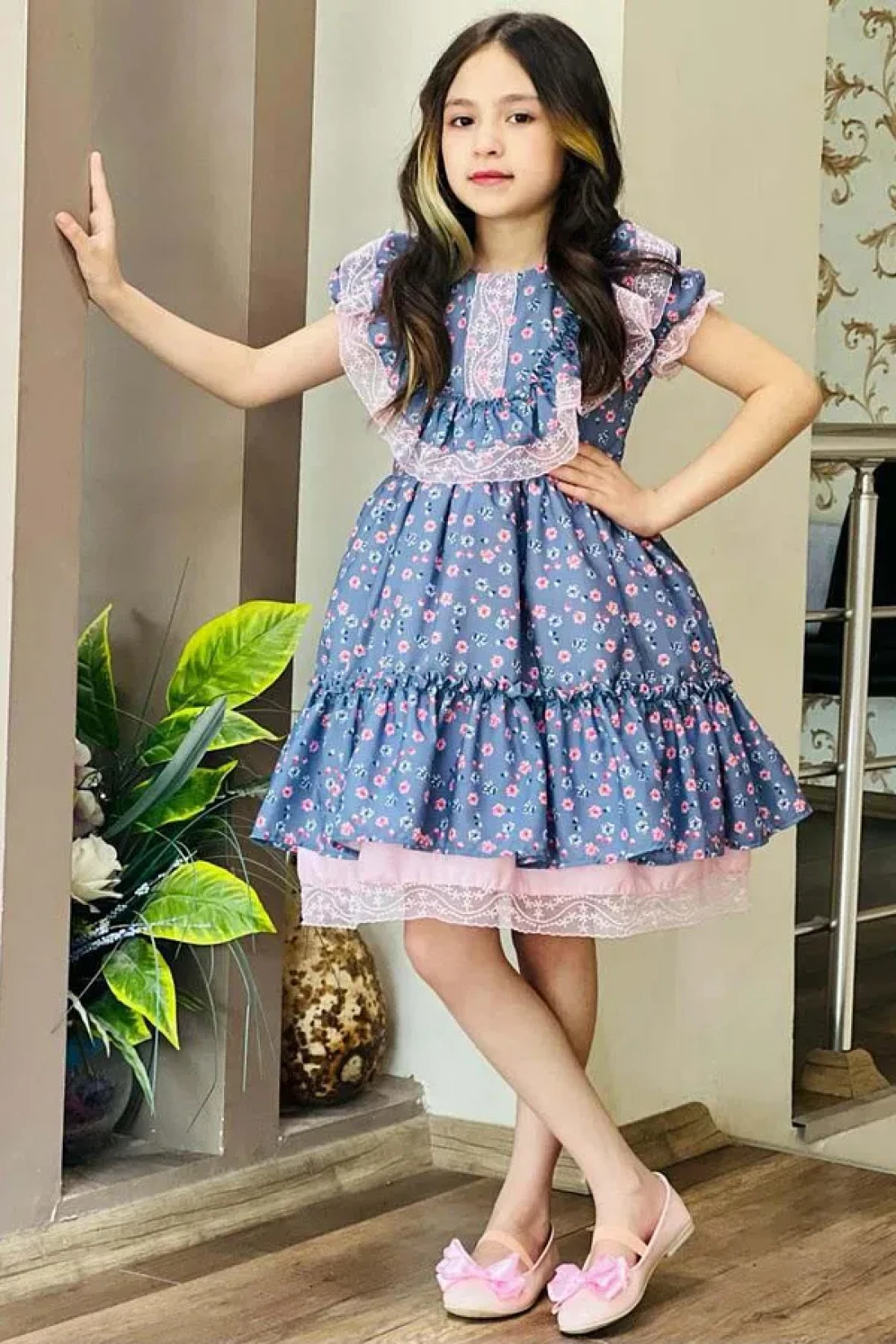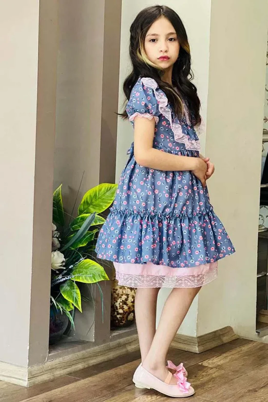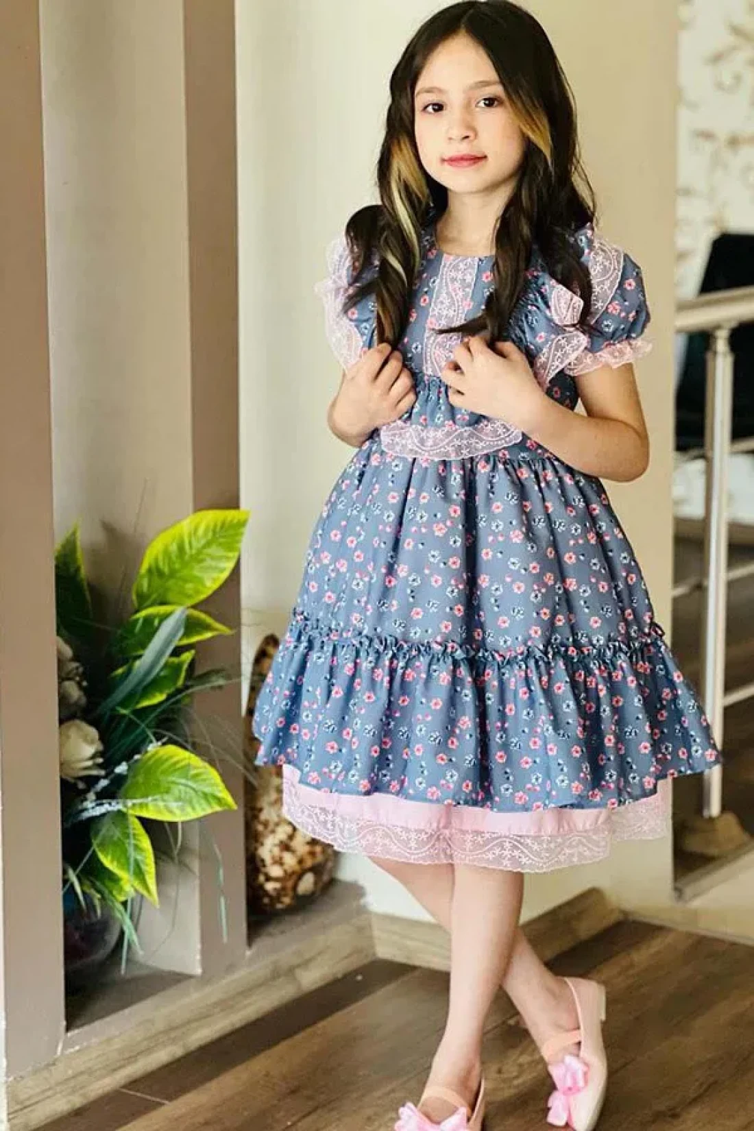 Girl's Chest and Shoulders Ruffle Lace Embroidered Dress with Floral DetailProduct information: 90% cotton, floral patterned dress with ruffle detail on the chest, balloon sleeves, pleated ruffle skirt.