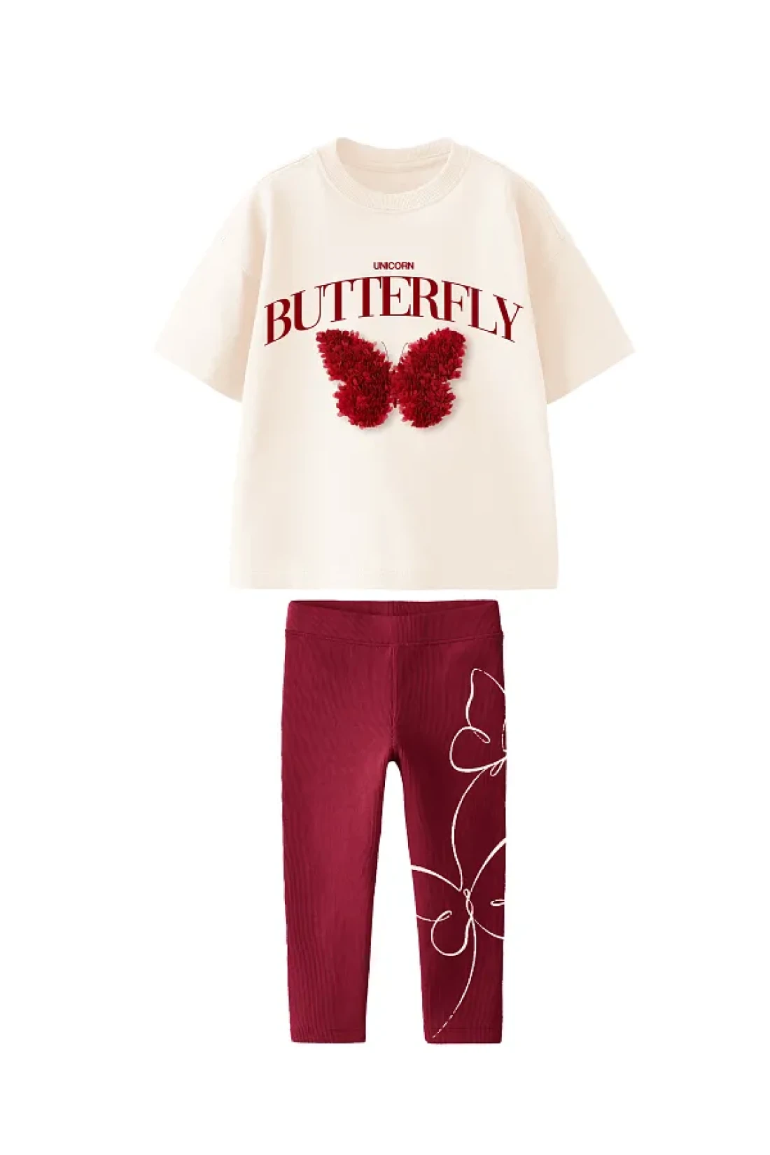 - a t-shirt and leggings bottom set, designed specifically for girls, made of cotton fabric. It offers an eye-catching appearance with its 3d butterfly embroidery details. Thanks to its elastic waist design, it provides comfortable use and fits perfectly on the body. The set, consisting of two pieces, offers both elegance and comfort together. It provides an economical and practical shopping experience with its 2-pack content.