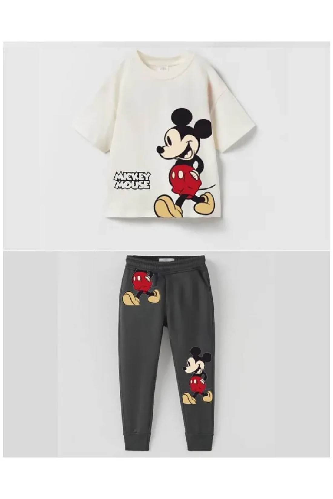 Drawing attention with the harmonious tones of beige and anthracite colors, the summer kids' suit offers a fun style with Mickey Mouse print.