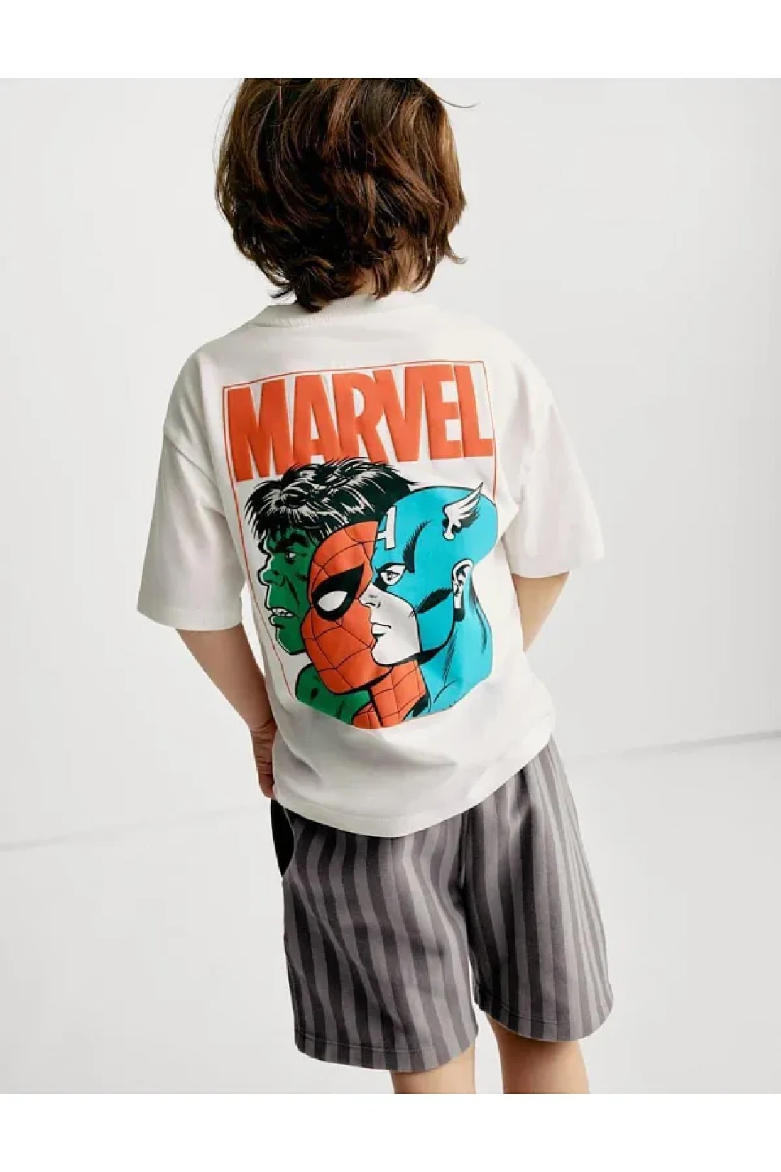 Magu Boys' Marvel Character Printed White T-Shirt and Striped Shorts Set