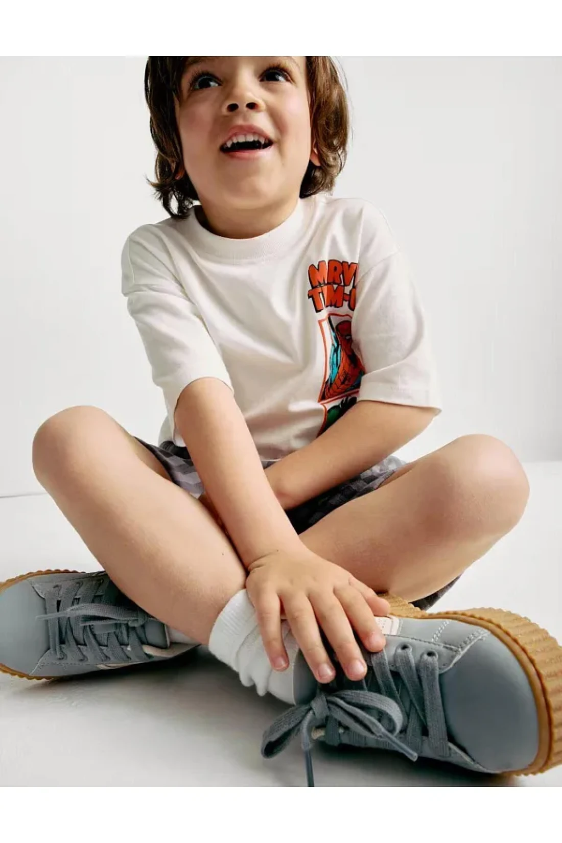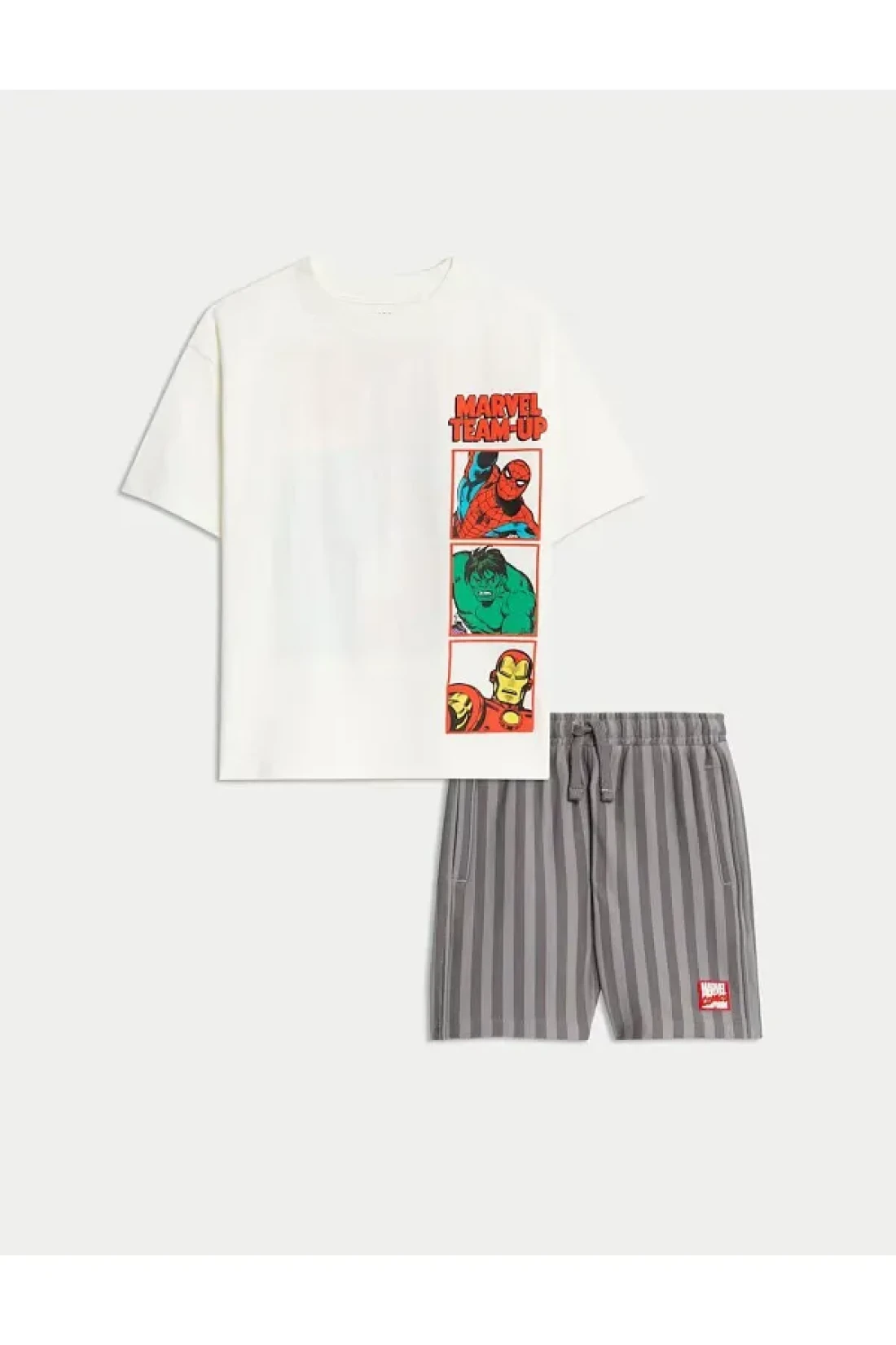 The marvel character Printed white t-shirt and striped shorts set offers an energetic look that will be children's favorite.