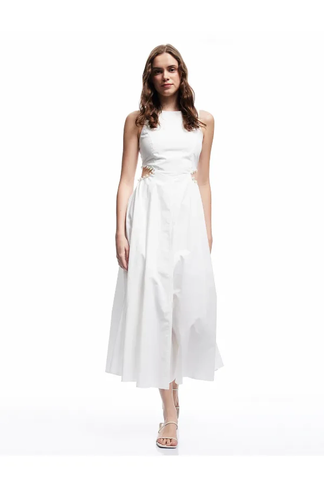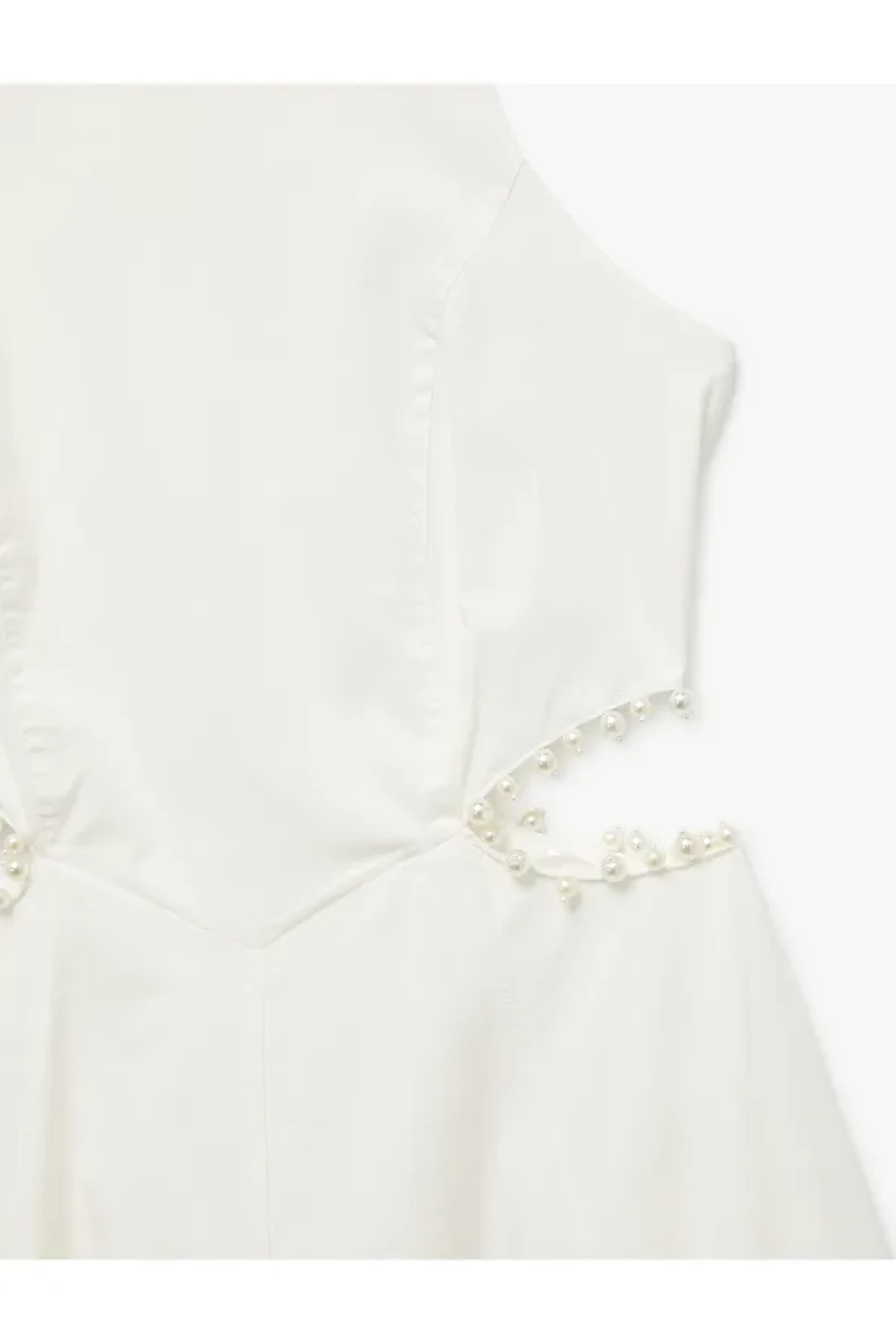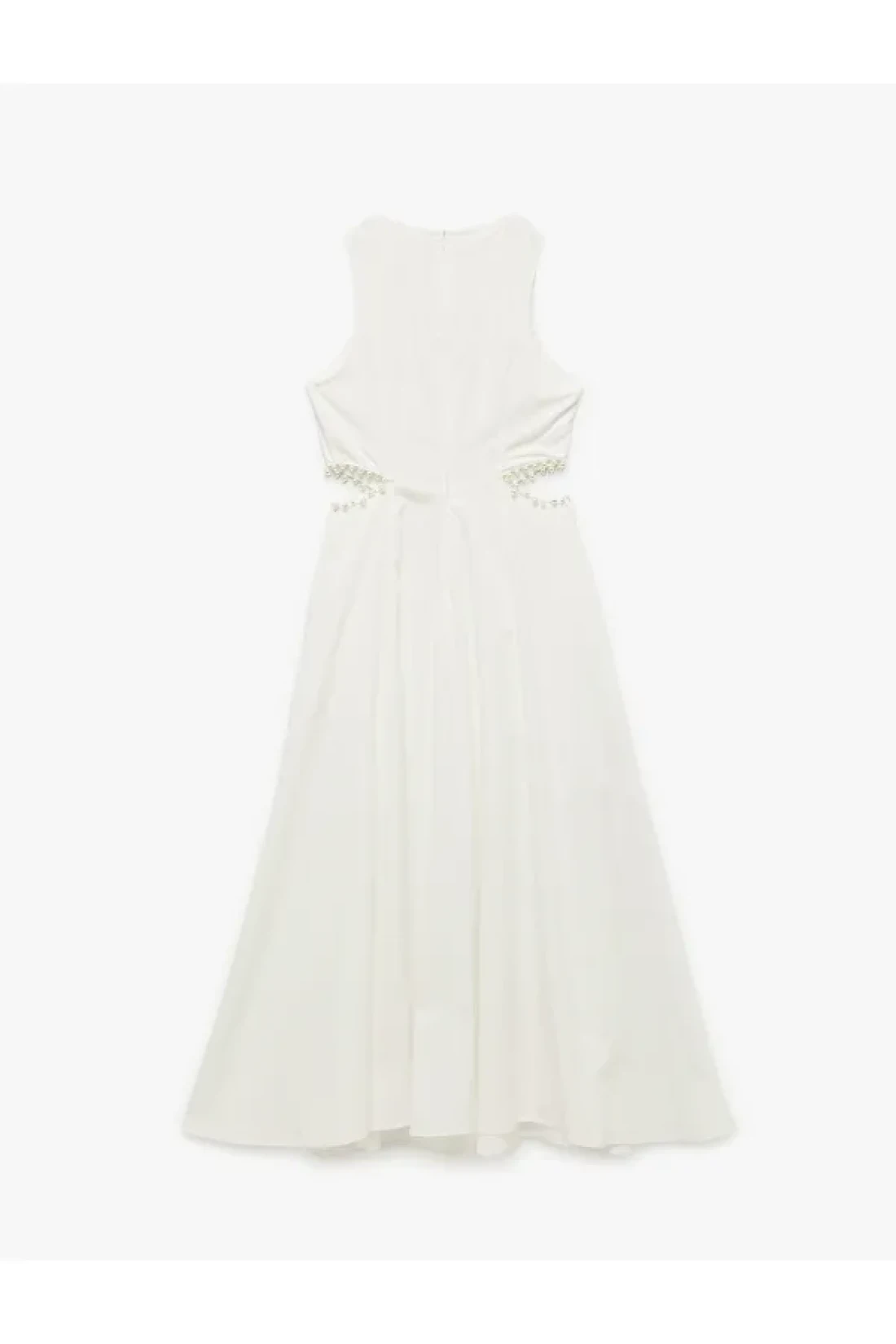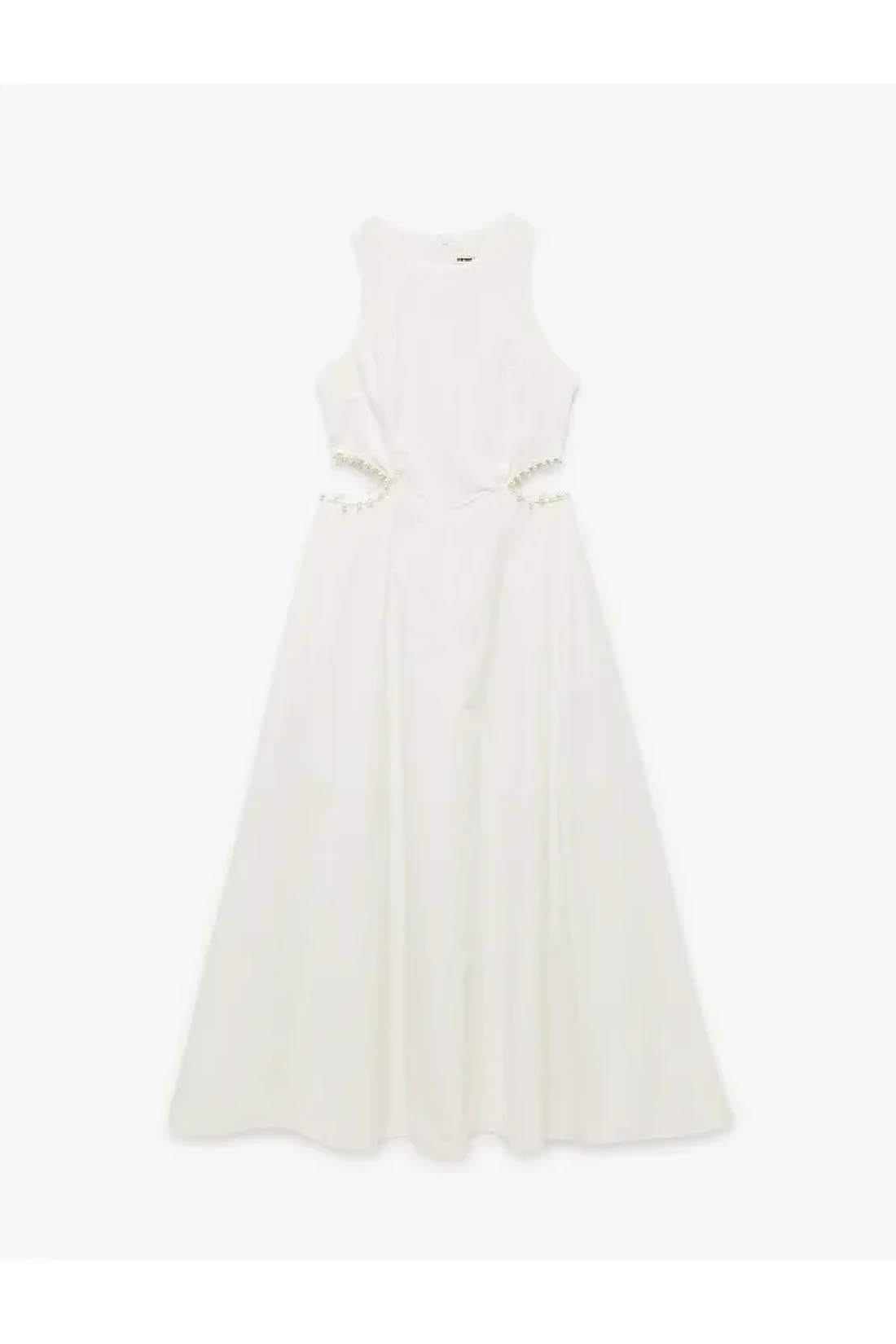 Koton Cotton Lined Crew Neck Window Detail Beaded Sleeveless Midi Dress