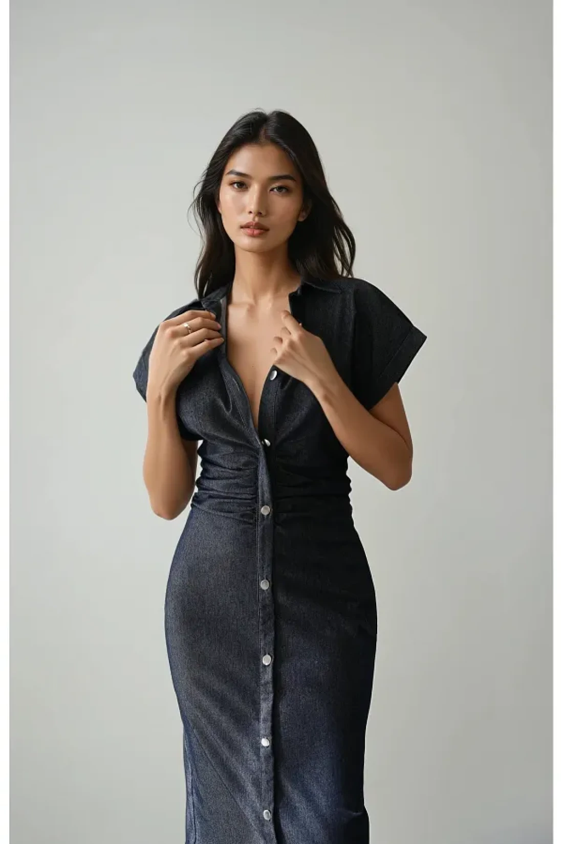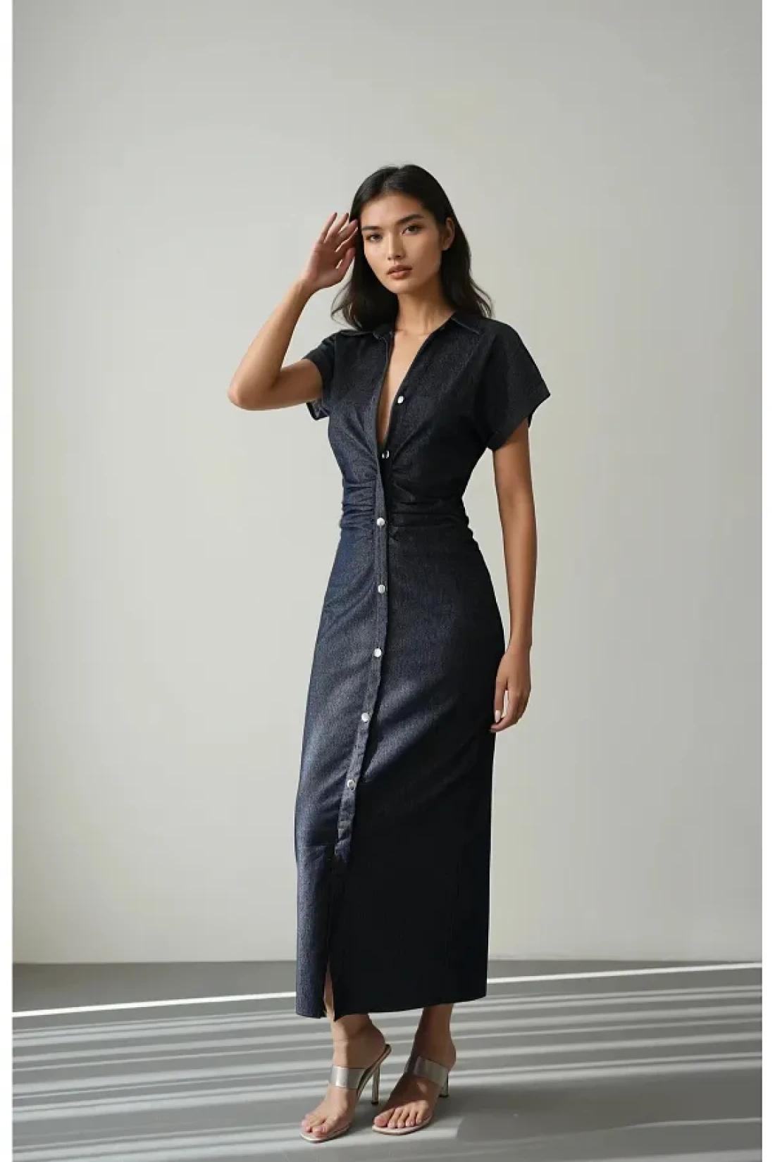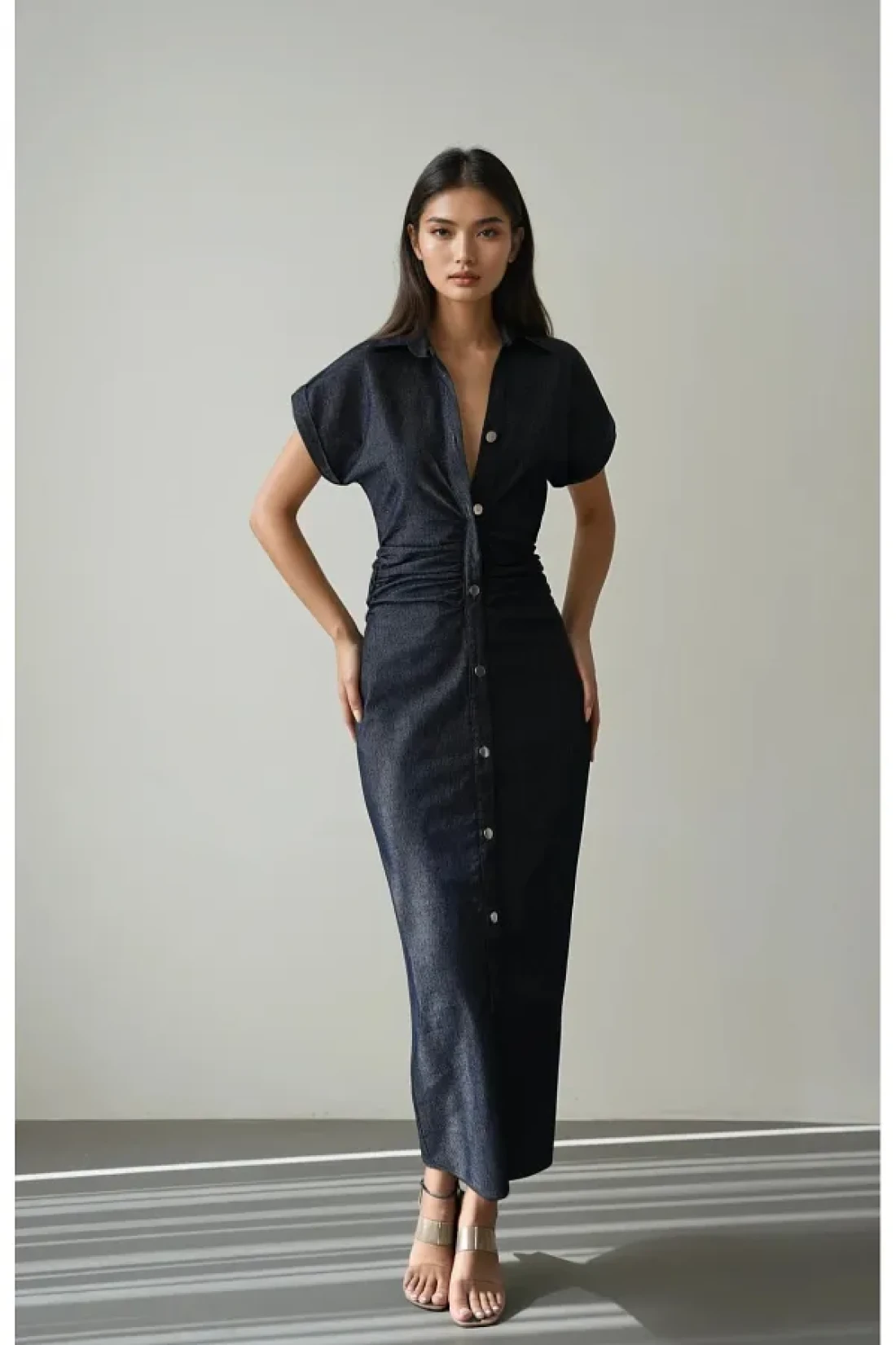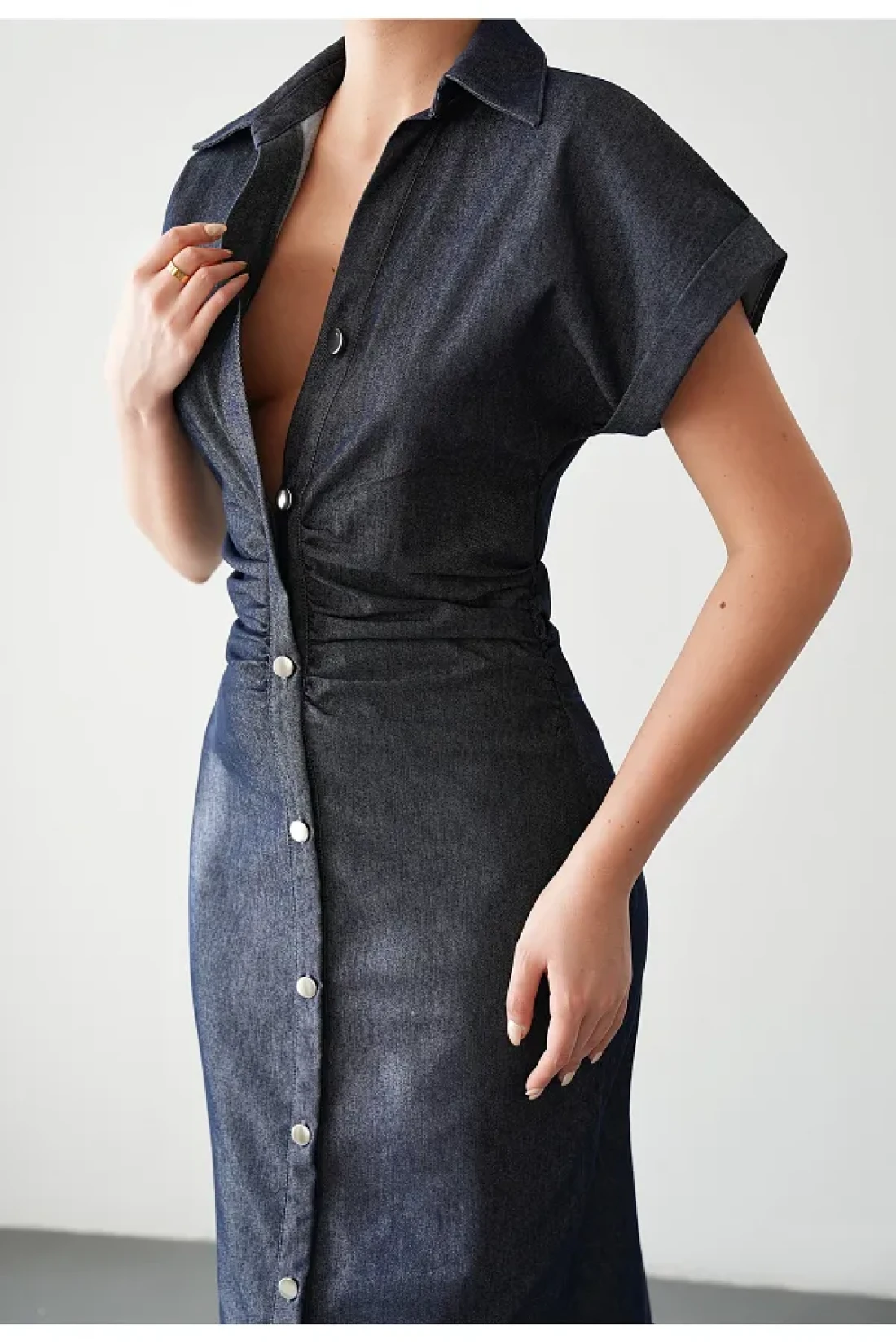 Bak'ap Denim Jeans Shirring Detailed Buttoned Maxi Short Sleeve Long Dress