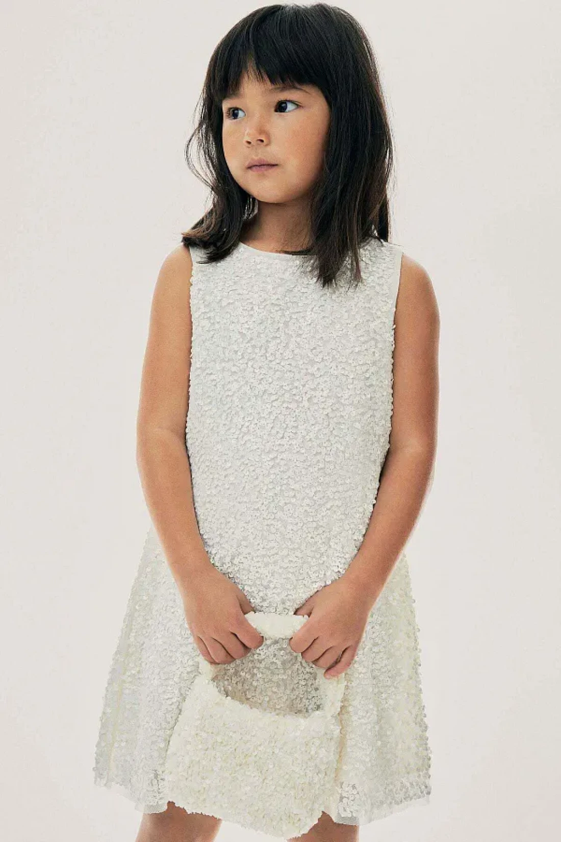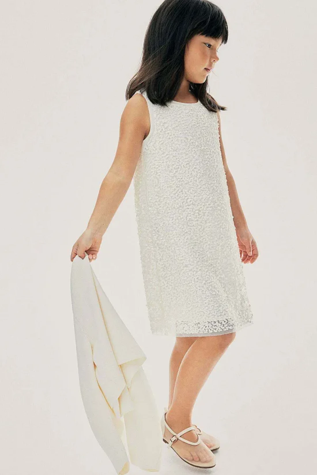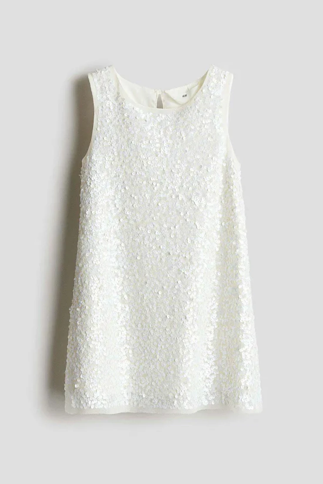 A-line dress in sequined mesh with a round neckline and a keyhole opening with a button at the back.