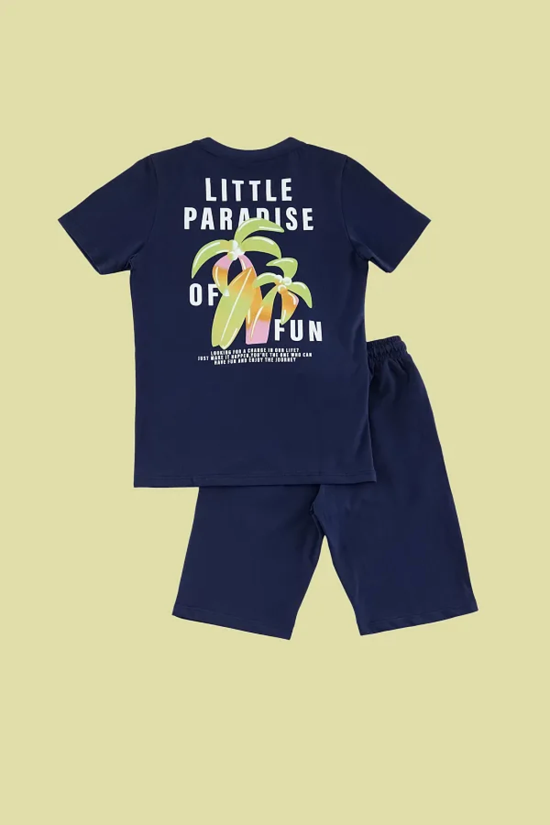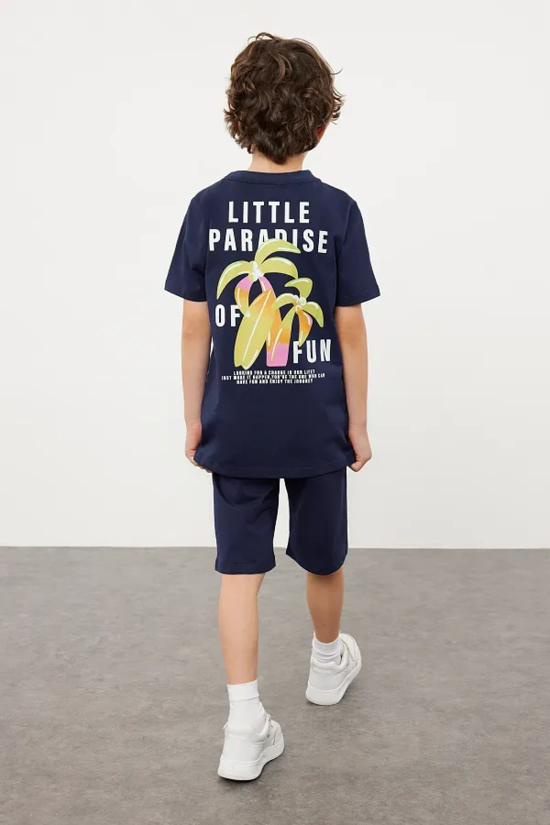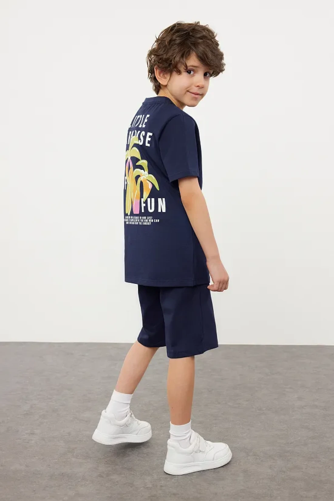 TRENDYOLKIDS Navy Blue Male Child 100% Cotton Tropical Printed Knitted T-Shirt Shorts Bottom-Top Suit Tkdss24Au00005