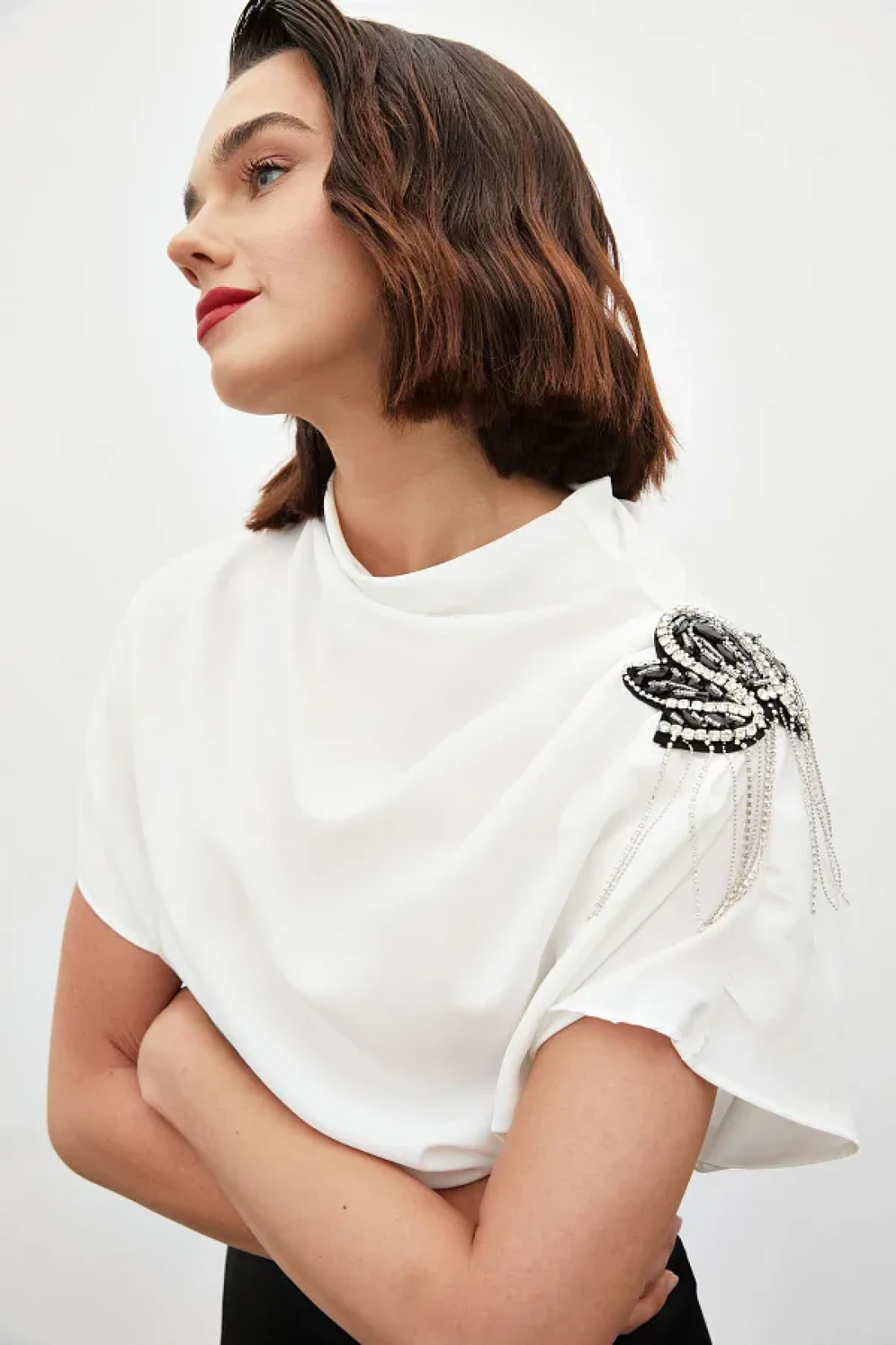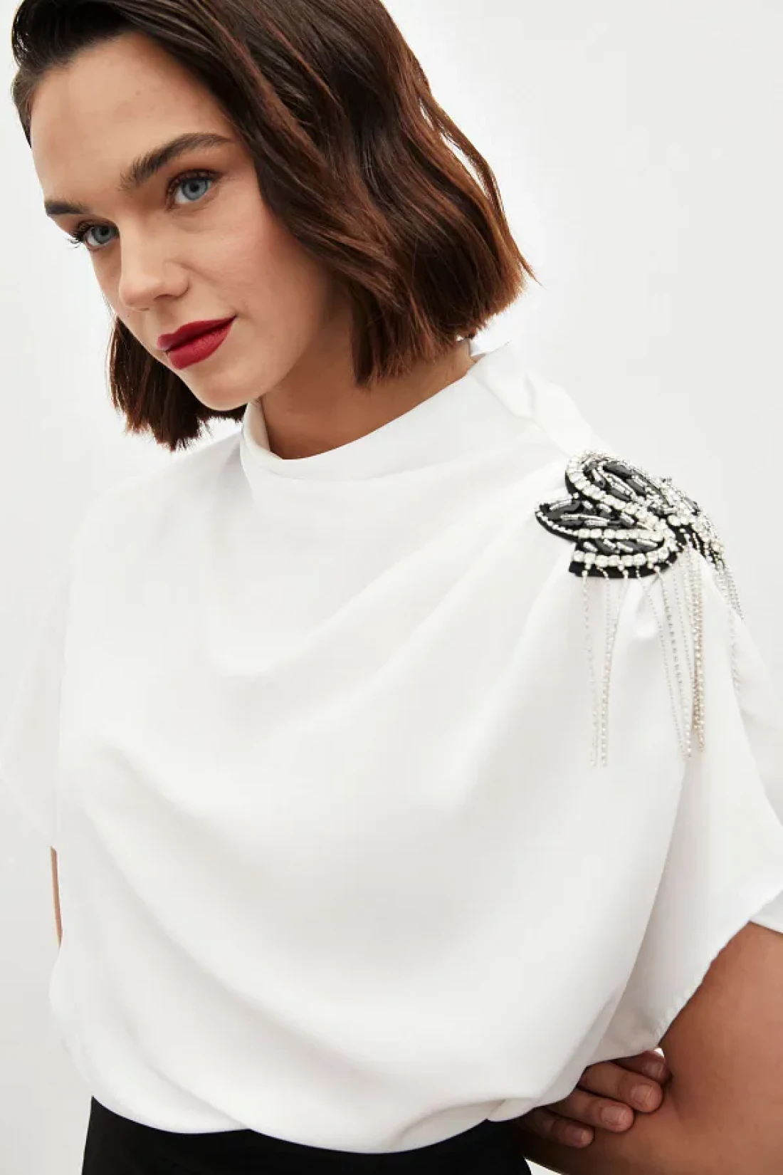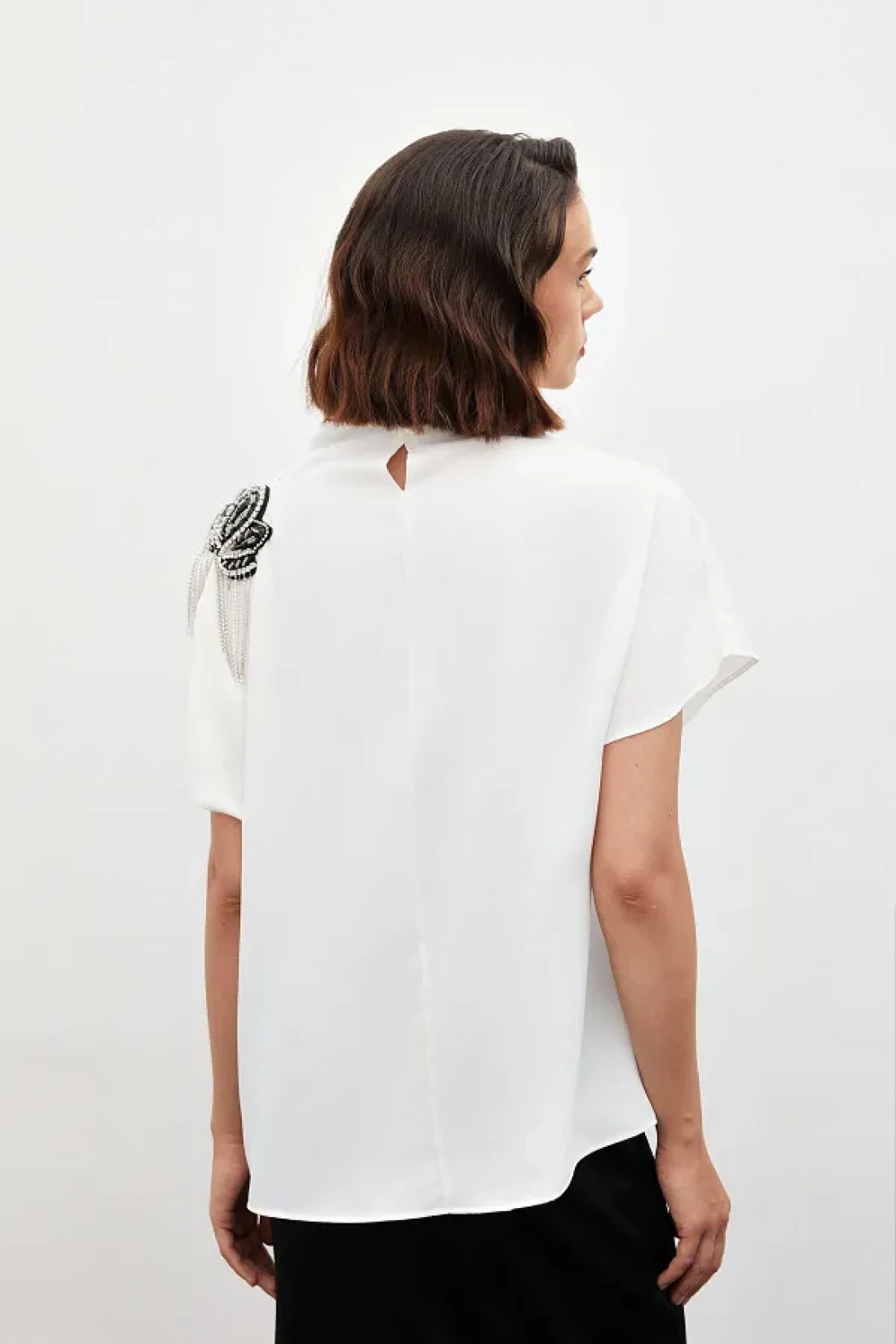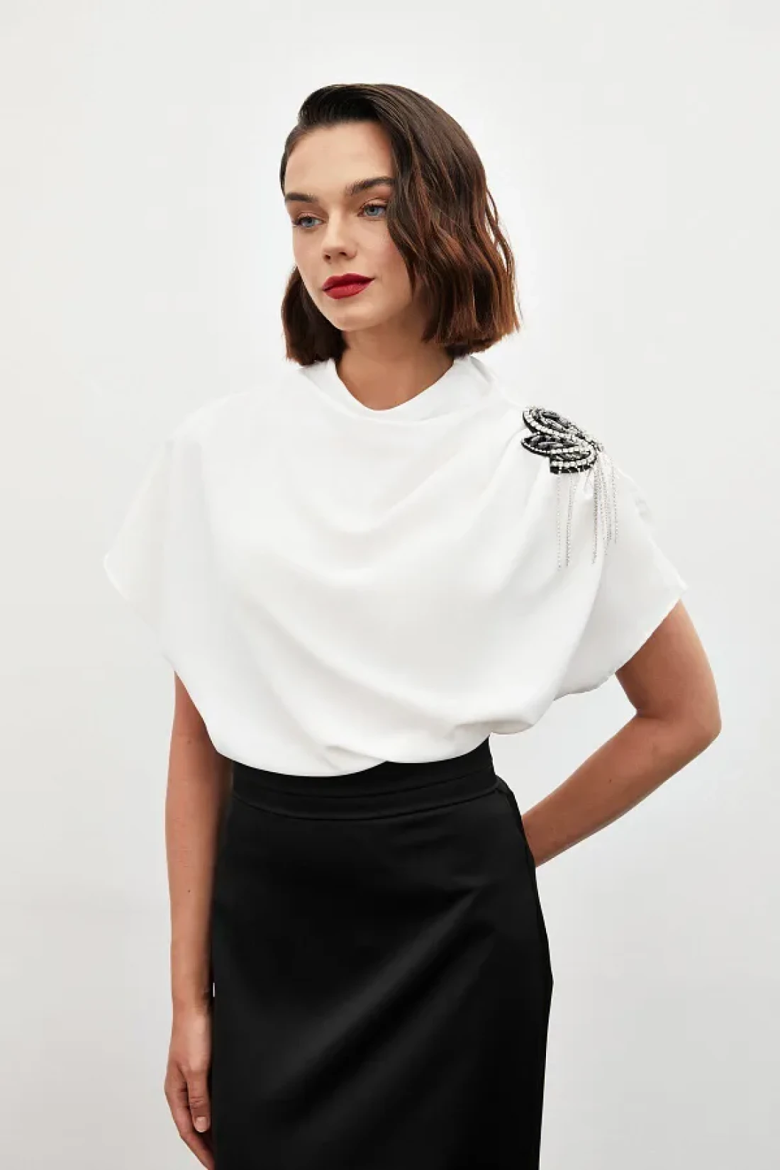 Sateen Casual Blouse with One Shoulder Accessory - Ecru