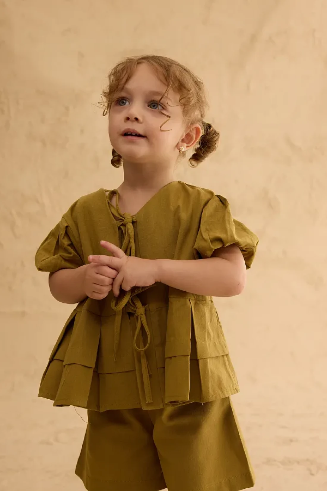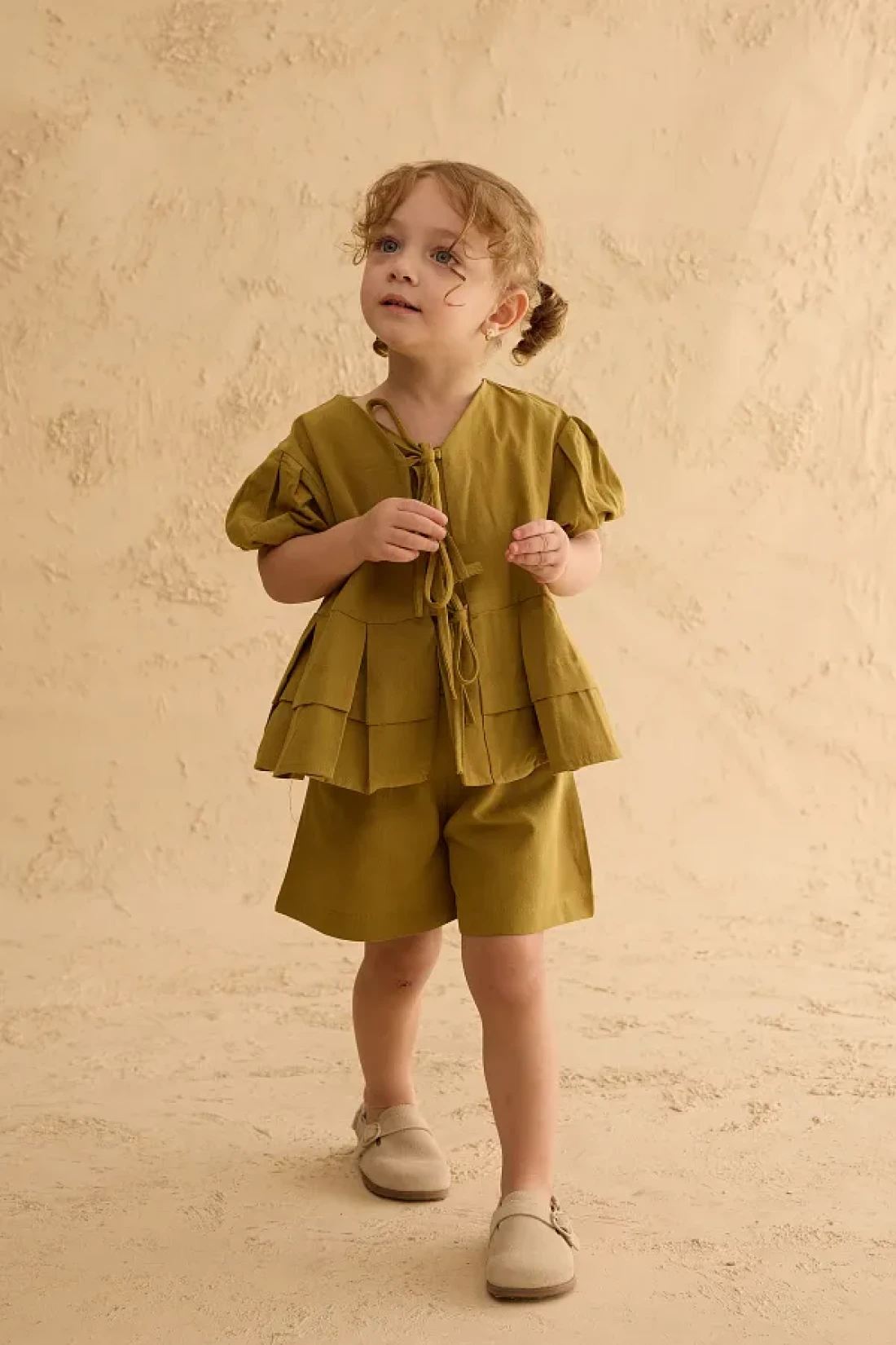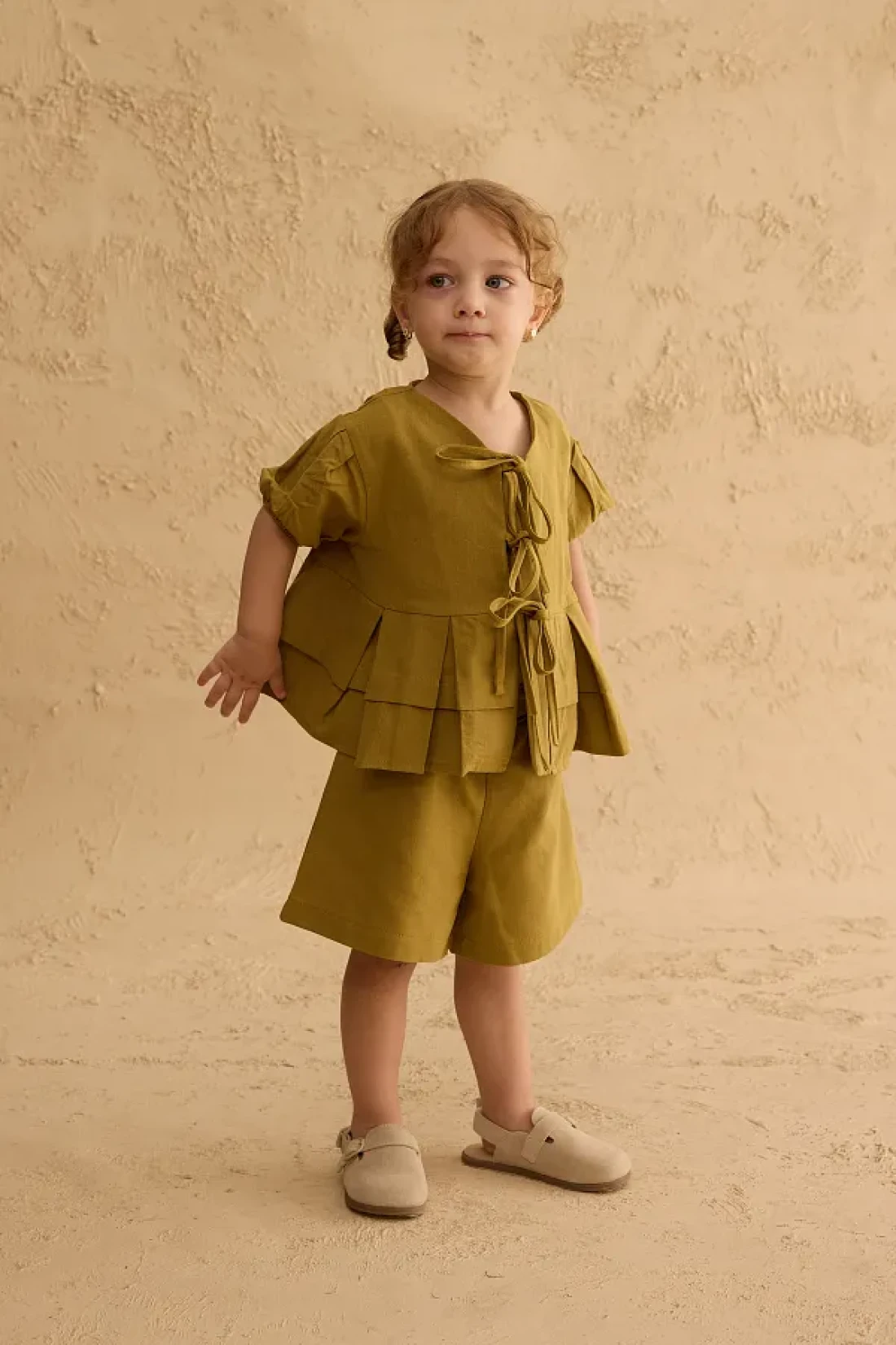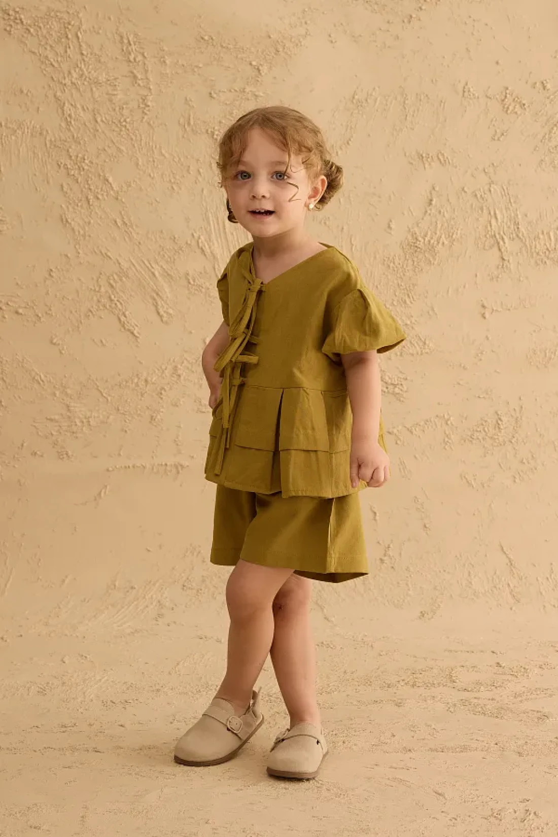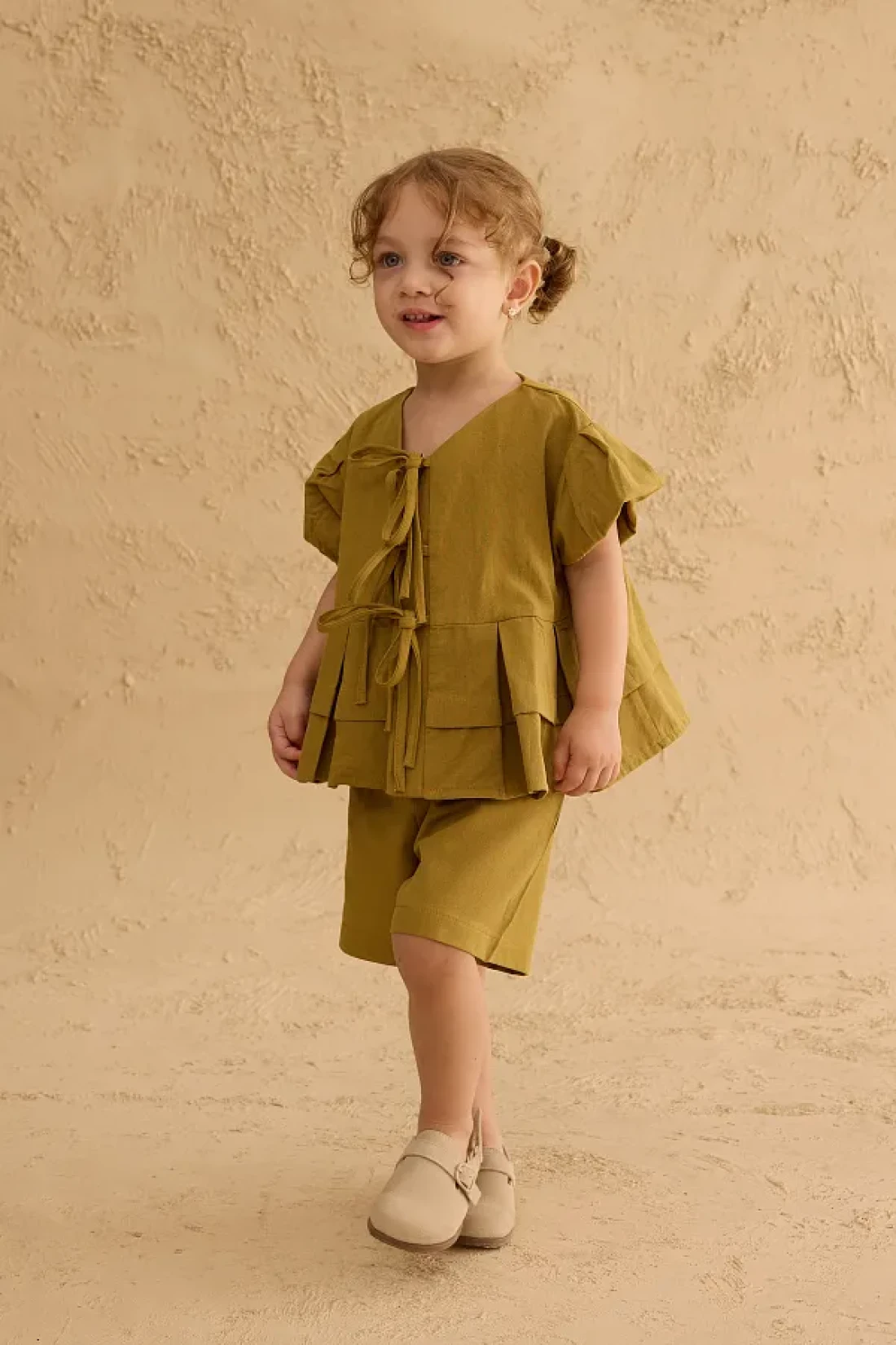 Set with linen blend woven fabric, ribbed front, tie detail, short sleeve top and elastic waistband, pockets, shorts