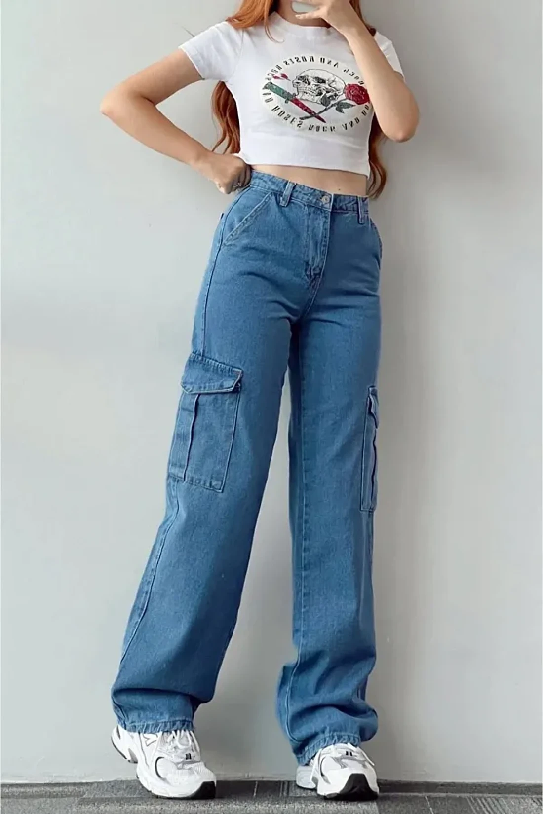 LAMİRA Cargo Pocket Tween Blue Neeko Women's Blue Colorfast Cargo Model Palazzo Trousers