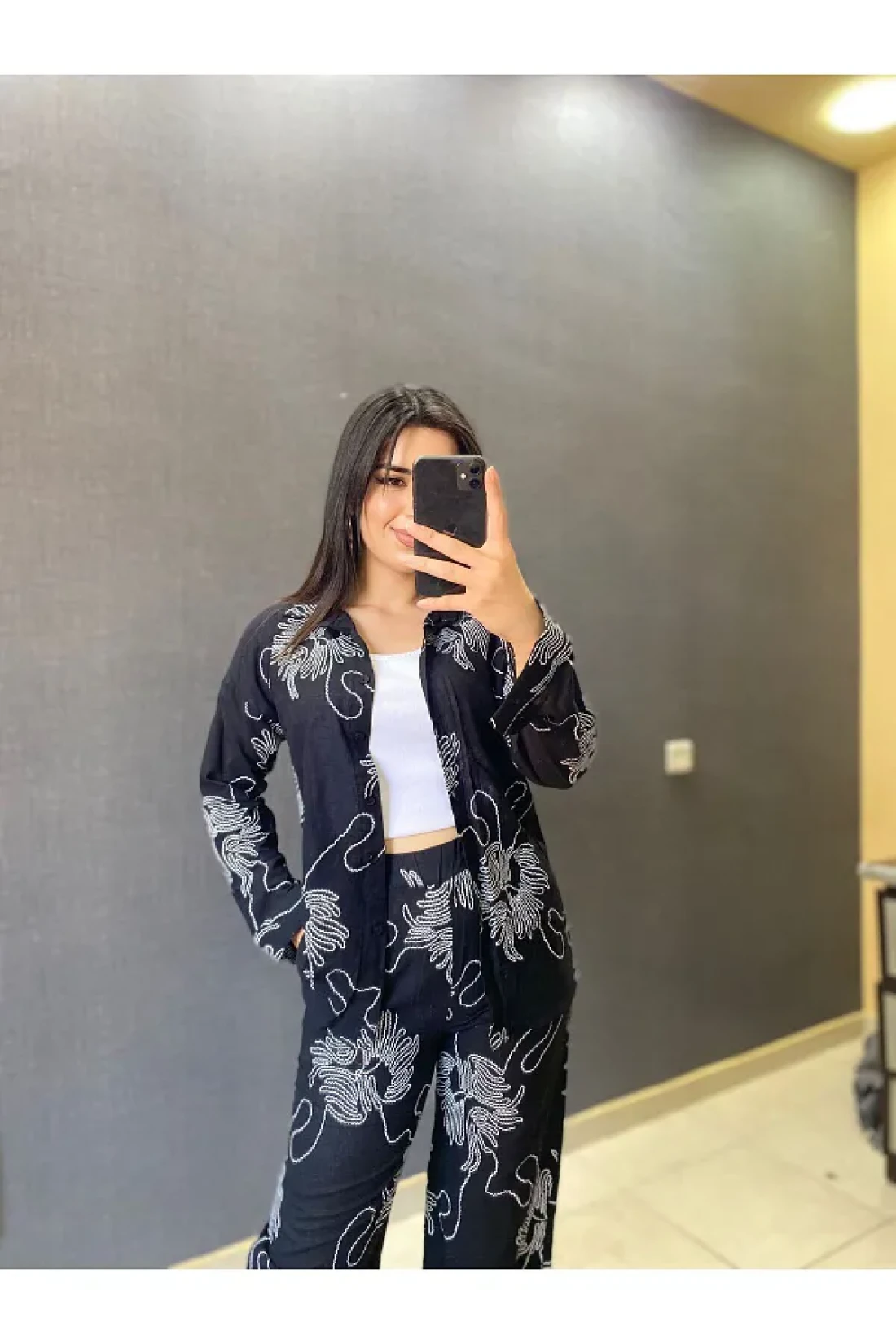 - the two-piece suit stands out with its elegance, suitable for both day and night wear. It offers easy wear and removal with its full button closure feature and provides practical use.