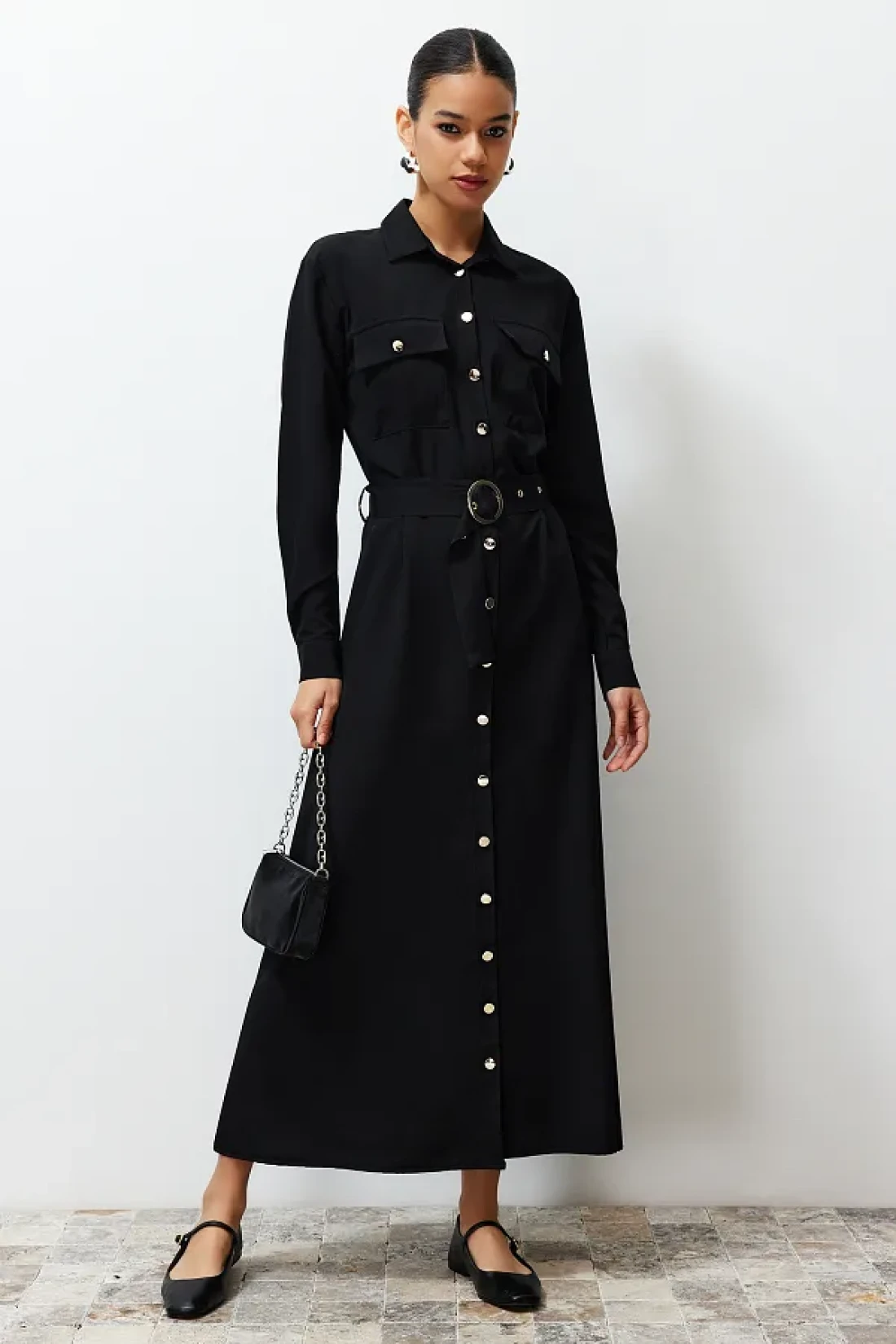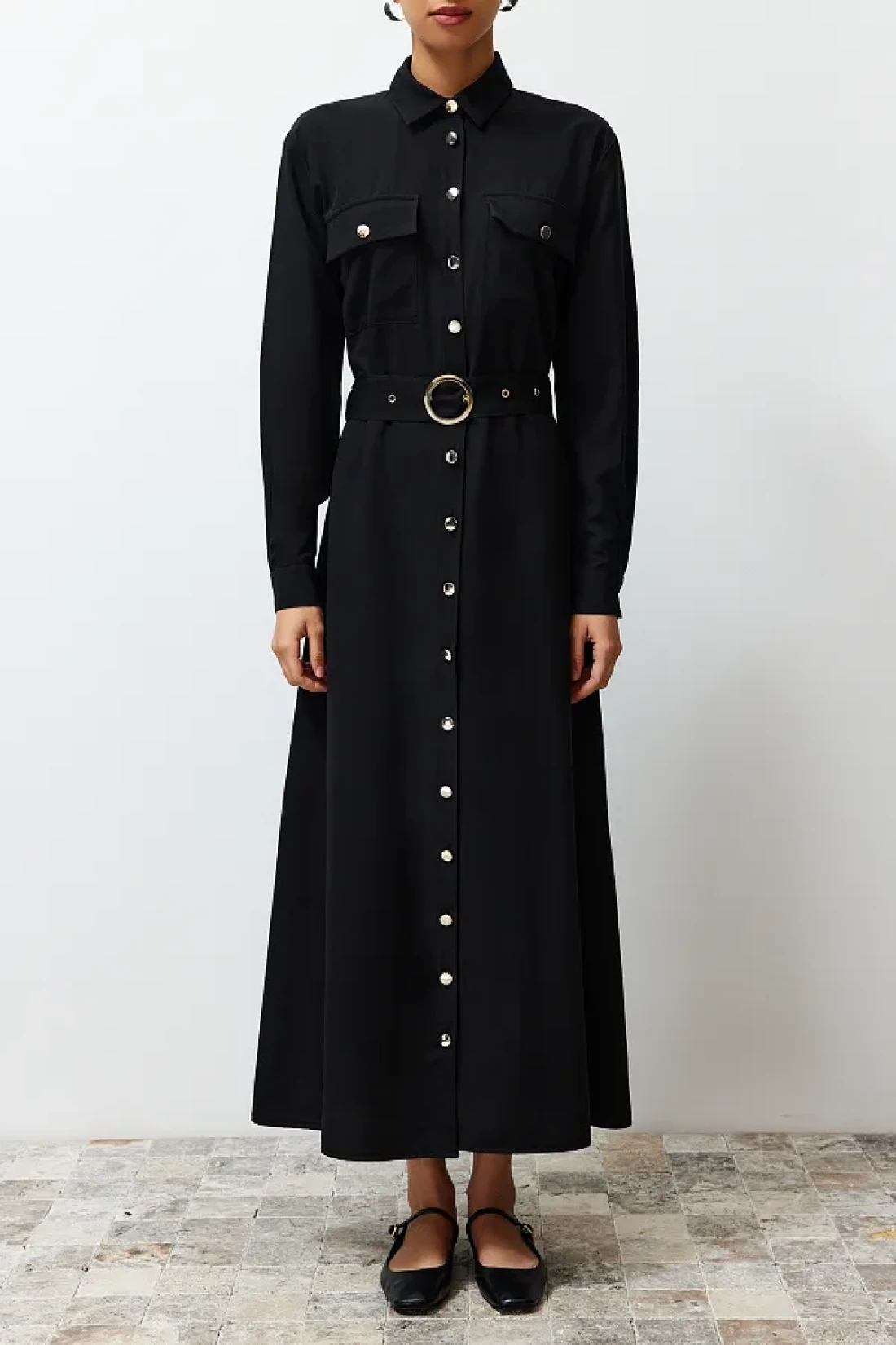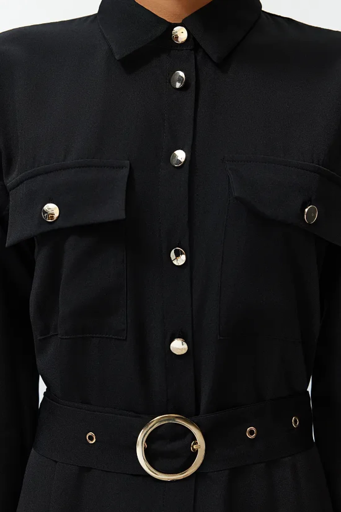 Modest Black Gold Button Detailed Woven Shirt Dress TCTSS24EB00132