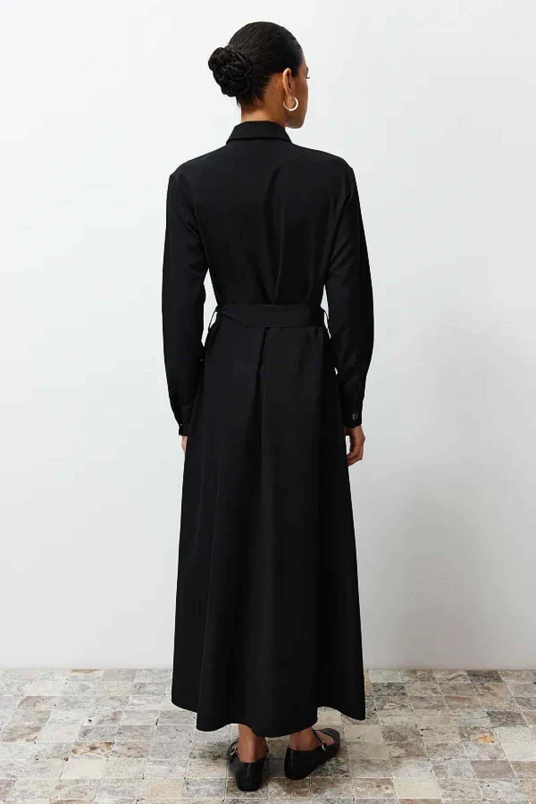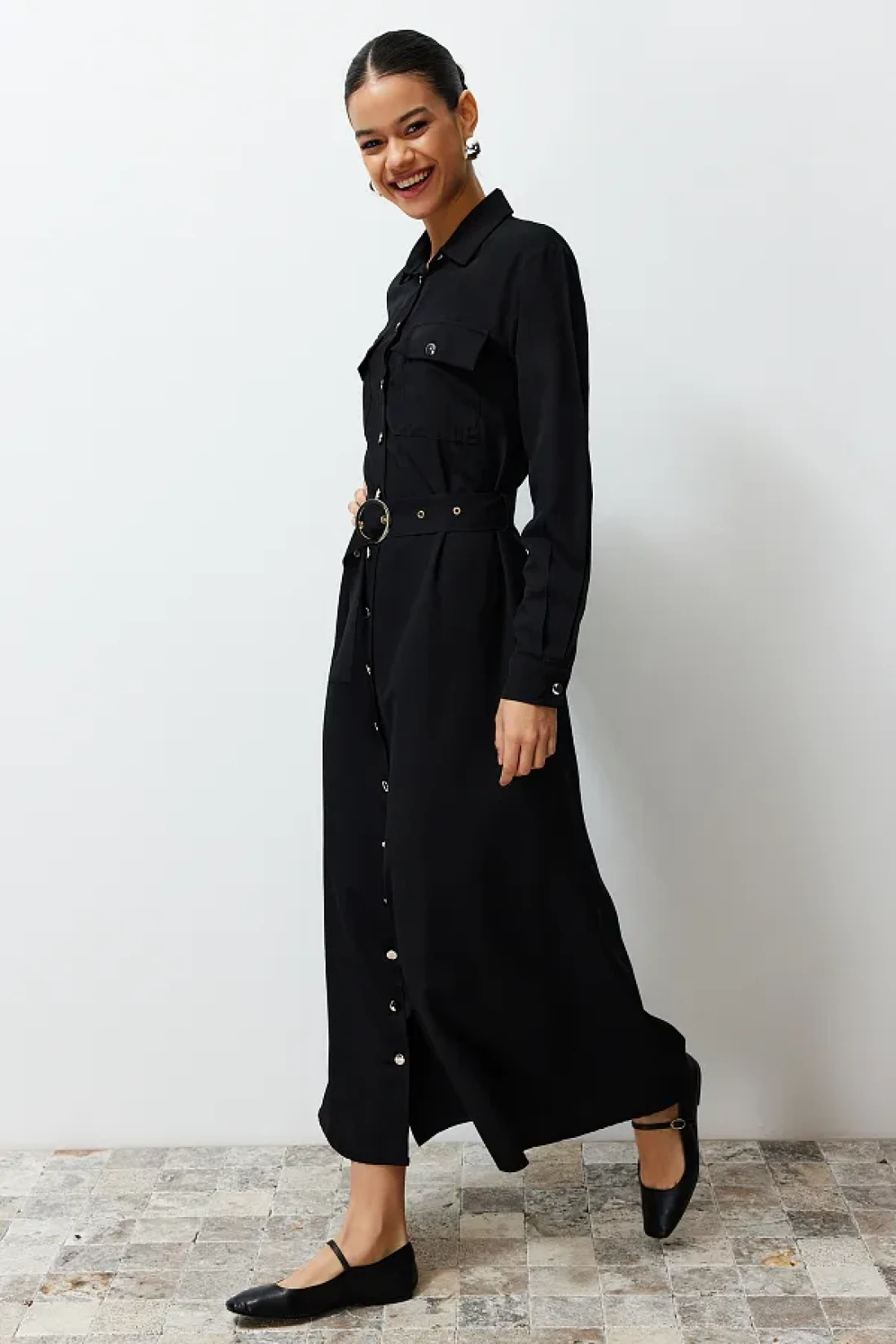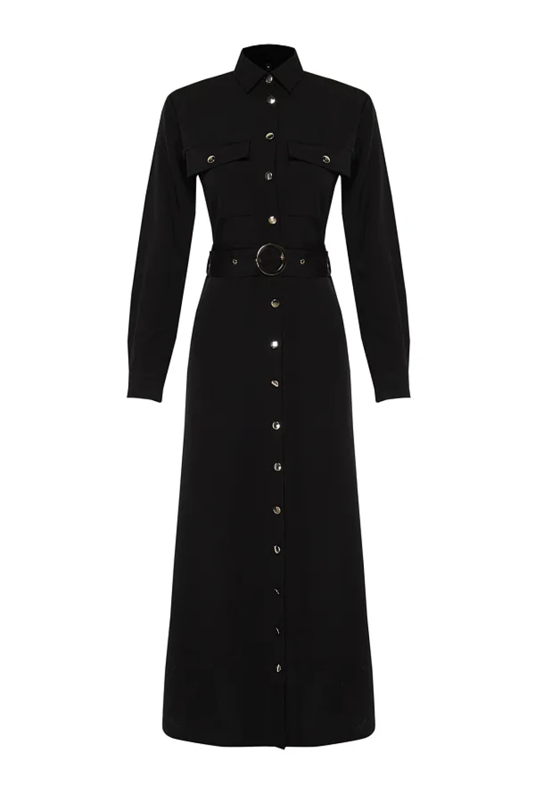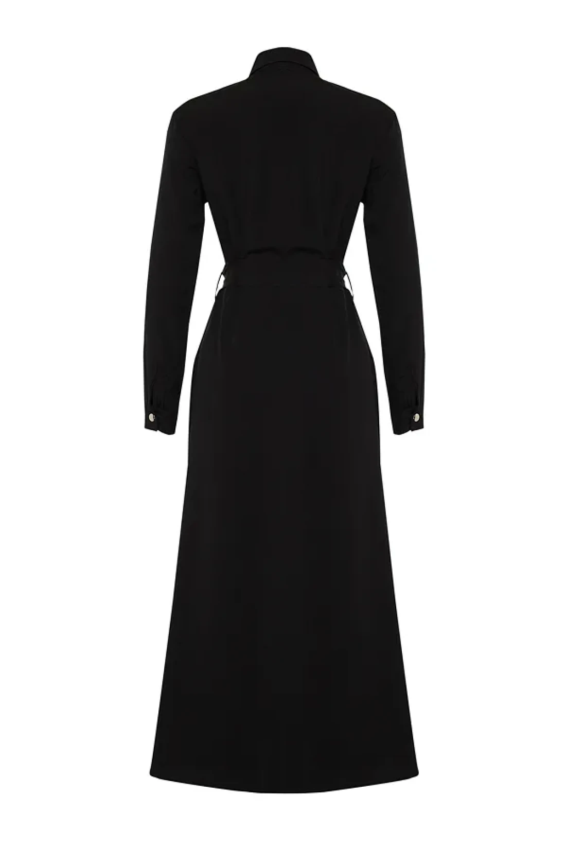 Modest Black Gold Button Detailed Woven Shirt Dress TCTSS24EB00132