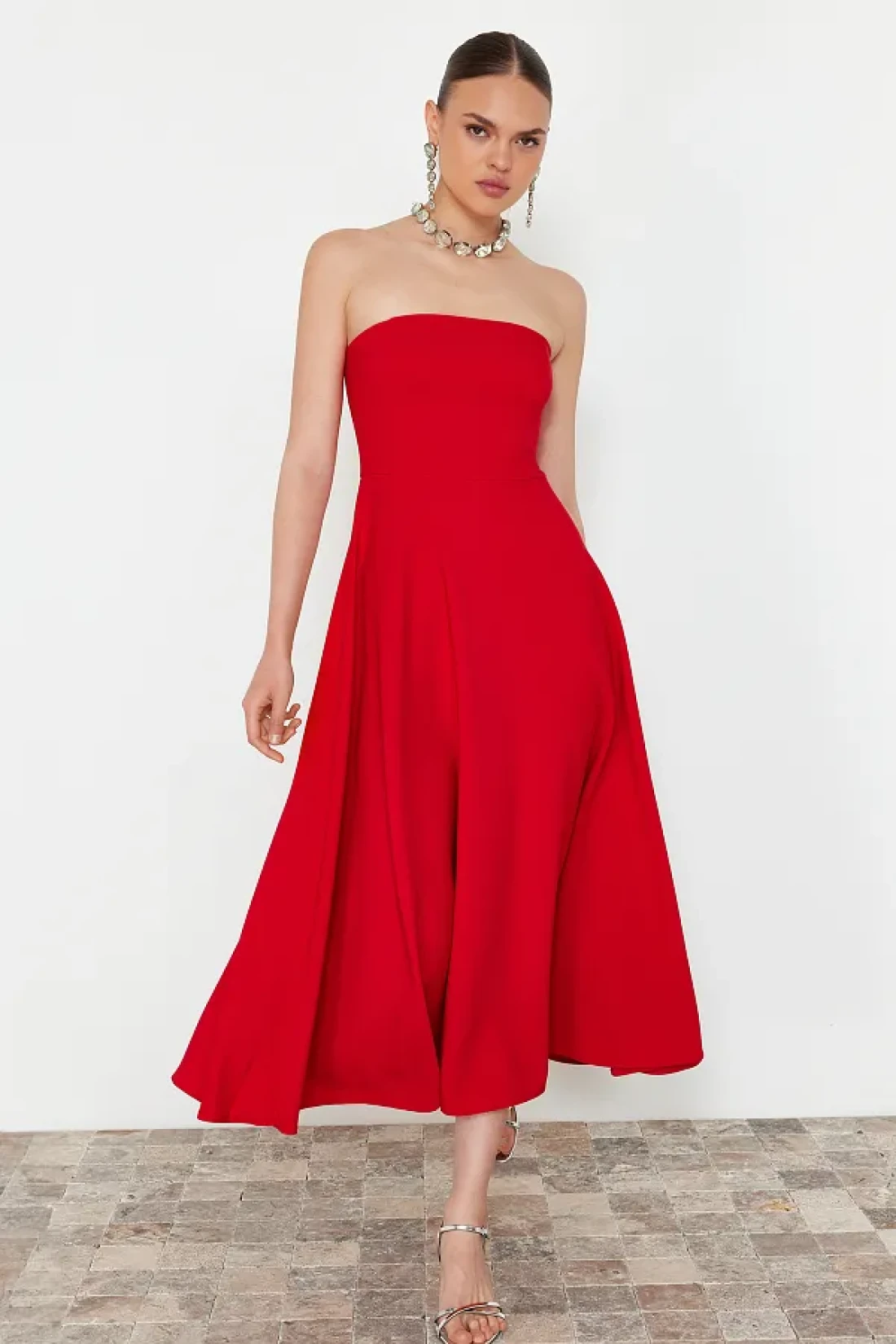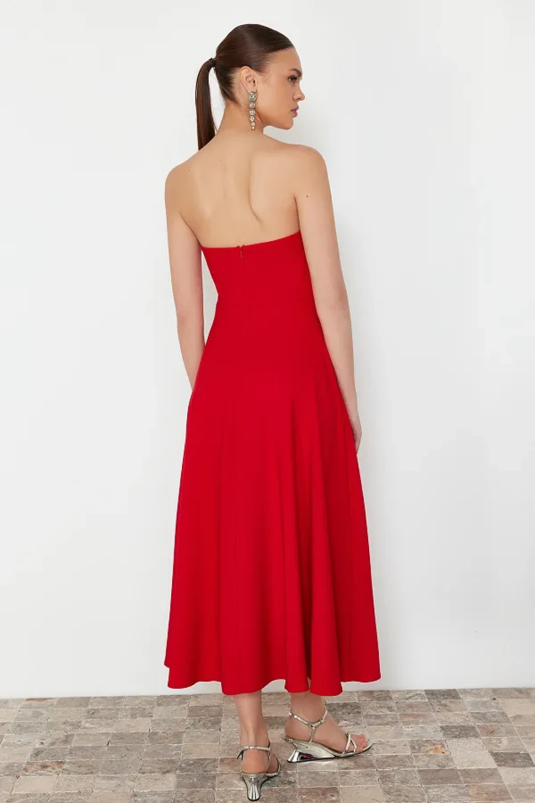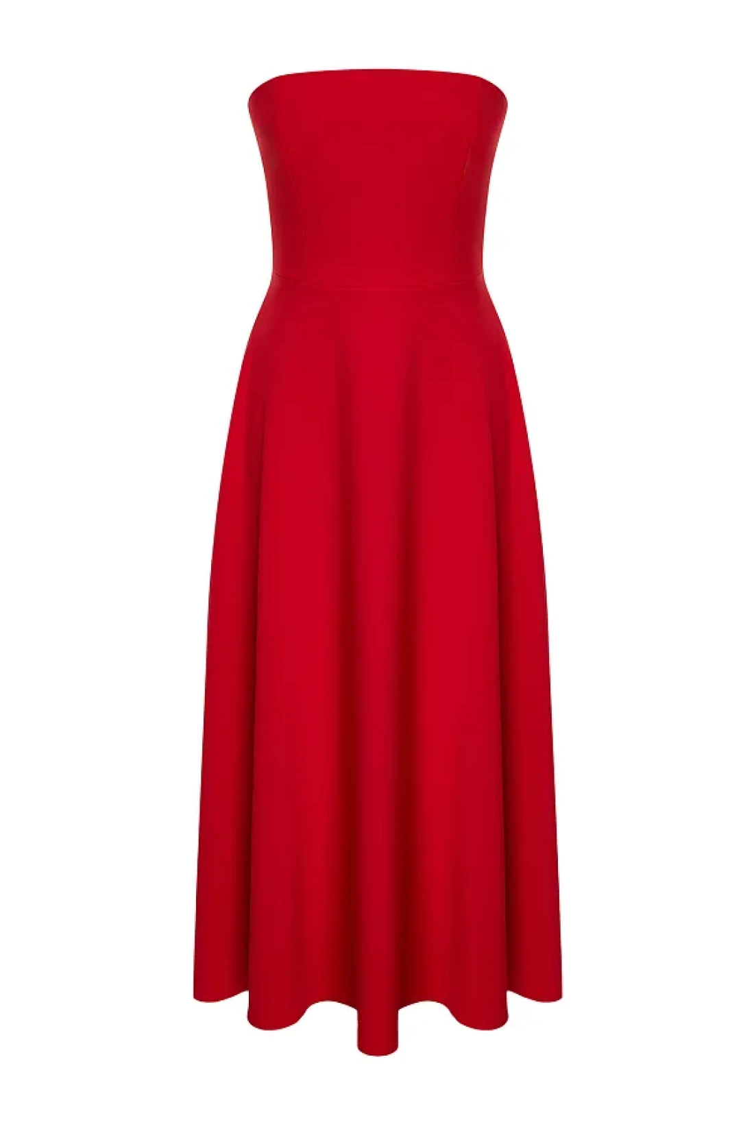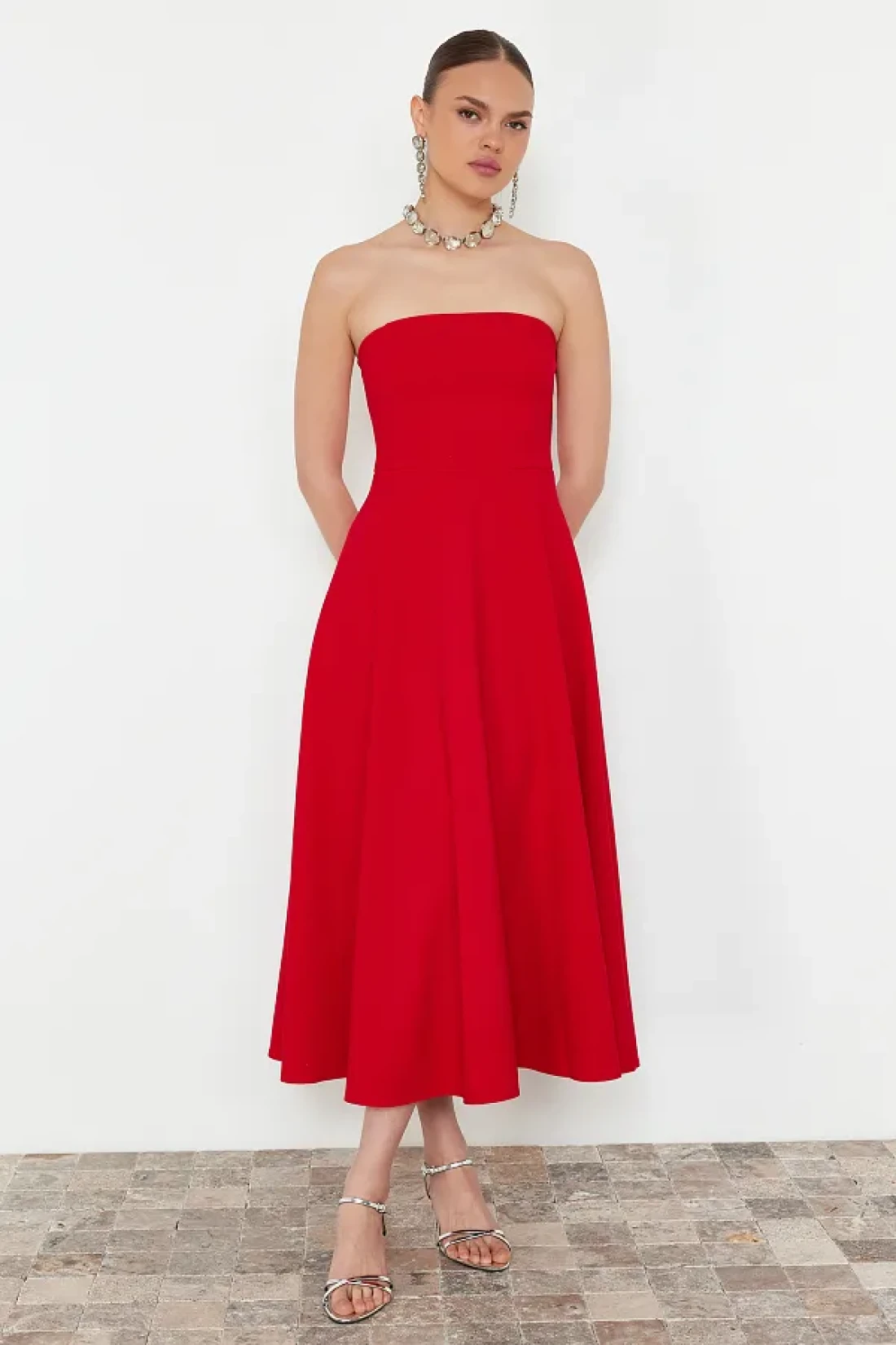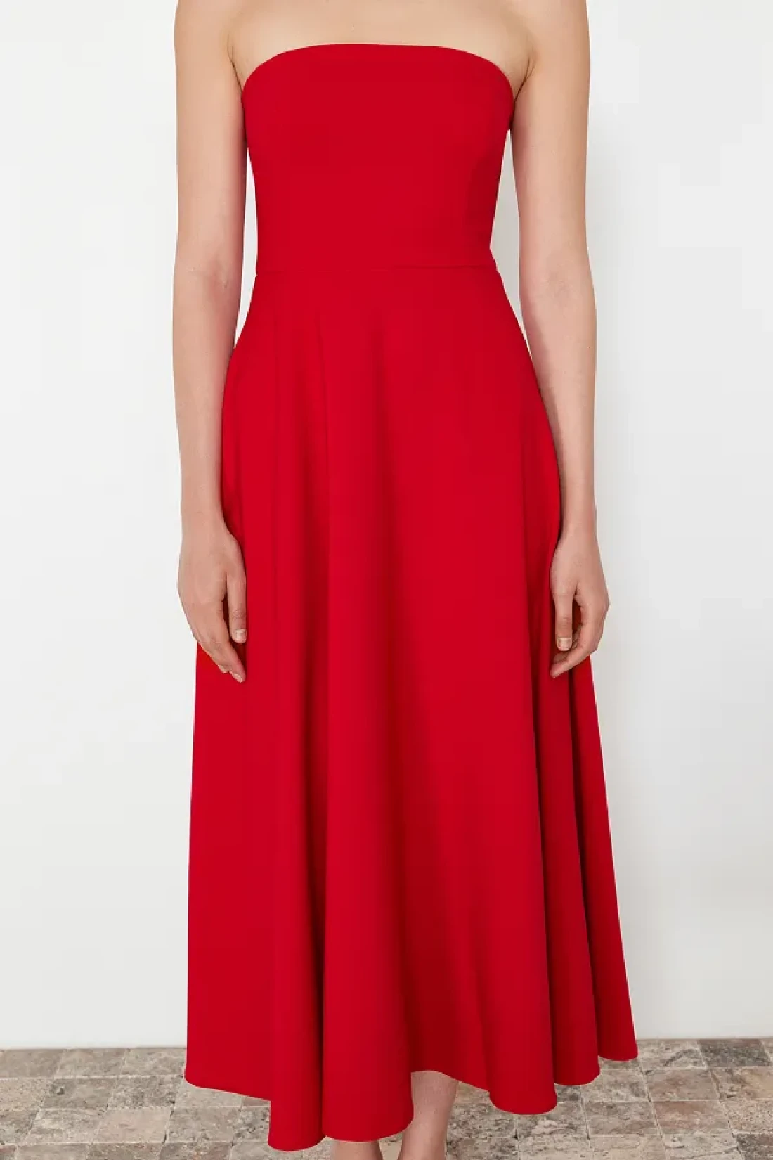 It offers both stylish and comfortable use with its midi length cut. It gives a modern and dynamic look thanks to its skaters silhouette. It adds a feminine atmosphere by releasing the shoulders with its strapless neckline design. Woven fabric construction offers durability and comfort together