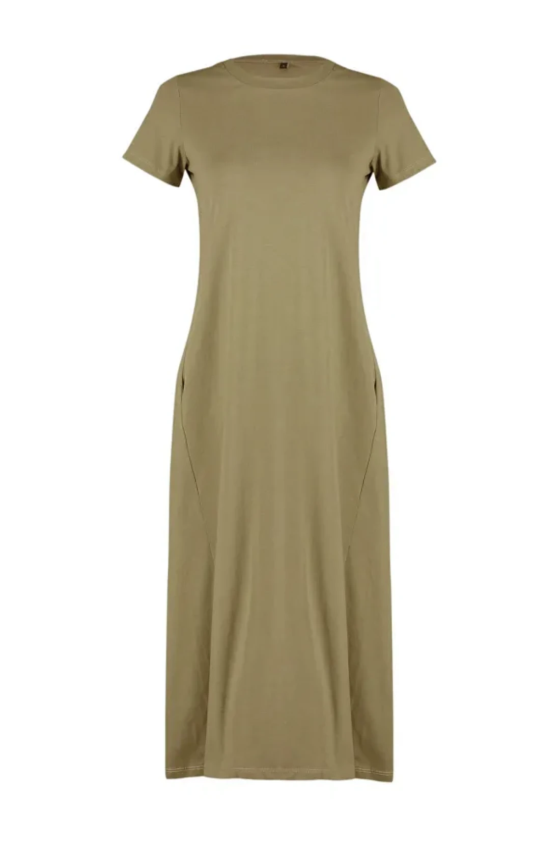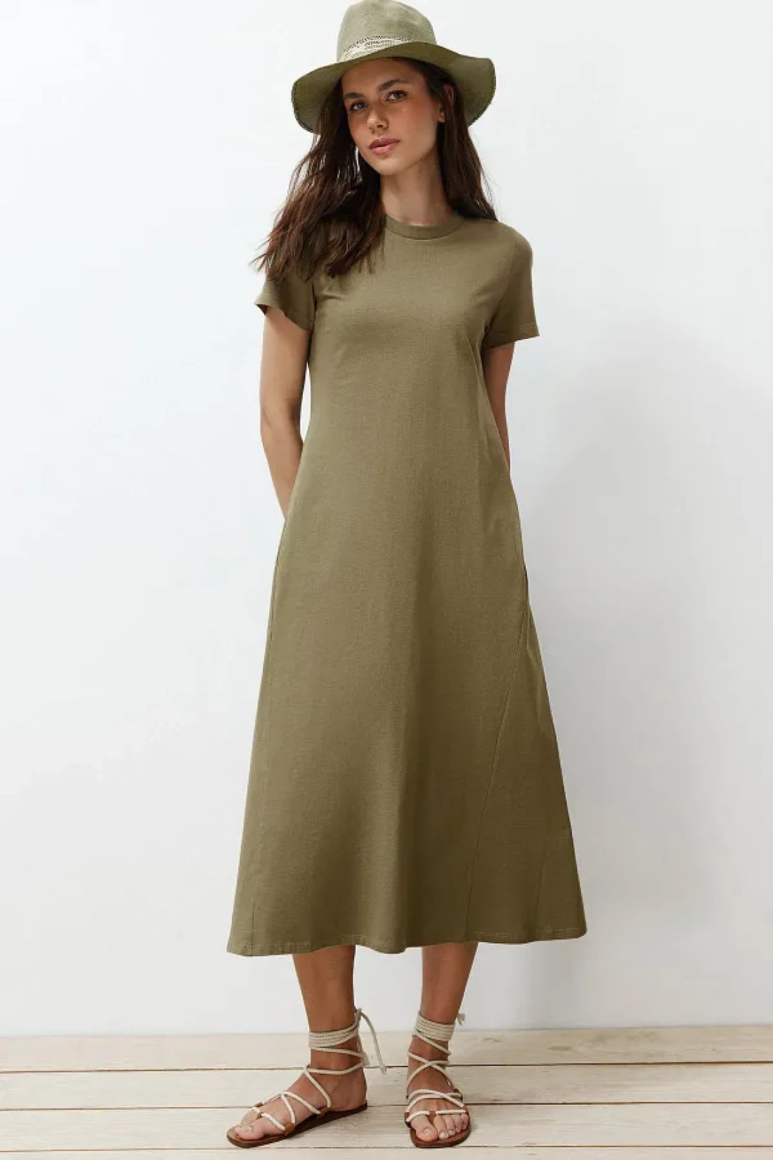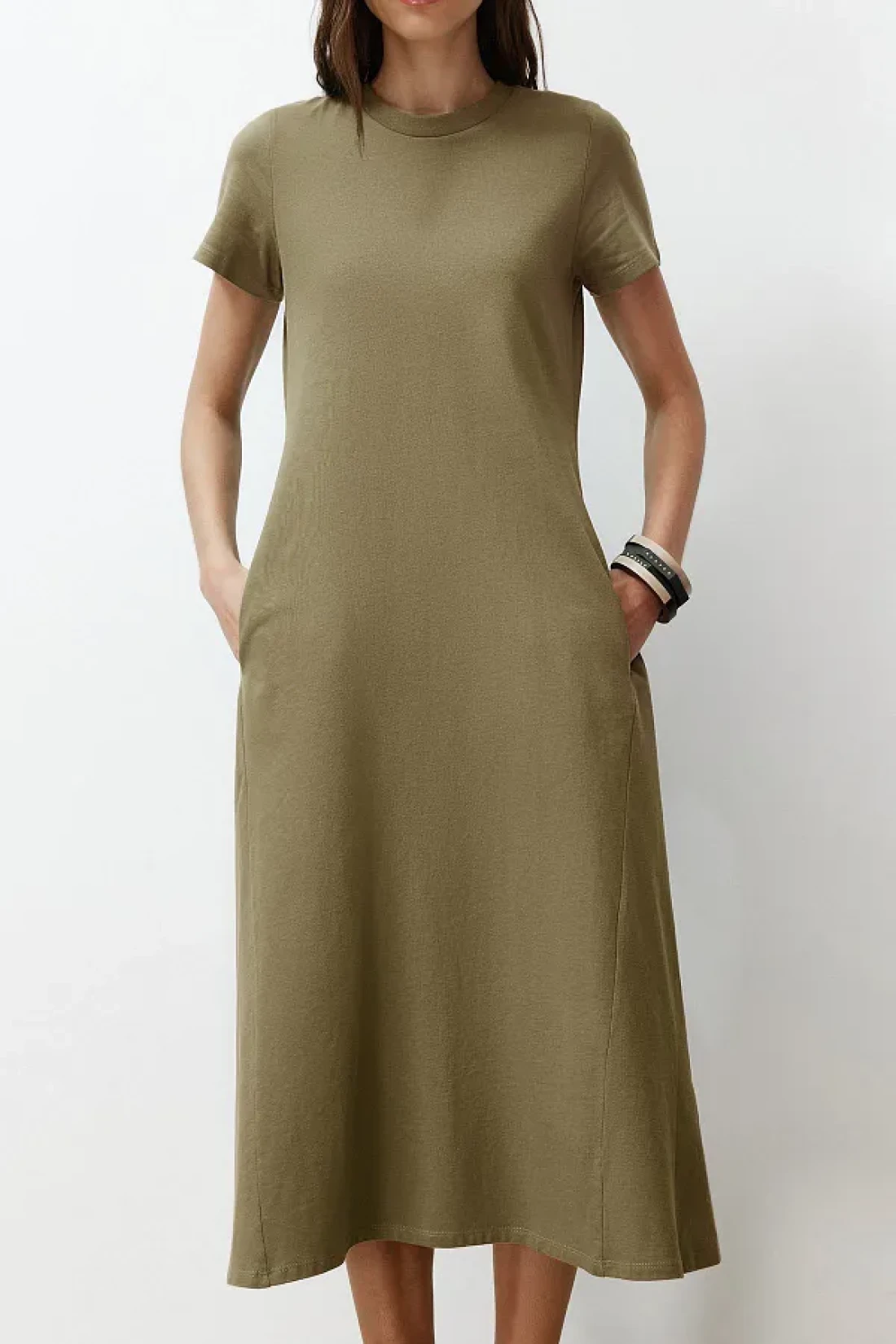 Collection Khaki Pocketed Premium Crew Neck A-Line Knitted Midi Dress TWOSS24EL00169
