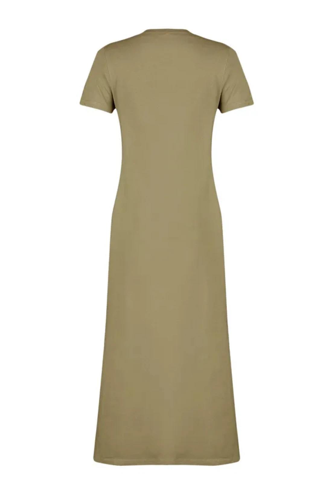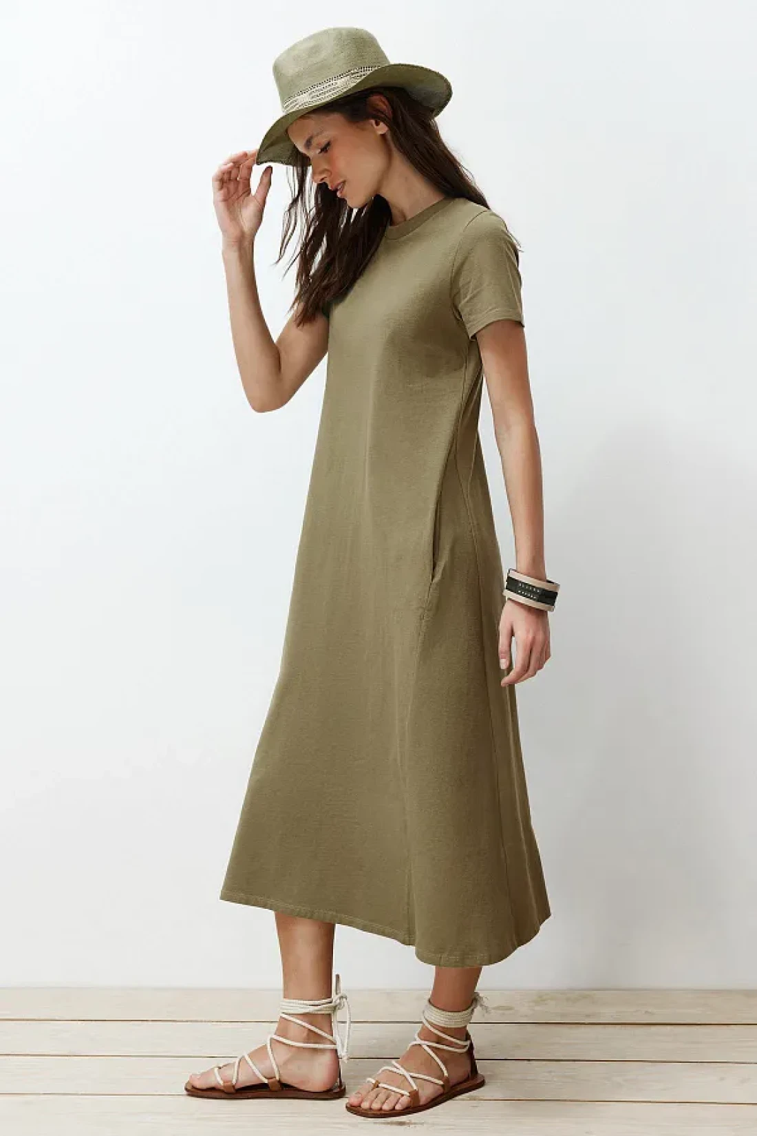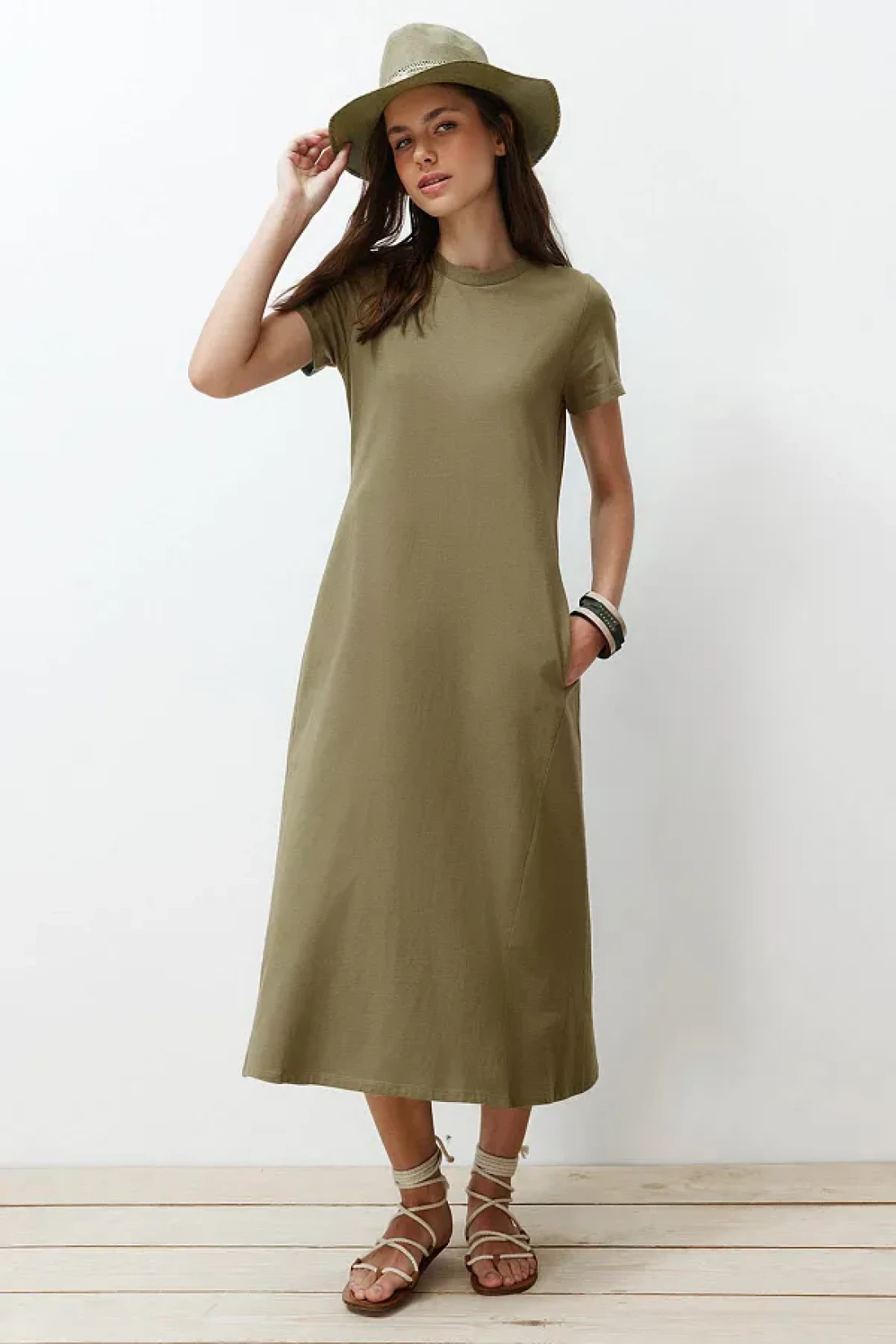Collection Khaki Pocketed Premium Crew Neck A-Line Knitted Midi Dress TWOSS24EL00169