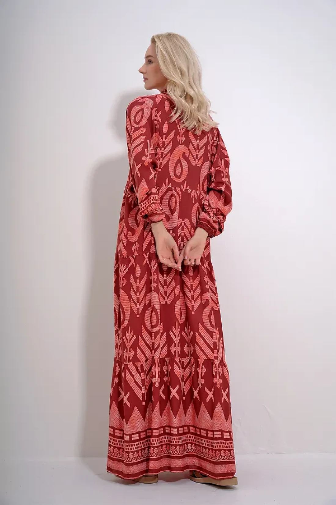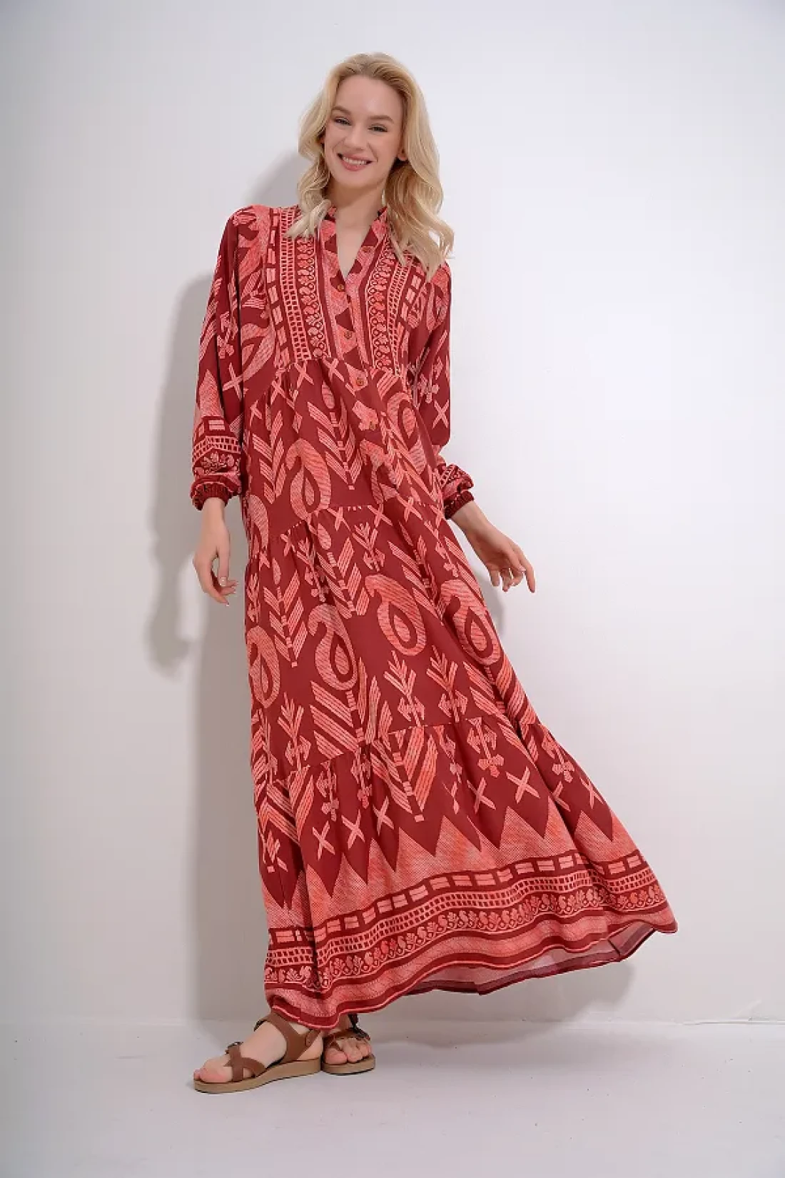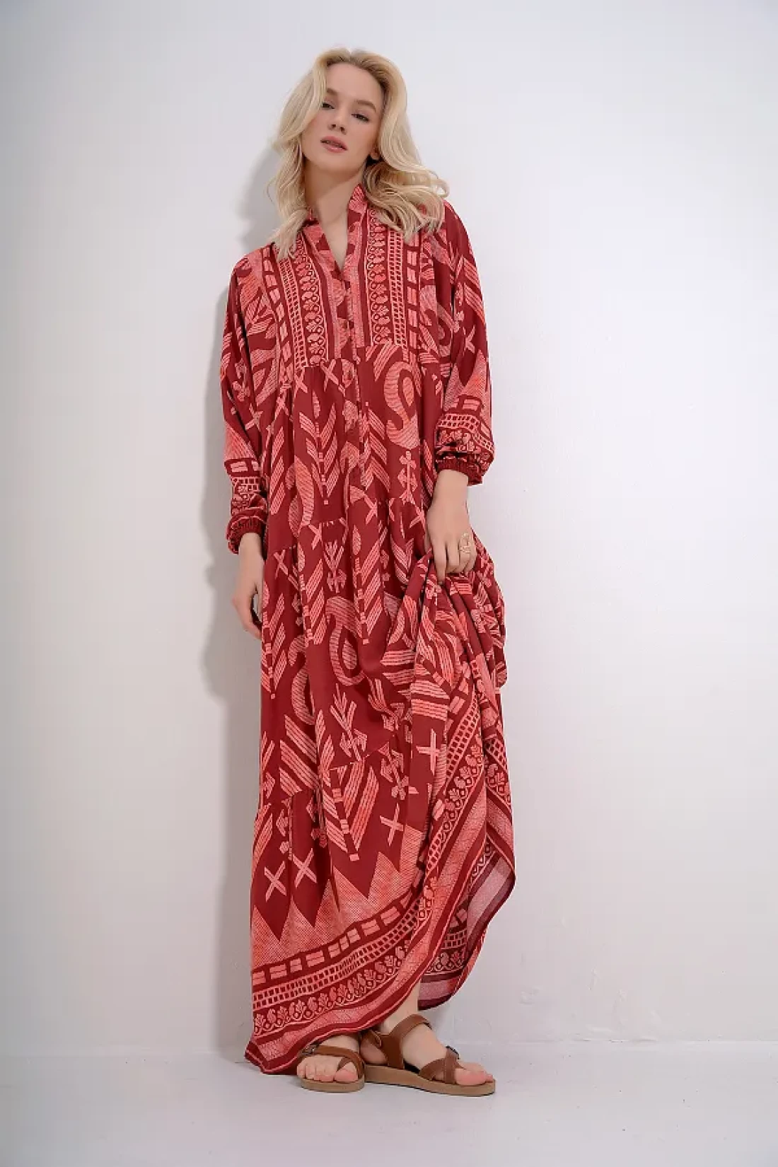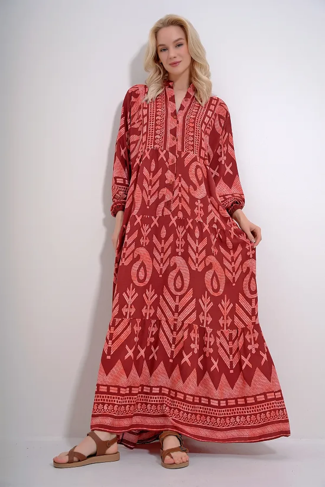 Trend Alaçatı Stili Women's Tile Magnifying Collar Buttoned Skirt Flounced Patterned Maxiboy Dress ALC-X12037
