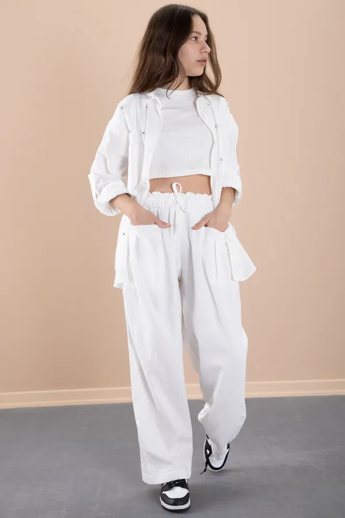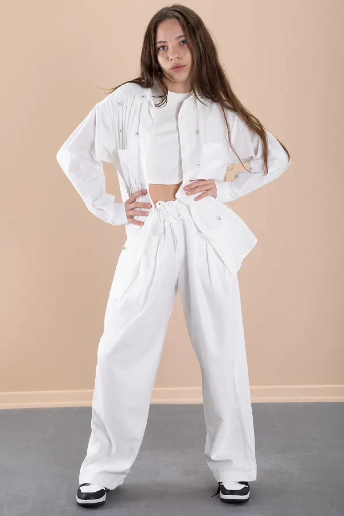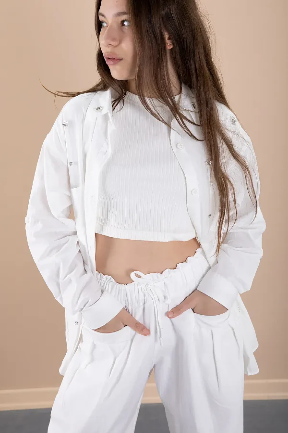 Cansın Mini White Girl's Croplu Stone Shirt and Pants 3 Piece Set 20468