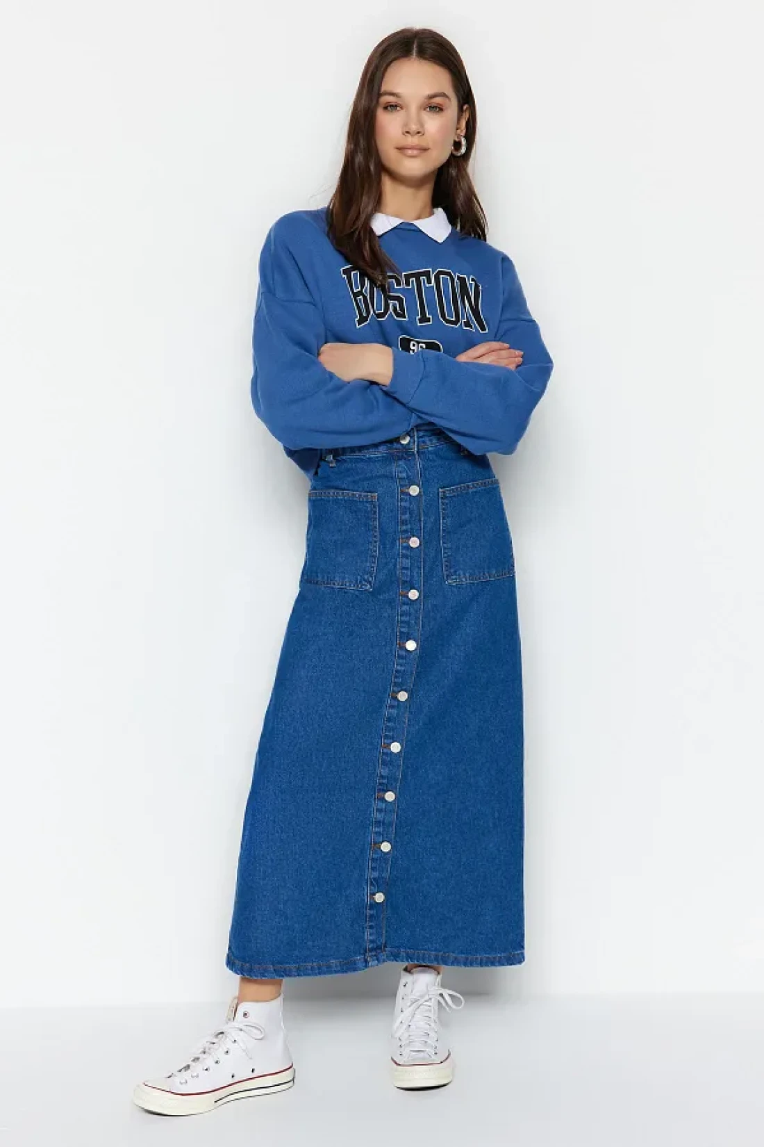 Collection High Waist Dark Indigo Maxi Denim Jeans Skirt - Double Pockets and Front Buttoned Tctss23Ee00002