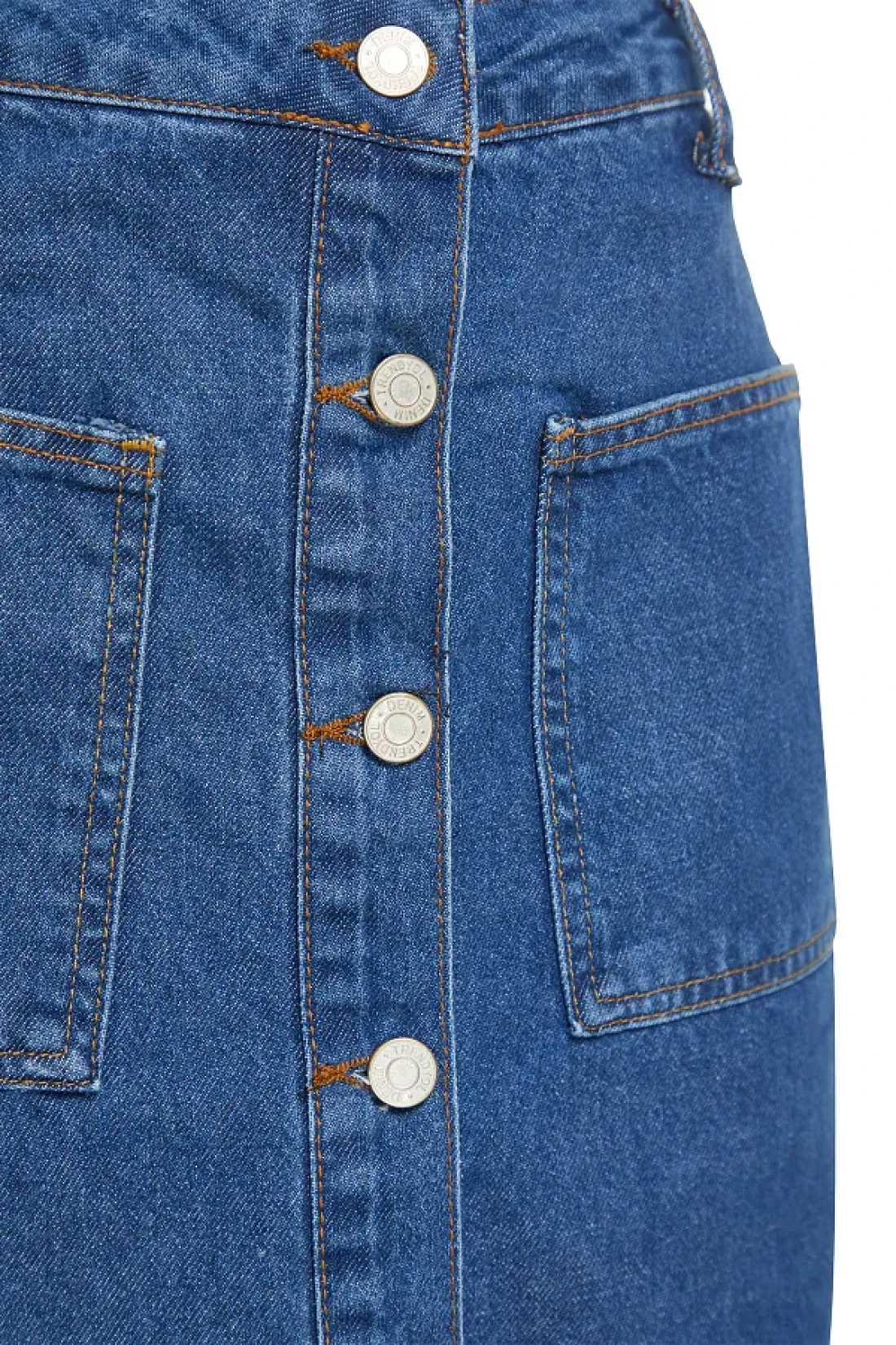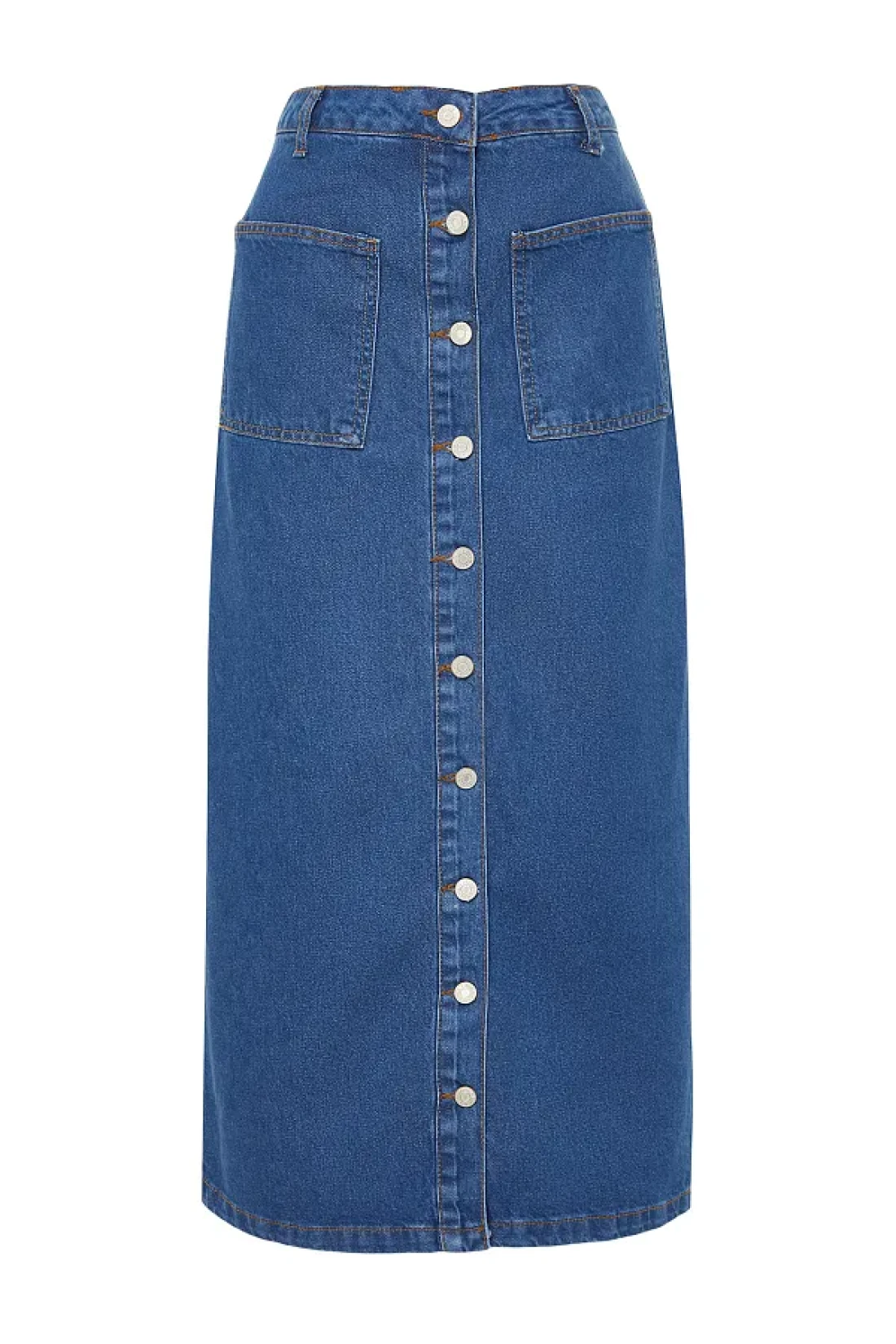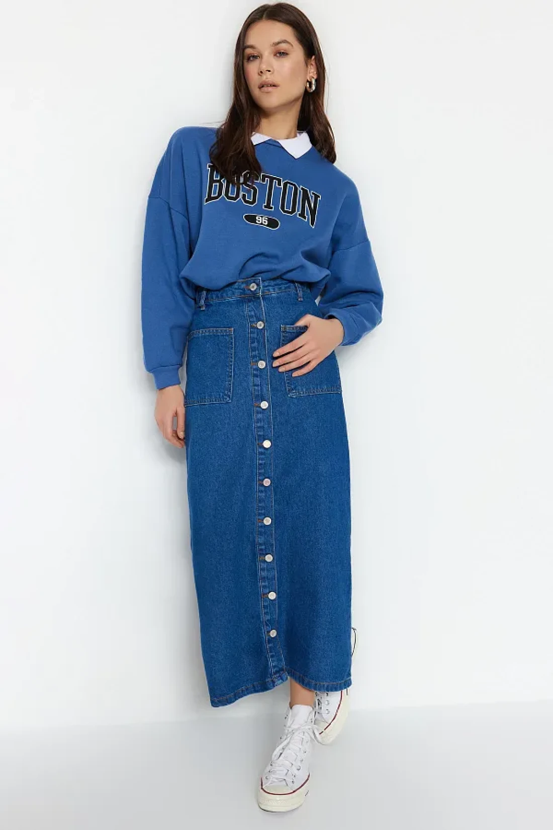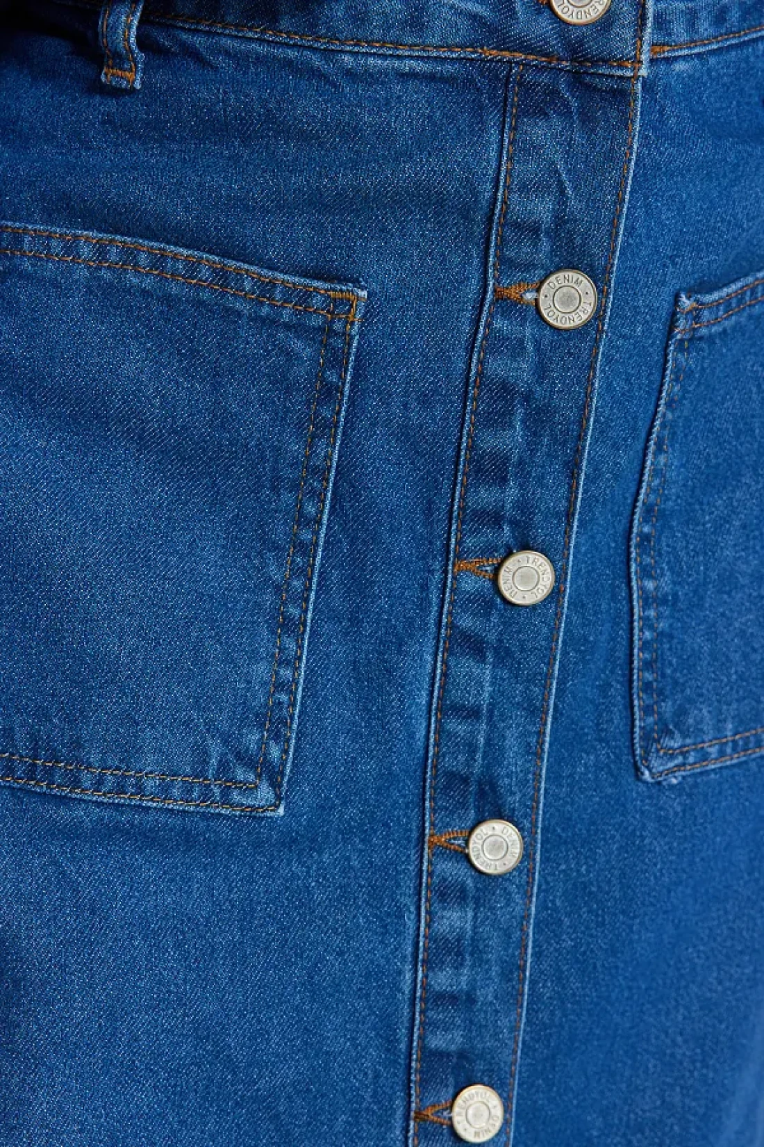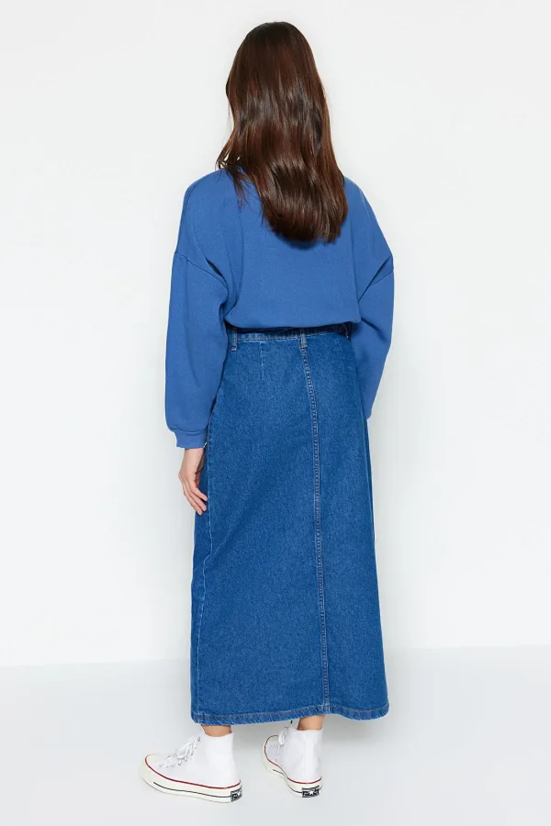 It offers a modern and stylish look with its pencil silhouette. Thanks to its denim fabric, it provides durability and comfort together. Rigid woven type gives the skirt a characteristic texture