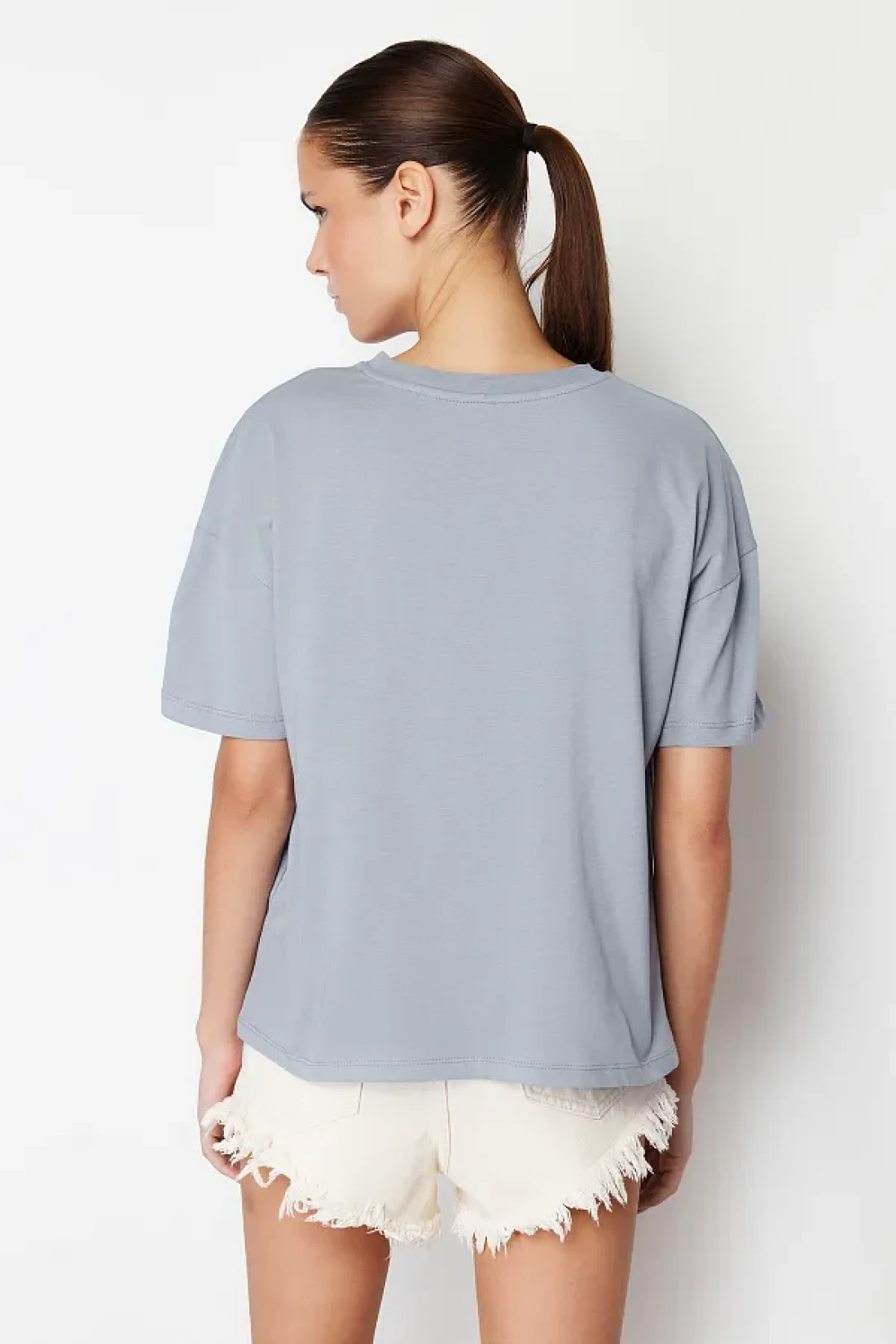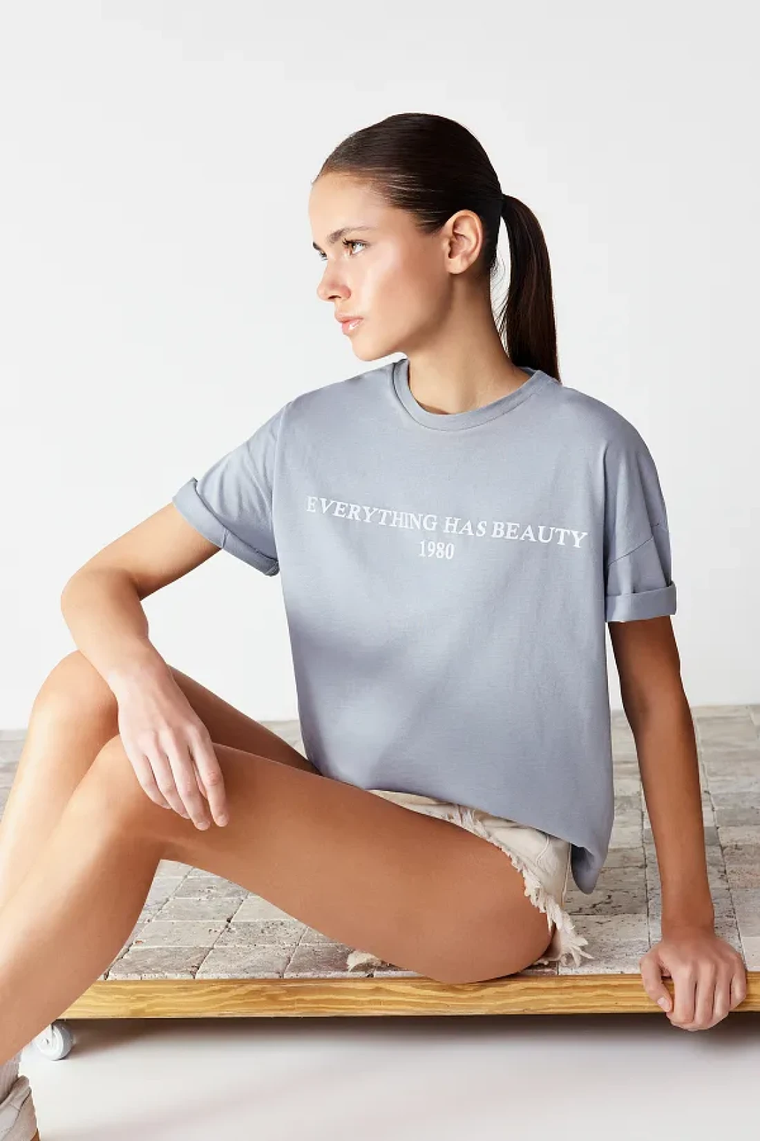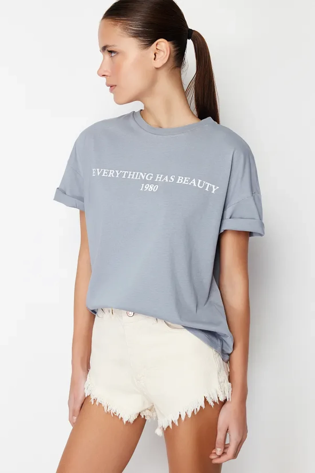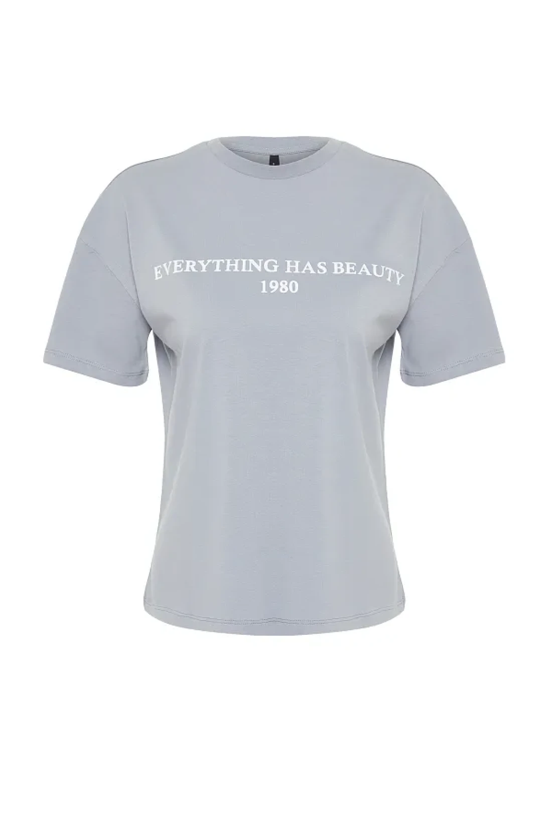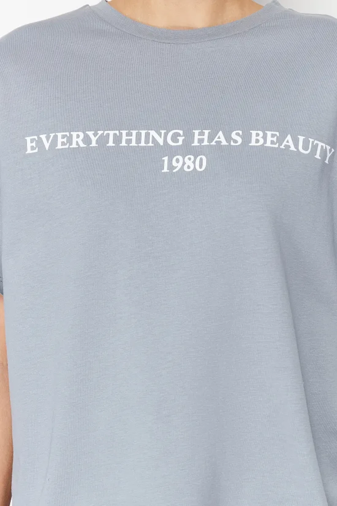 Collection Gray 100% Cotton Slogan Printed Relaxed/Wide Relaxed Cut Knitted T-Shirt TWOSS19GH0034