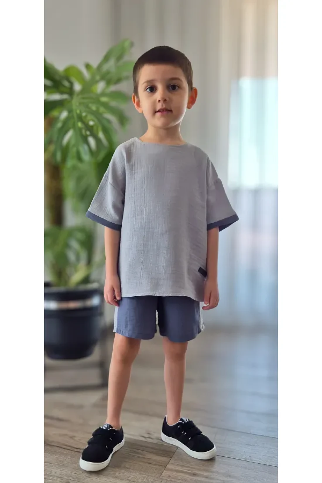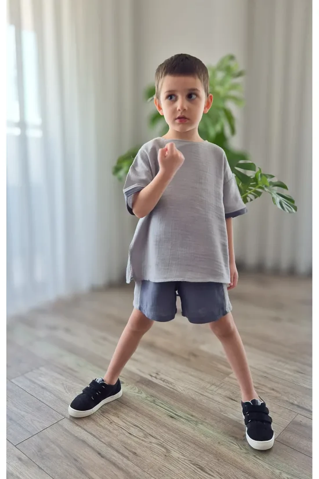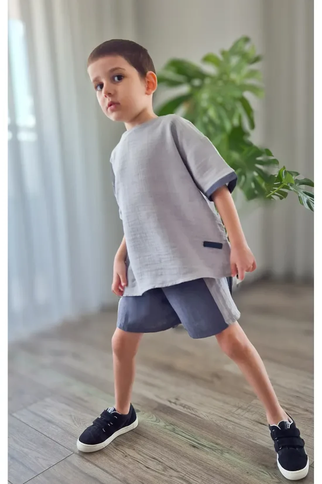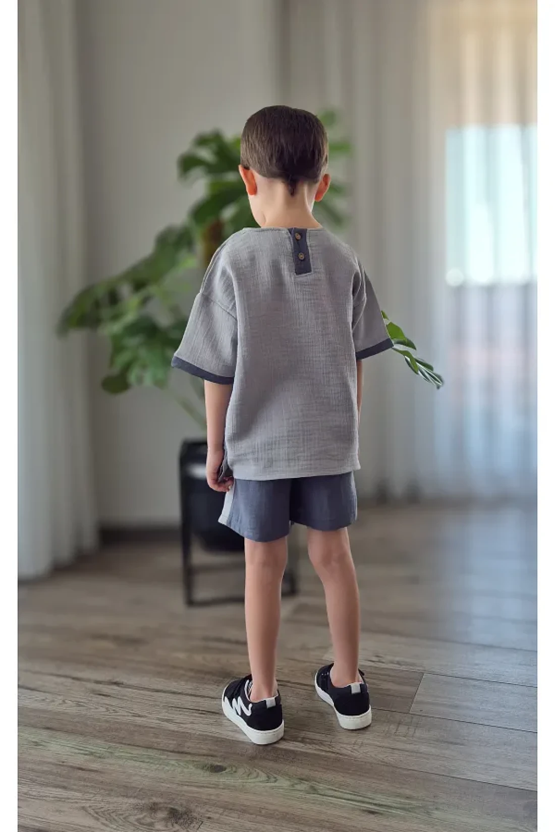 My Baby's World Smoked-Grey Natural Muslin Fabric Boy's Garnished Shorts Summer Suit Mtye0083