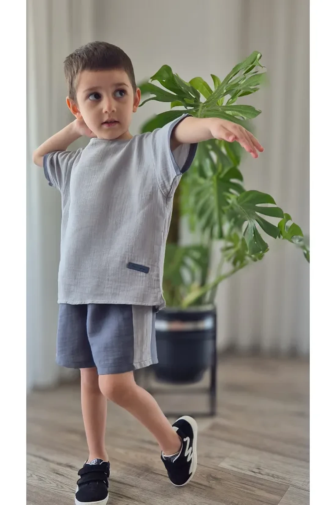 It is produced from natural muslin fabric, compatible with smoke-gray color tones, and has Oversized molds that allow boys to move comfortably.