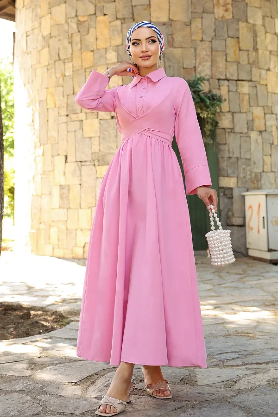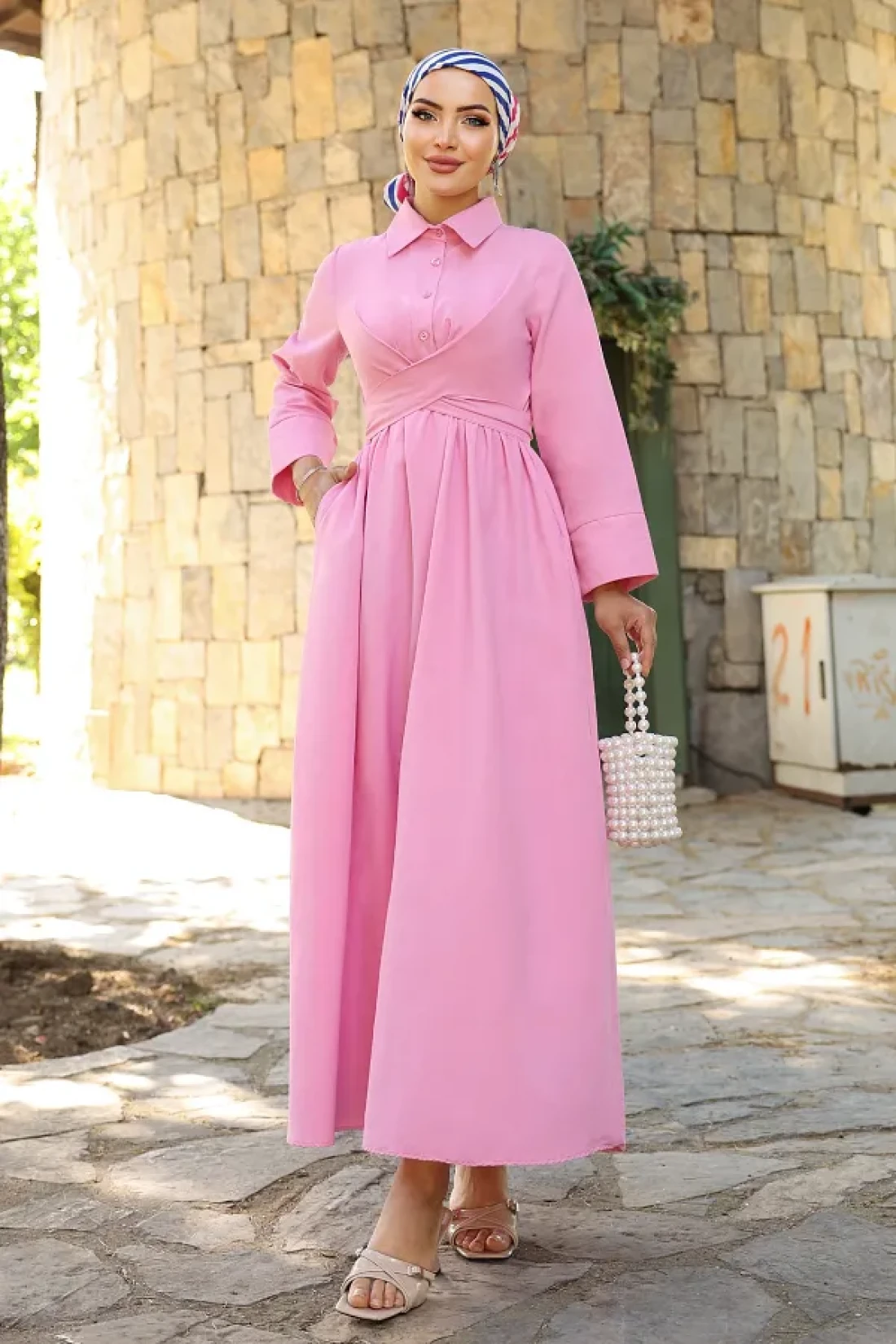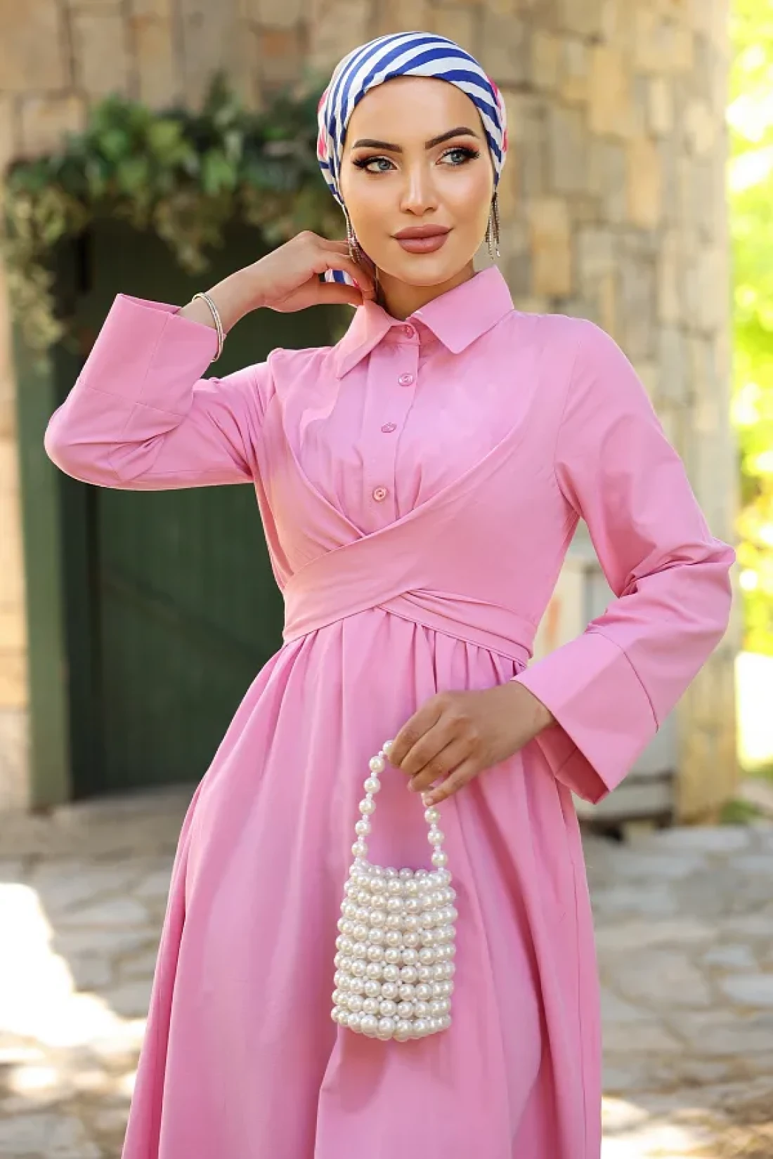 InStyle Belt Detailed Shirt Collar Pink Dress