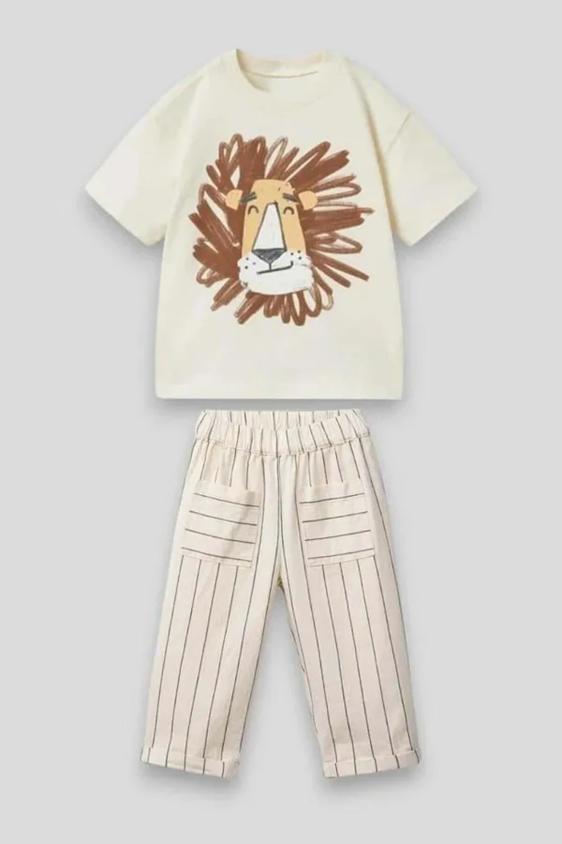 Magu Unisex Kids Cotton Ecru Lion Printed T-Shirt and Striped Pants Set – Summer Set with Pockets