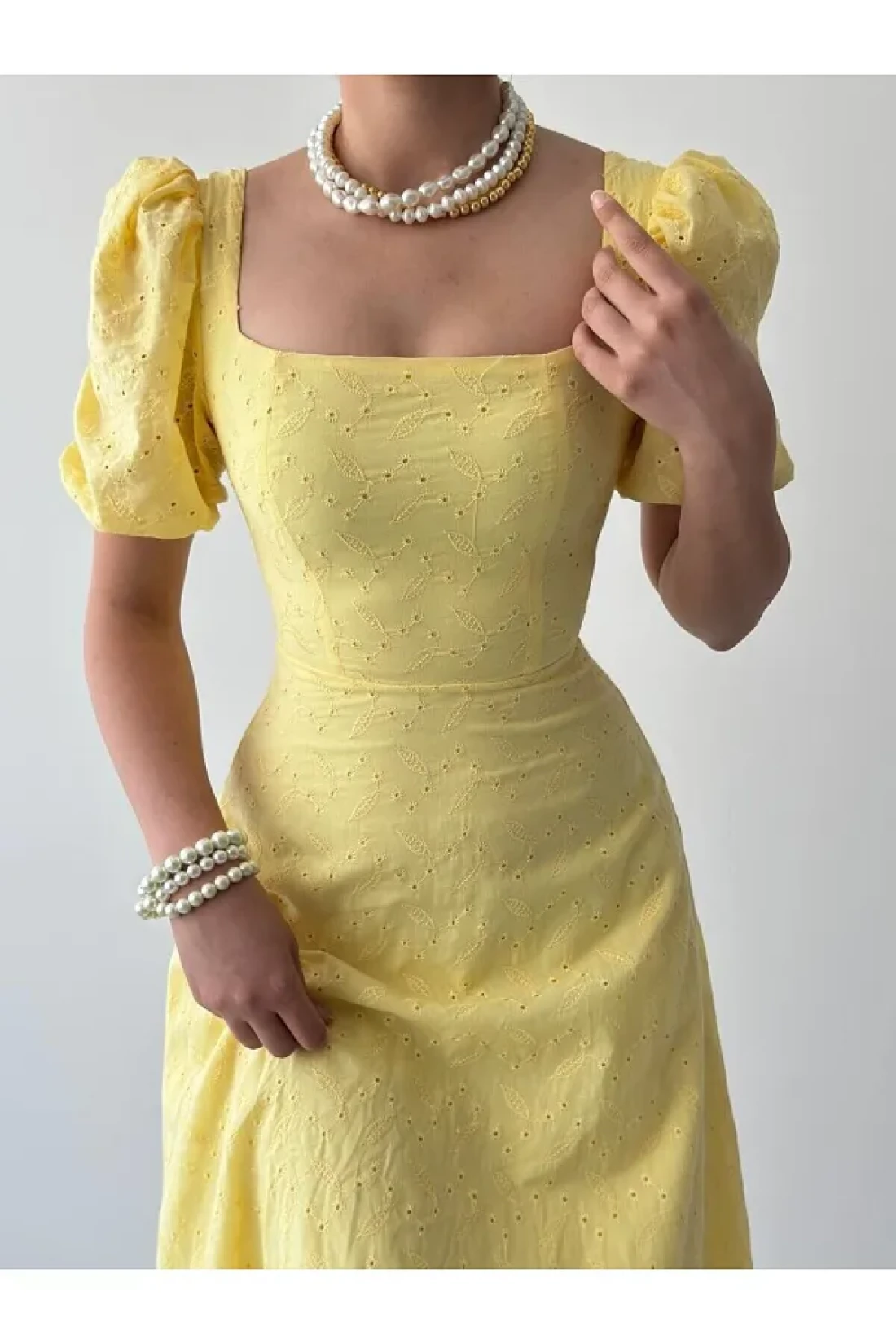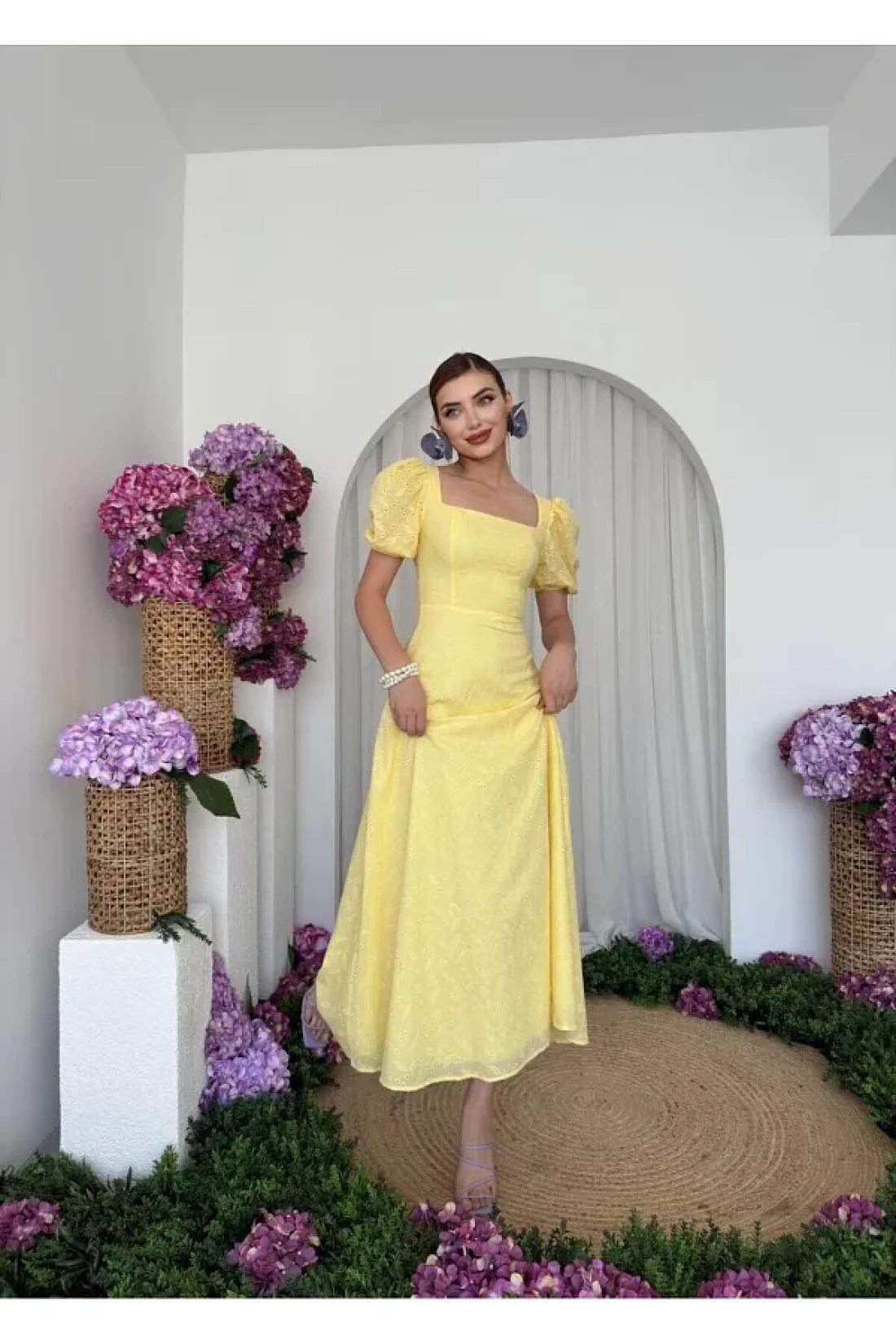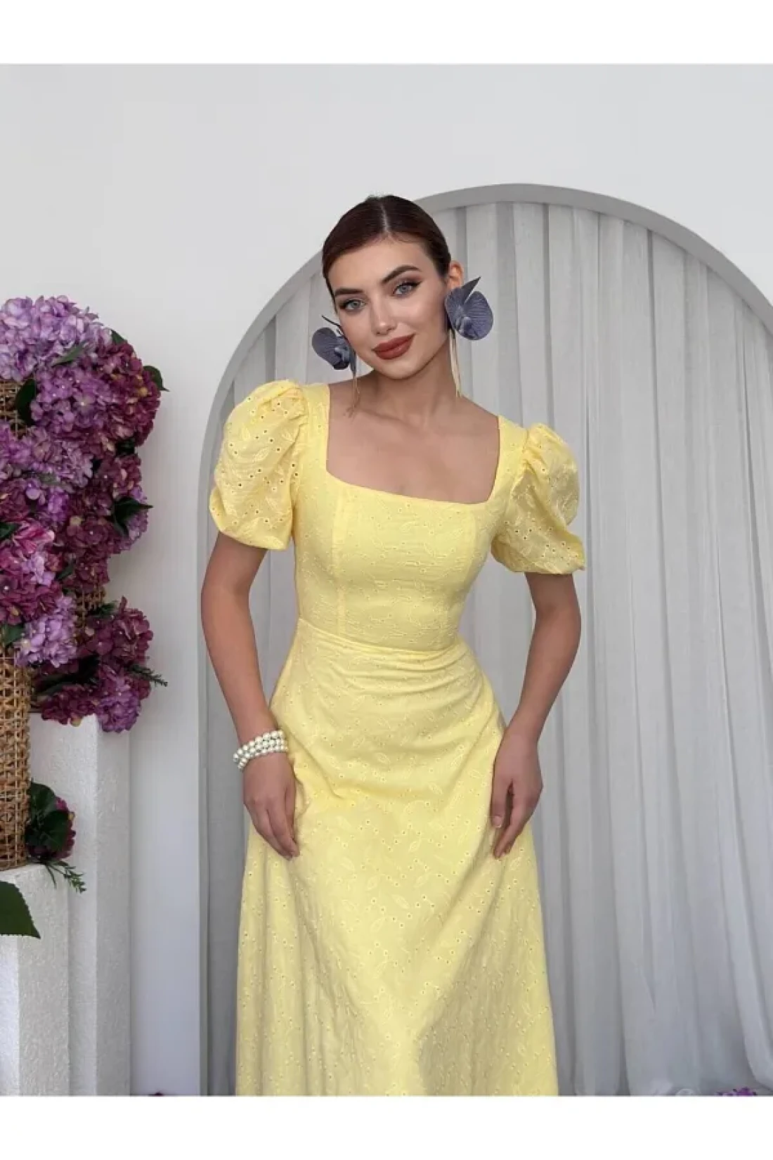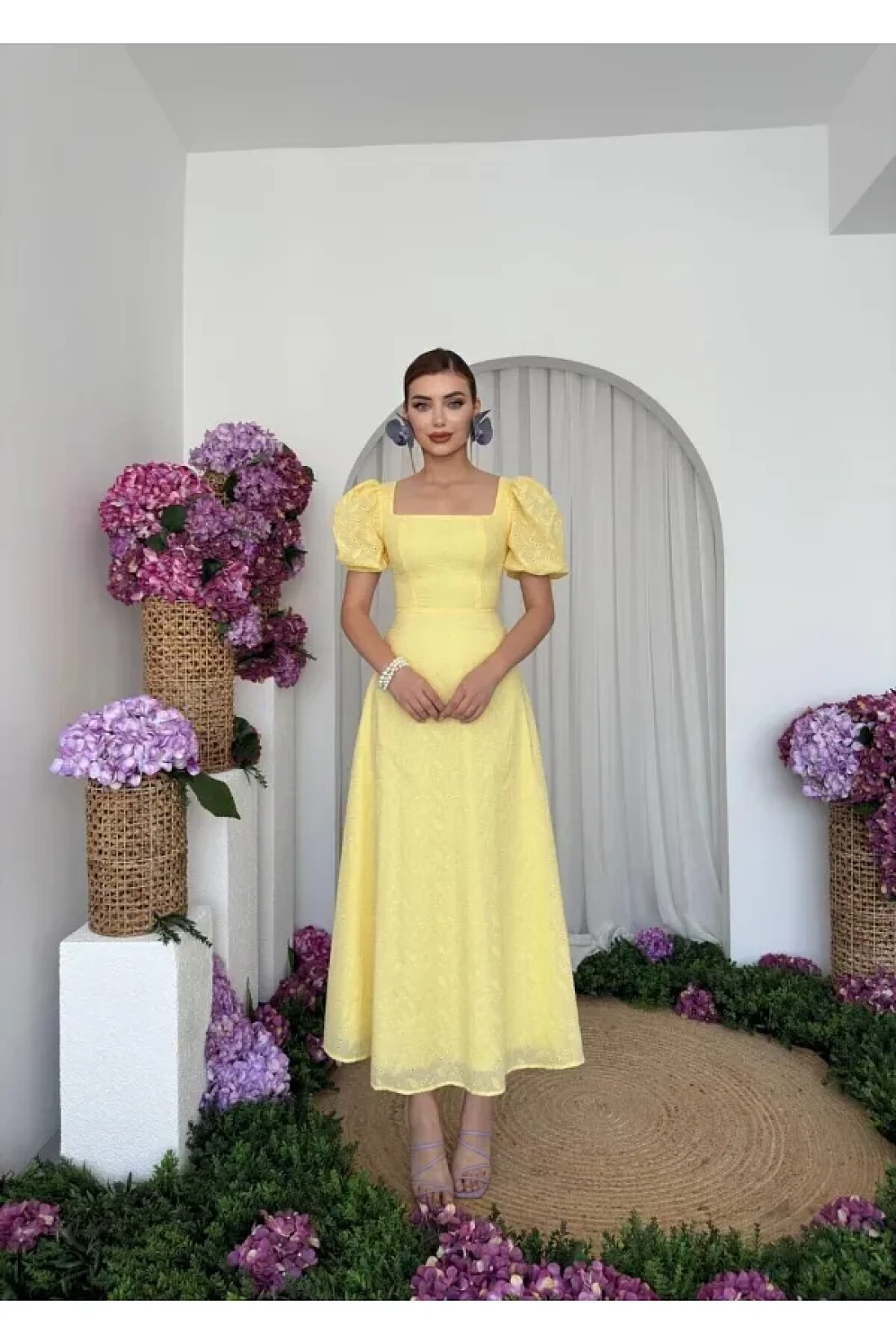 Embossed patterned lined balloon sleeve maxi long length premium dress, 95% cotton, 5% polyester dress length: 128cm with its balloon sleeve design, you will not compromise your comfort while maintaining your elegance during seasonal transitions and hot weather. Thanks to its practical zipper closure, it can be easily put on and taken off and saves time. It offers an elegant silhouette with its long length and allows you to be in harmony with different combinations. Our dress adds to the modern and trend look, while also adding an aesthetic touch