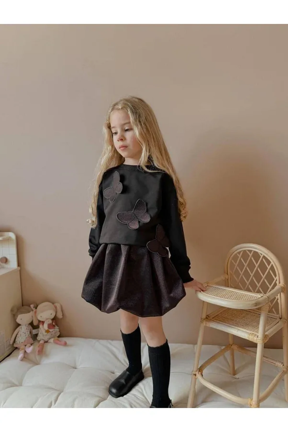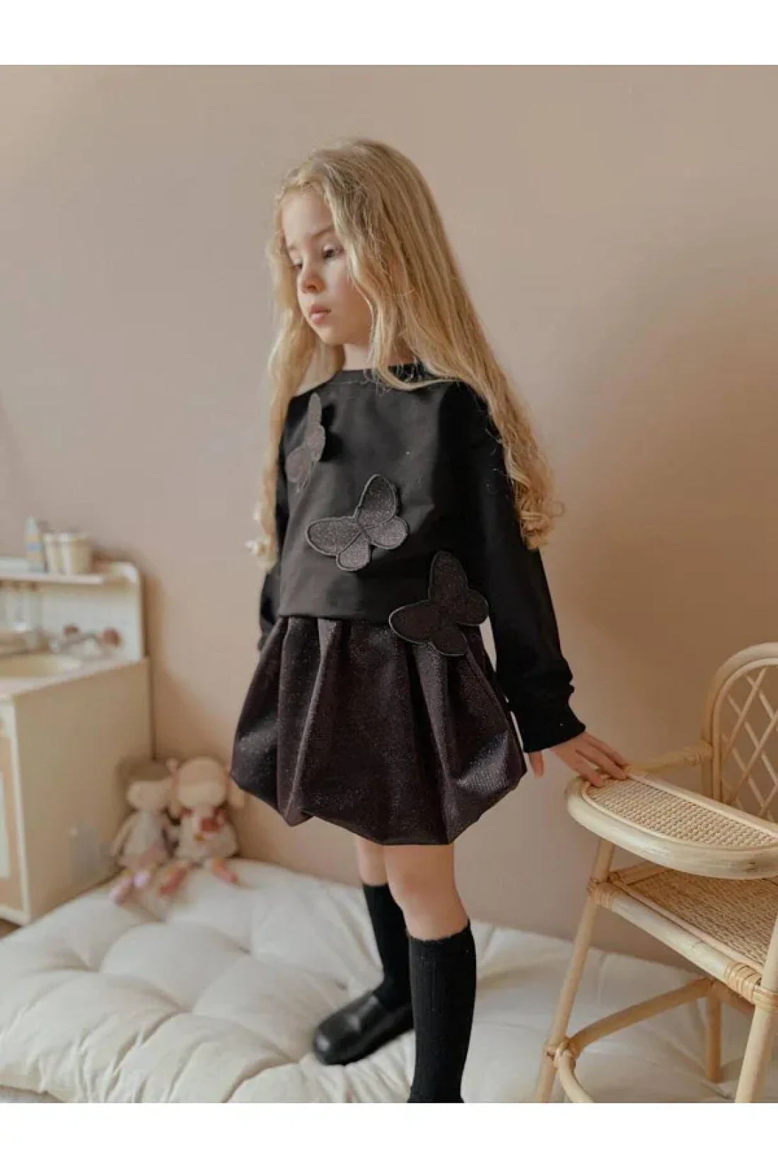 YİGİT BUTİK Yigit Boutique Butterfly Detailed Glitter Balloon Skirt Girl's Bottom and Top Set