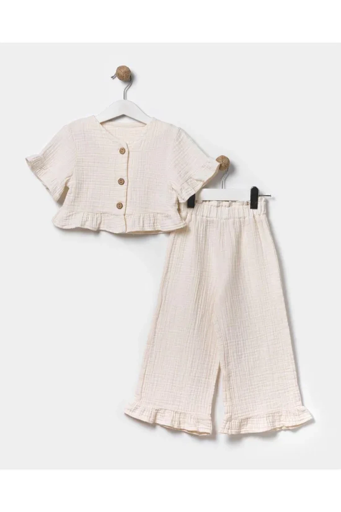 Magu Girl's Ecru Textured Cotton Buttoned T-shirt Spanish Trousers Top and Bottom Set