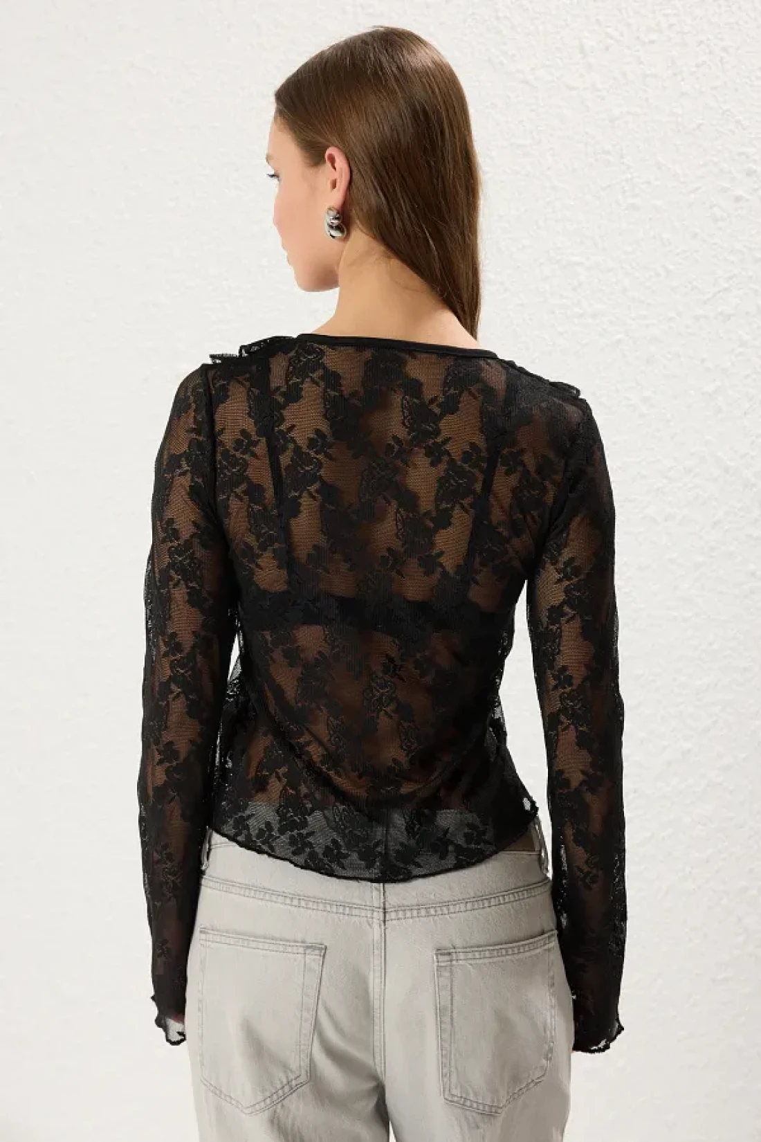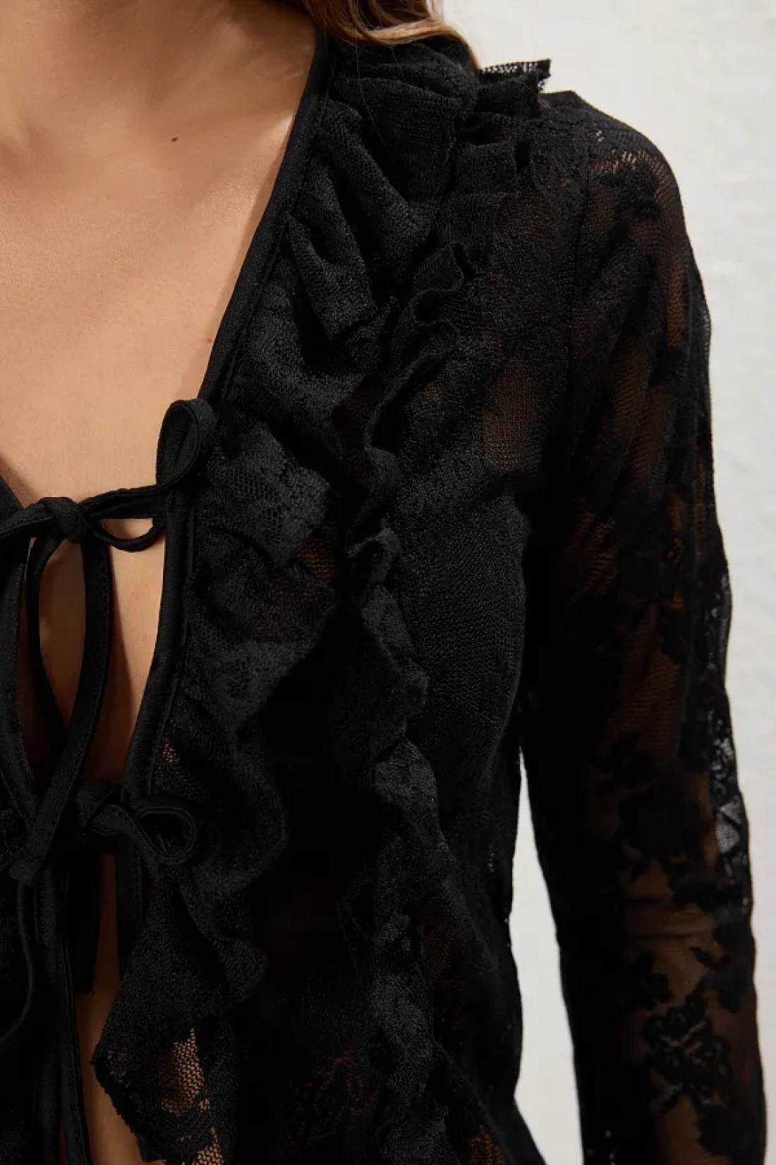 Collection Black Lace Fitted/Fitted Gather/Drape and Tie Detail Stretchy Knitted Blouse Twoss25Bz00270