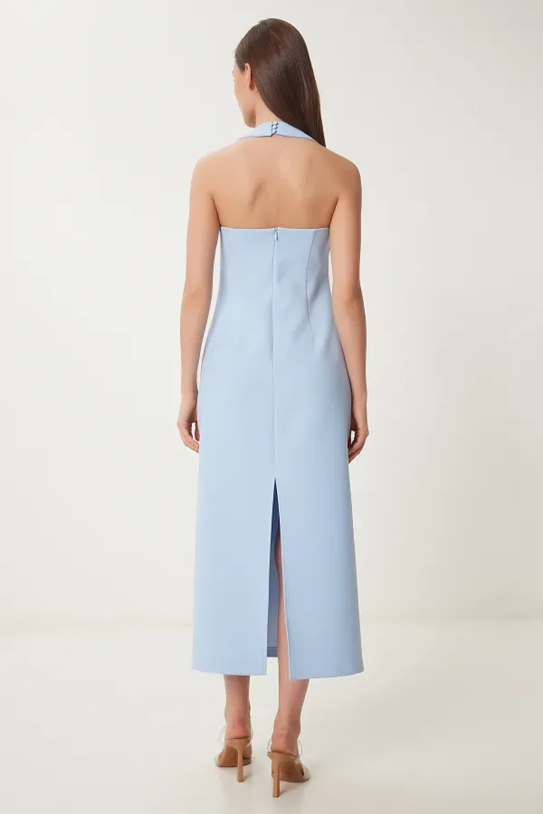 Thick strap, button and hidden zipper closure, Slit midi woven dress from the back content: %94 polyester %6 elastane product length: 127 cm 30 ° Machine washable.