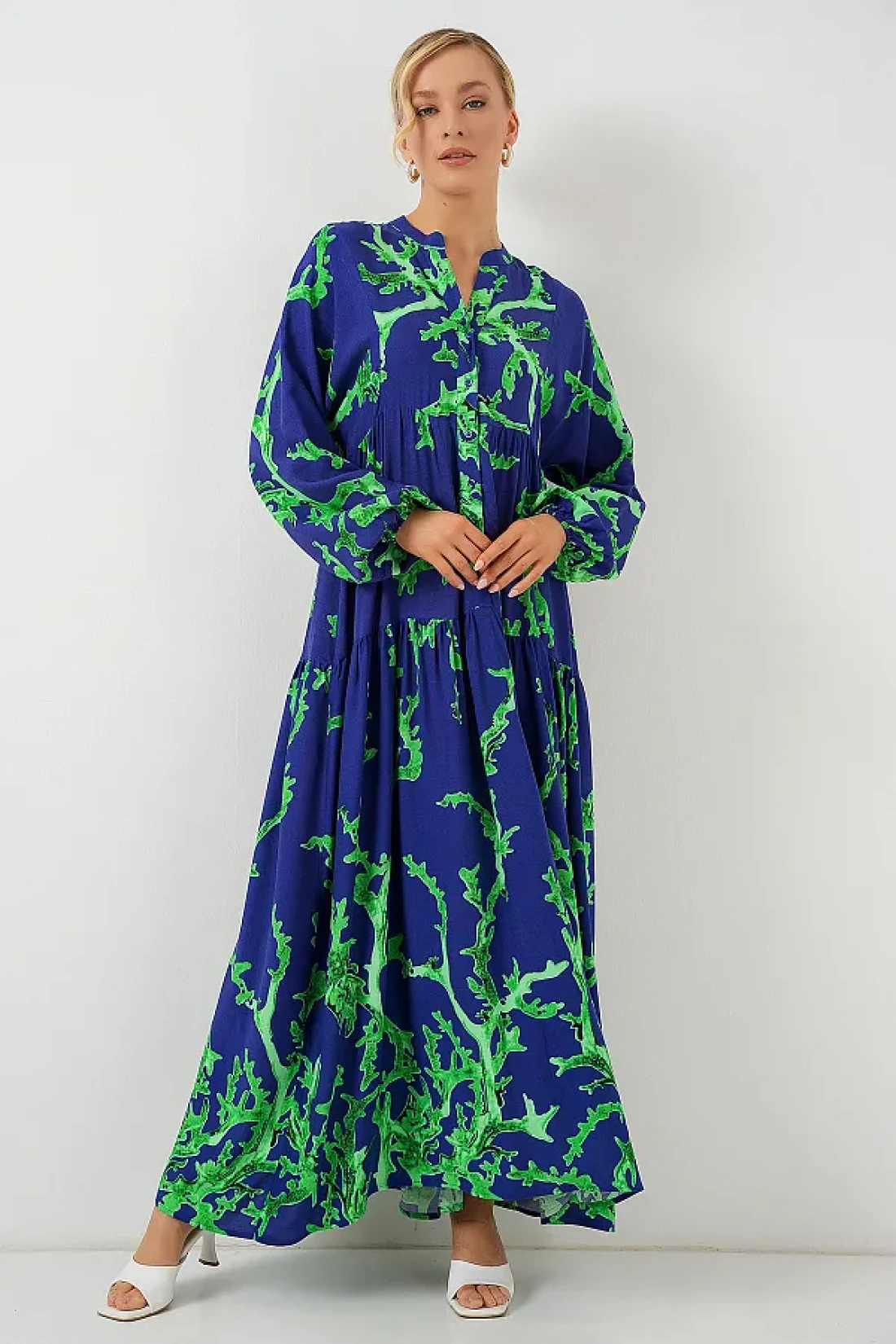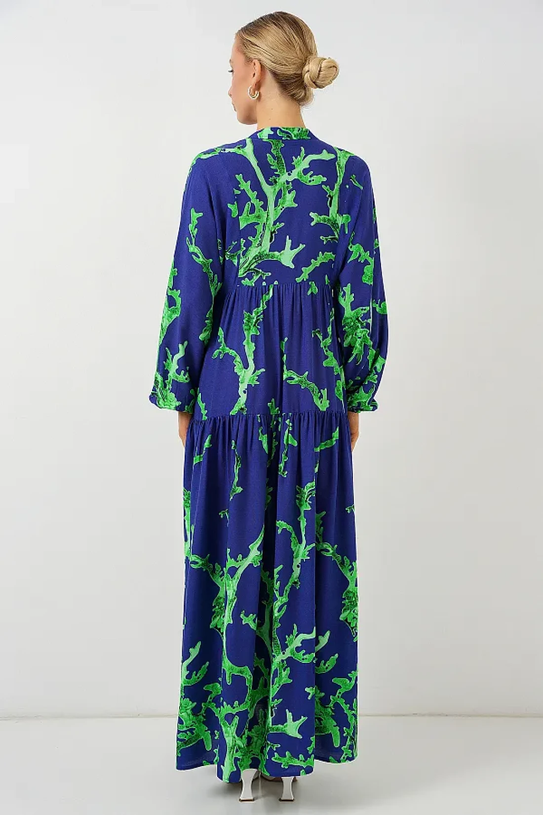 Product content % 100 viscose product features: authentic patterned dress model information size: 38 product length: 136 cm sleeve length: 60 cm our product is unlined. Model measurements: height: 176 chest: 90 waist: 63 hips: 94 general washing and usage instructions: do not exceed 30 c to avoid damaging the product during washing. wash the product according to the washing instructions. use appropriate detergent for colored products.