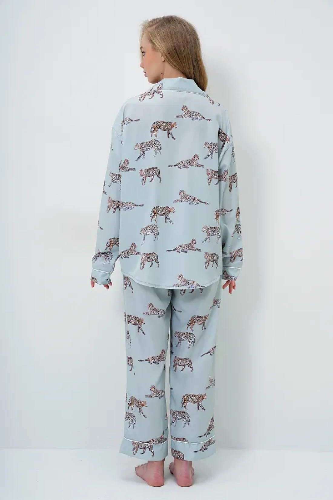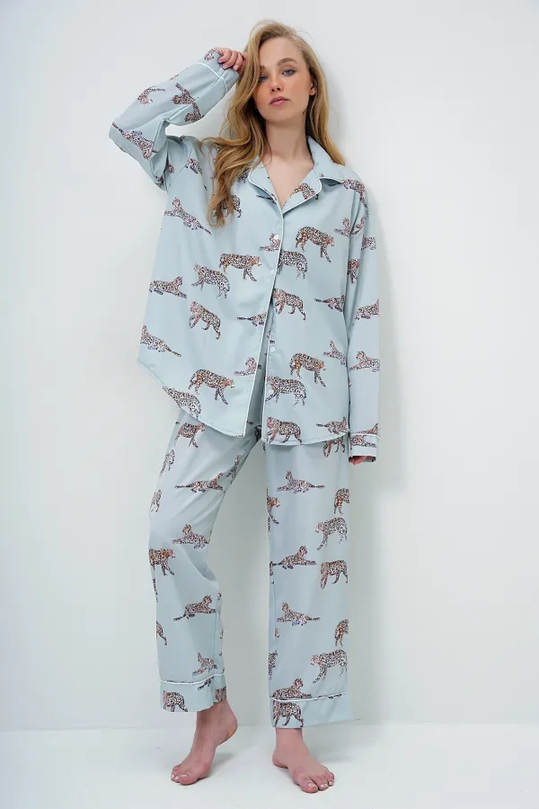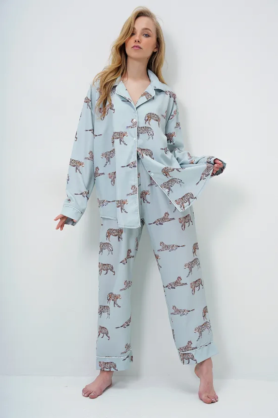 100% viscose Product length: 69 cm chest: 128 cm waist: 128 cm sleeve length: 58 cm bottom product length: 98 cm waist: 60 cm hip: 110 cm inner leg length: 68 cm leg: 22 cm Biye detail di̇ji̇tal Printed satin long shirt and pants pajama set with eye-catching design reflects your original style. Its structure enriched with fine details presents a modern stance. Sample size: s/36/1