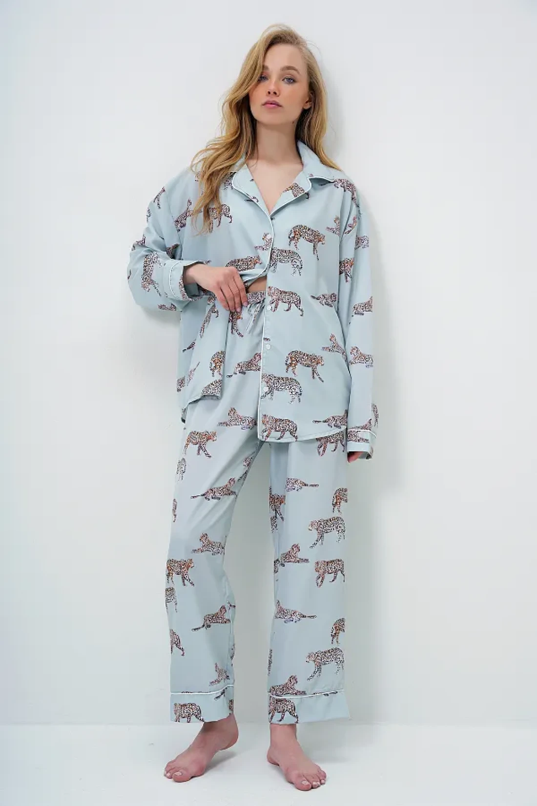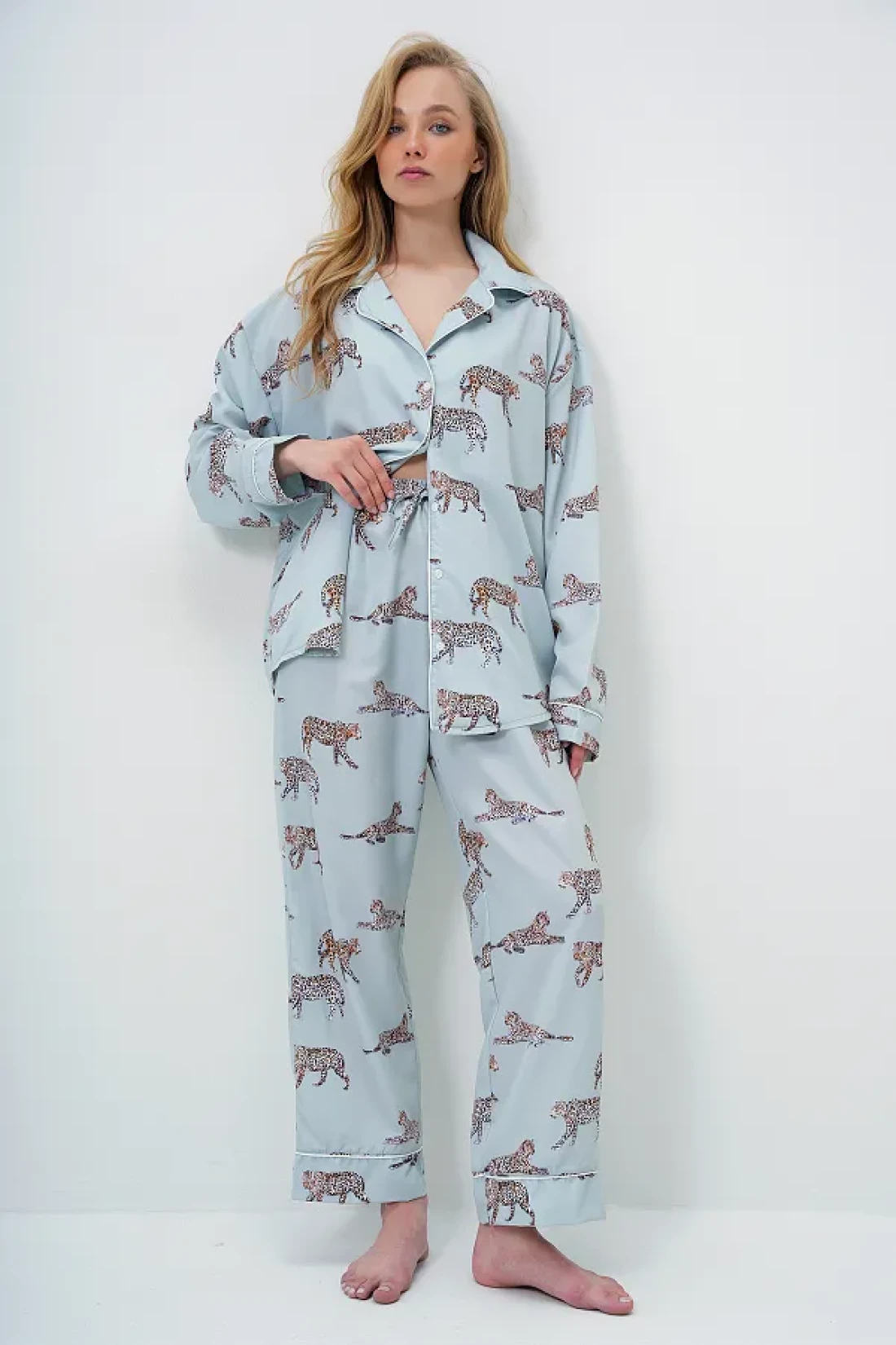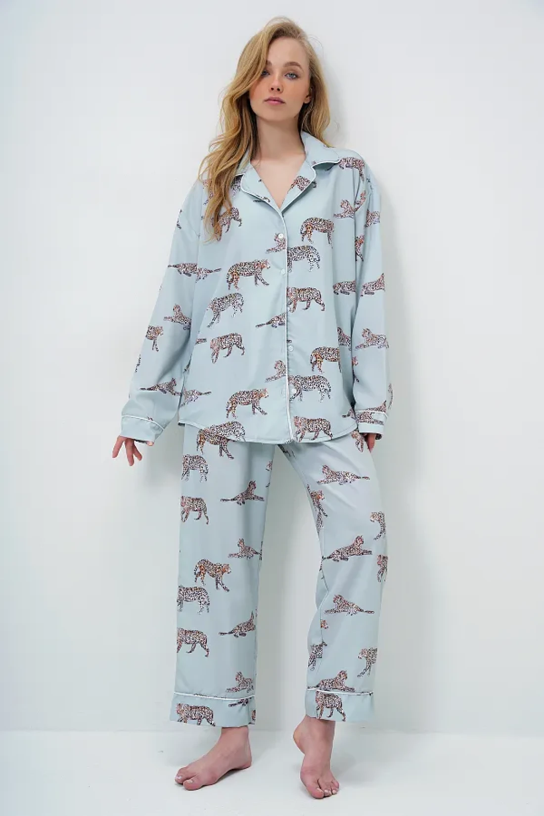 100% viscose Product length: 69 cm chest: 128 cm waist: 128 cm sleeve length: 58 cm bottom product length: 98 cm waist: 60 cm hip: 110 cm inner leg length: 68 cm leg: 22 cm Biye detail di̇ji̇tal Printed satin long shirt and pants pajama set with eye-catching design reflects your original style. Its structure enriched with fine details presents a modern stance. Sample size: s/36/1