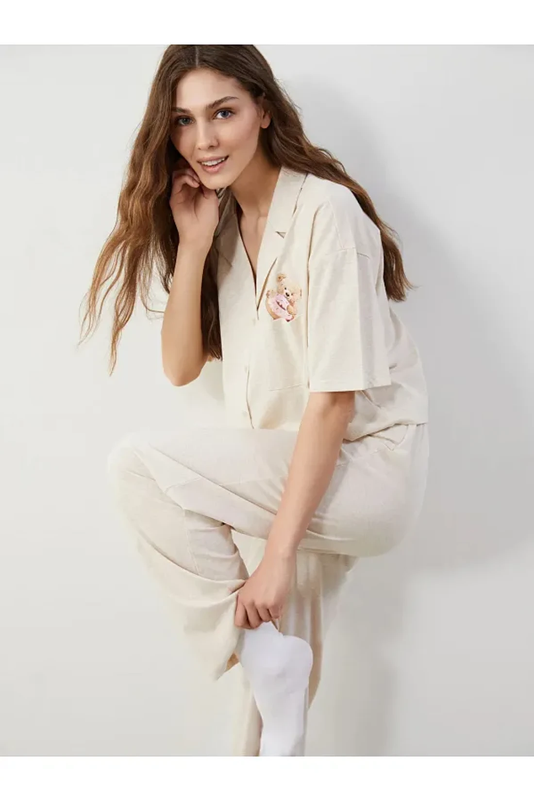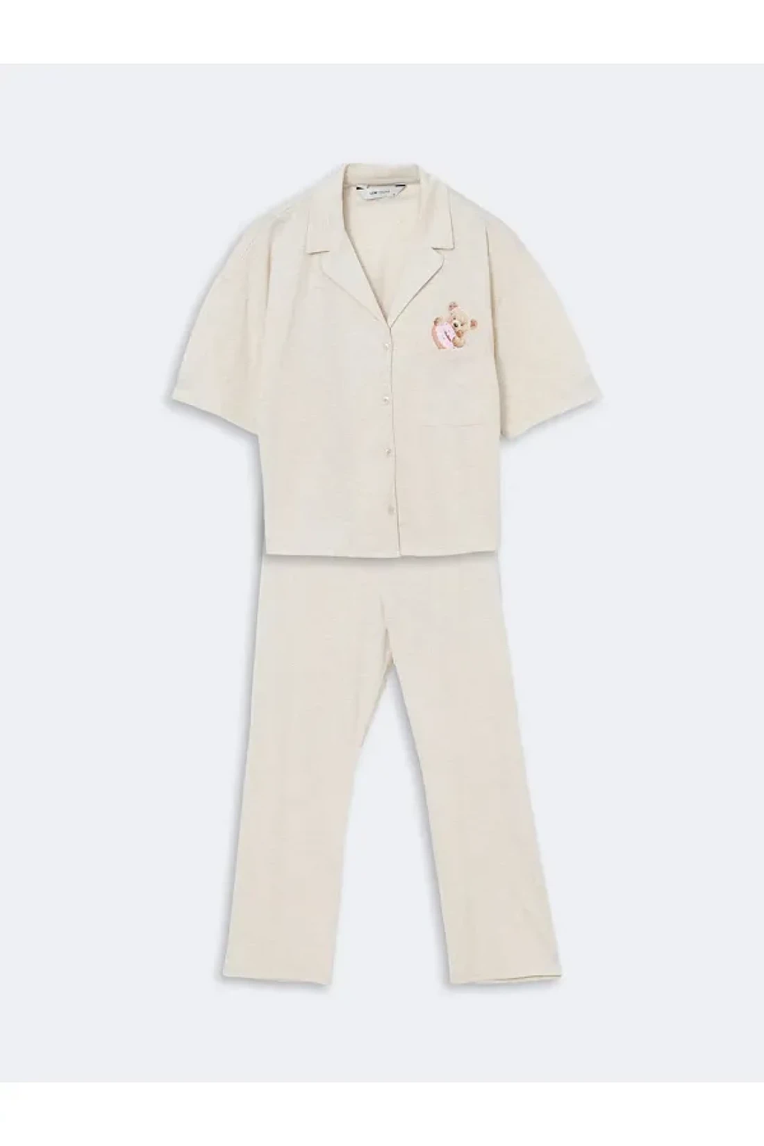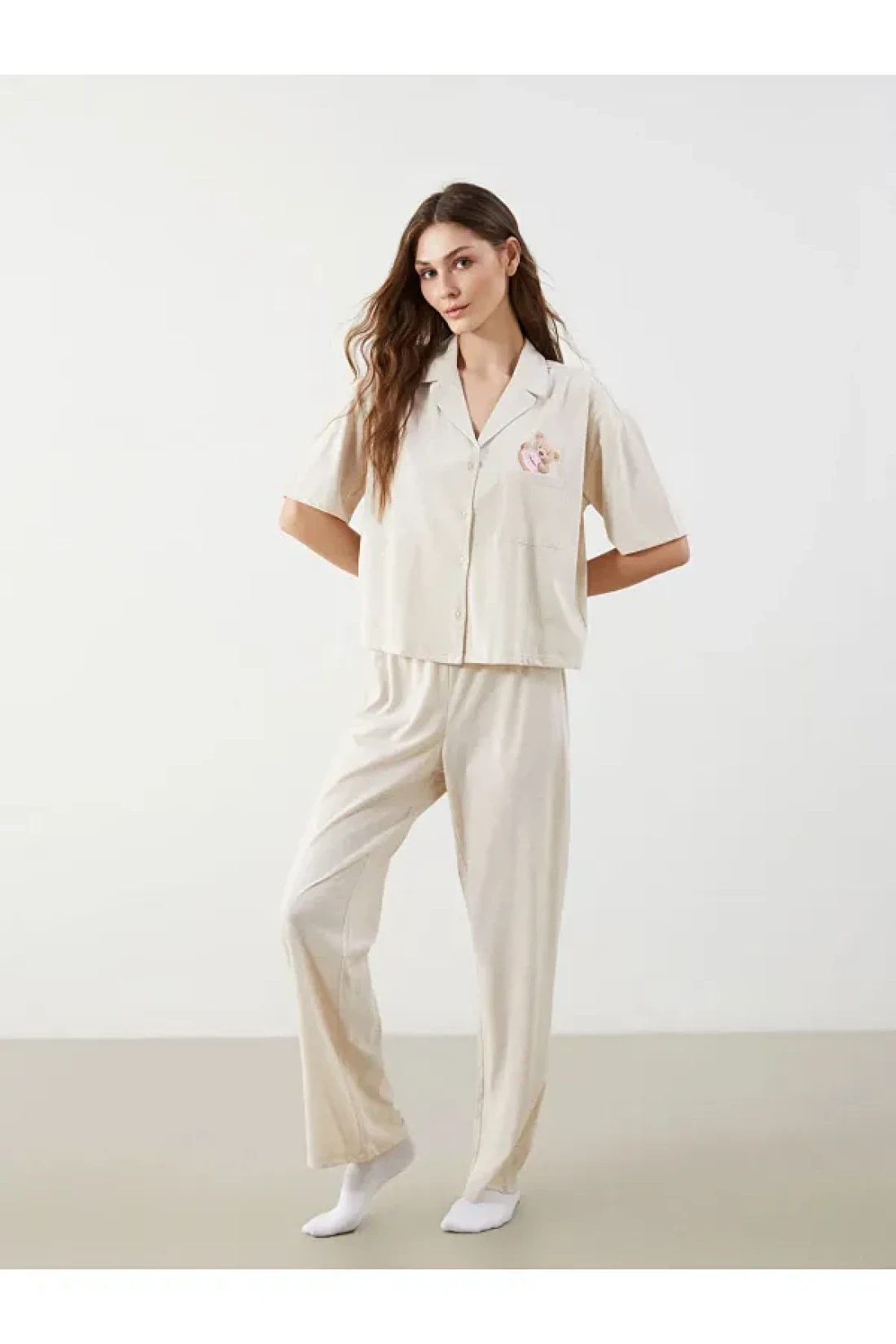 LC Waikiki Lcw Young Beige Shirt Collar Bear Teddy Printed Women's Pajamas Set