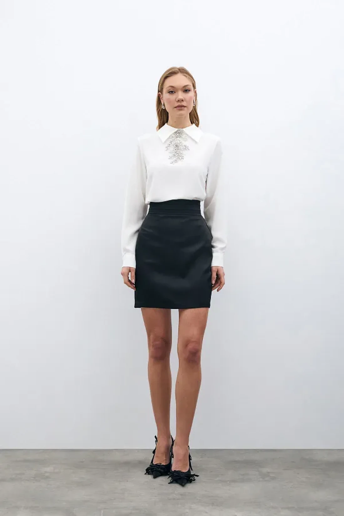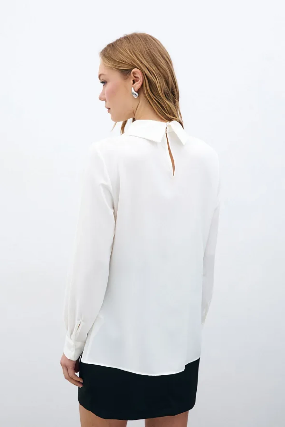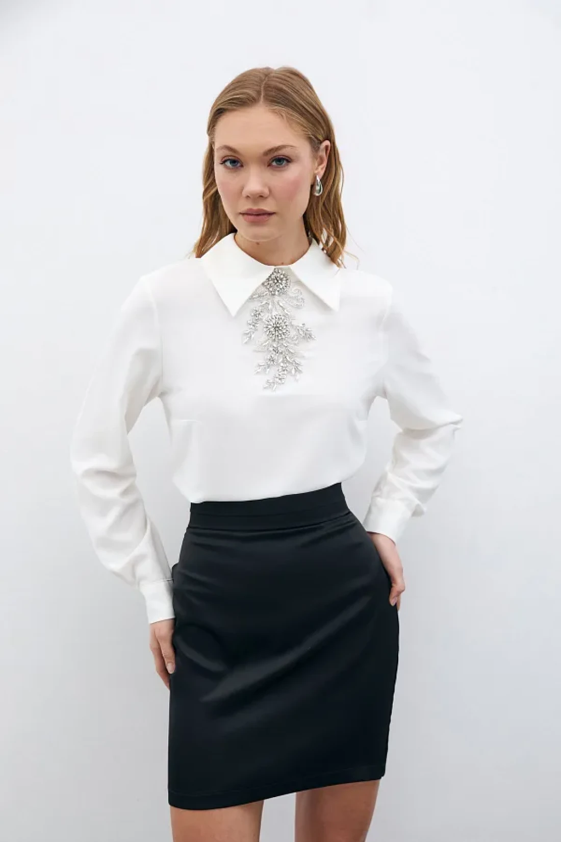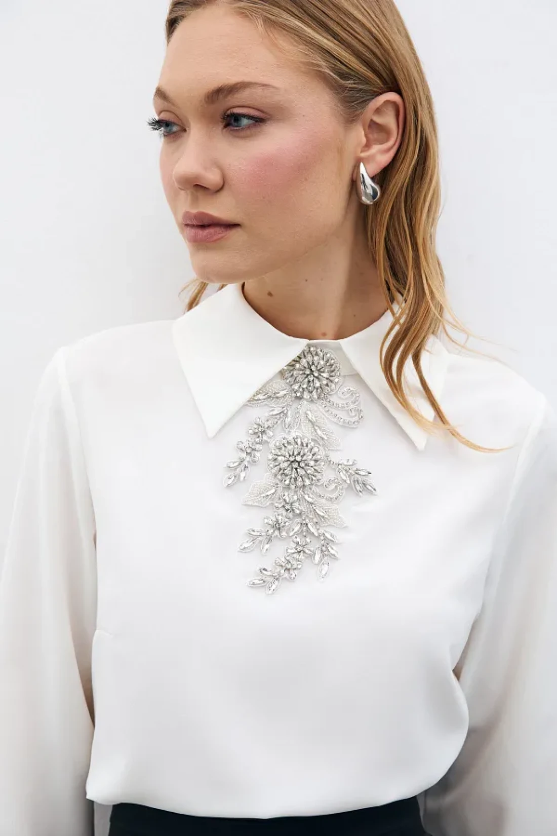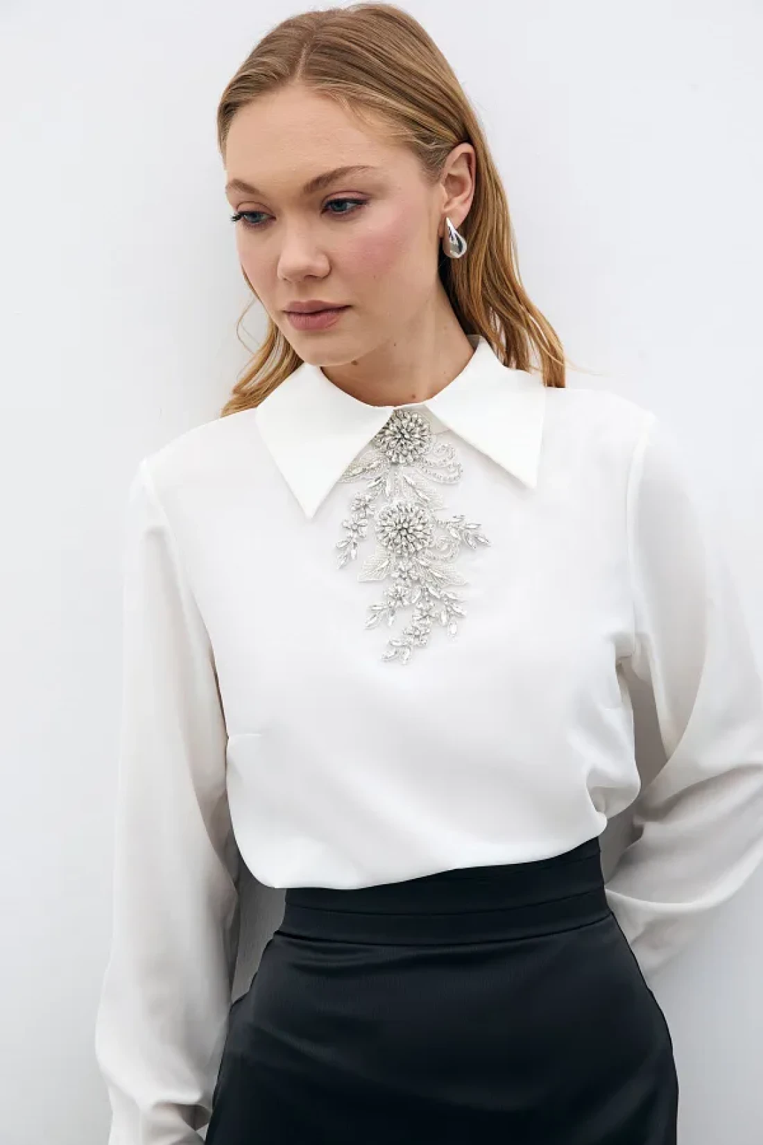 Blouse with shirt collar, long sleeves, back collar buttoned, hip length, stone accessory collar. Height: 70 cm the product on the model is size 36/s. Model measurements height: 1.76, chest: 83, waist: 60, hip: 90