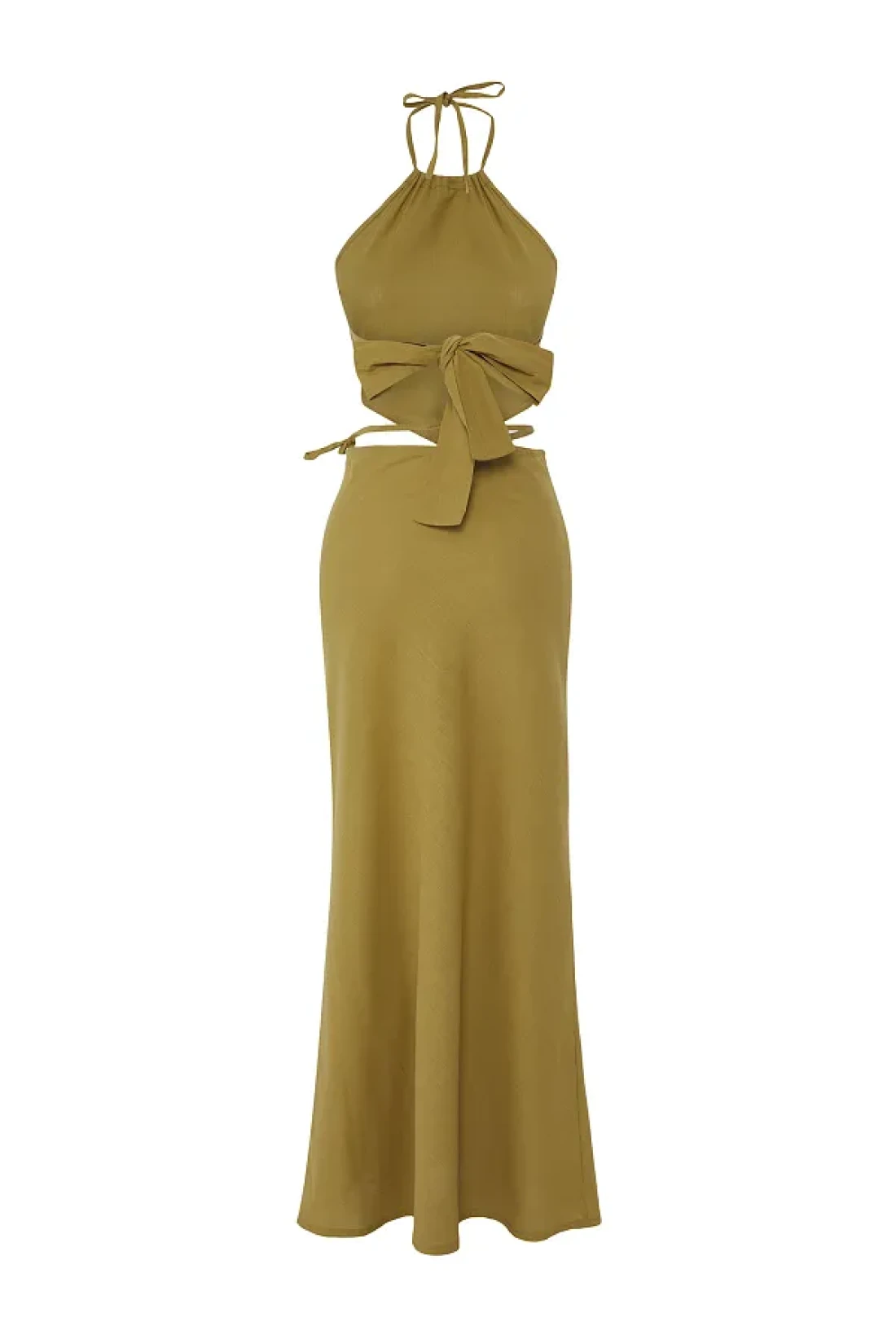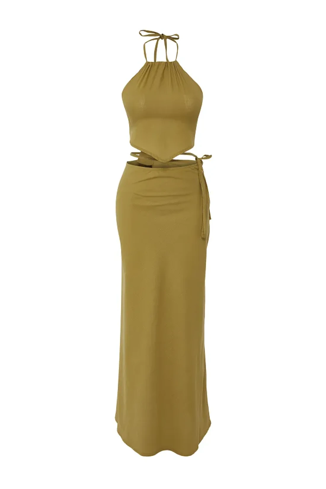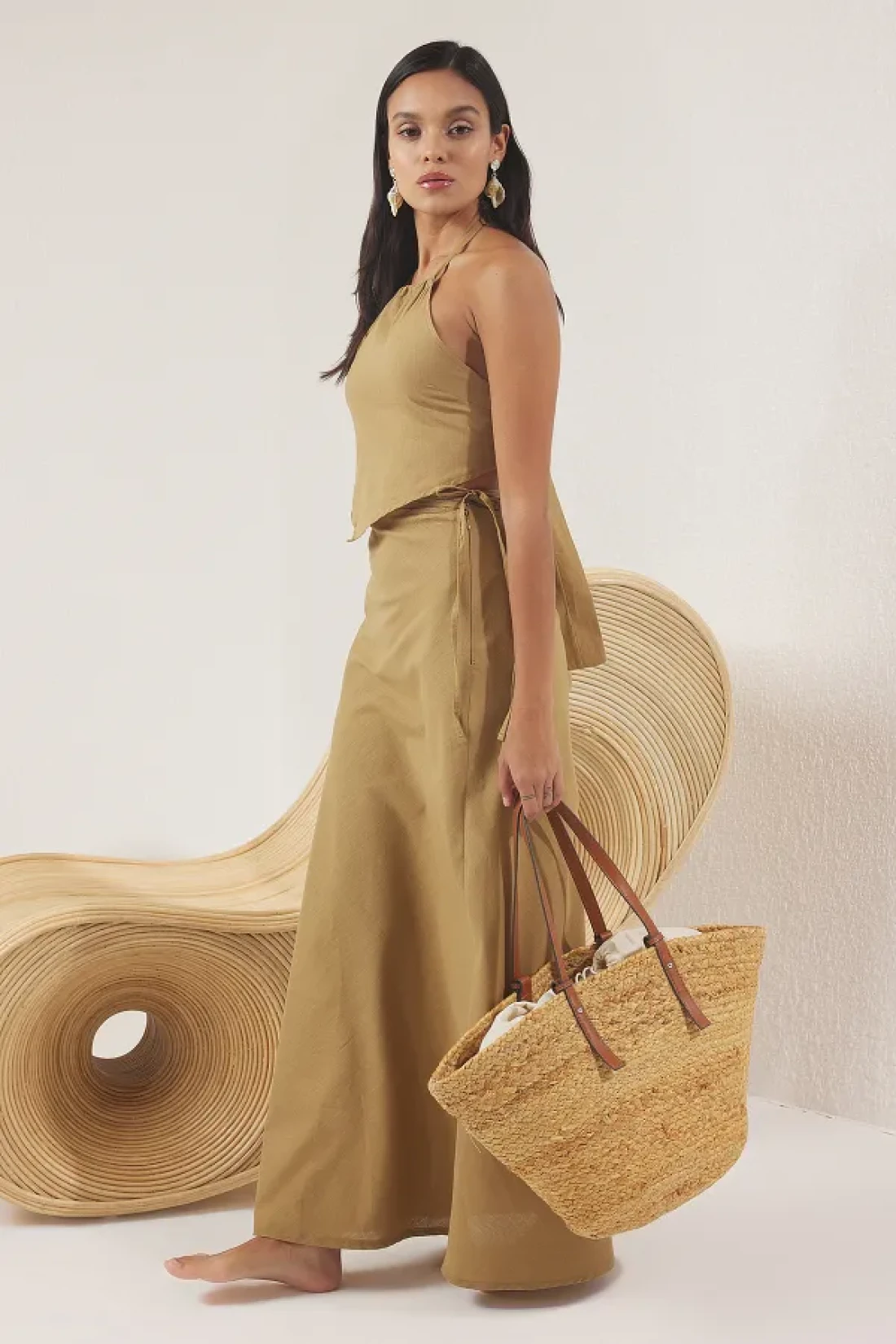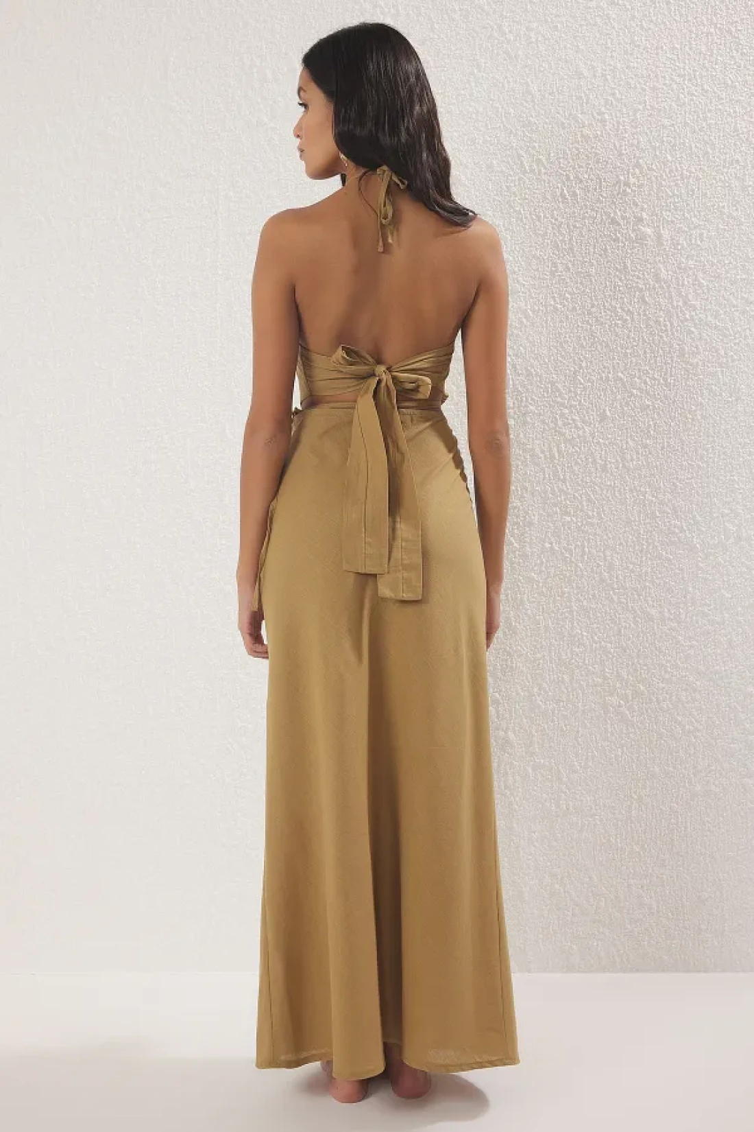 Collection Khaki Woven Halter Neck Back Detail Beach Blouse Skirt Suit Tbess25Au00089