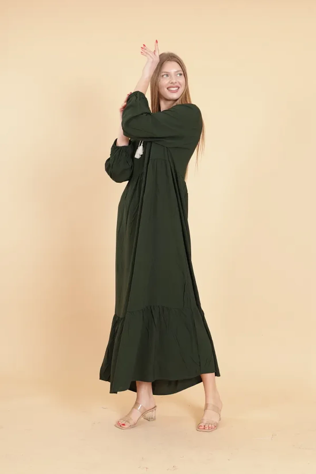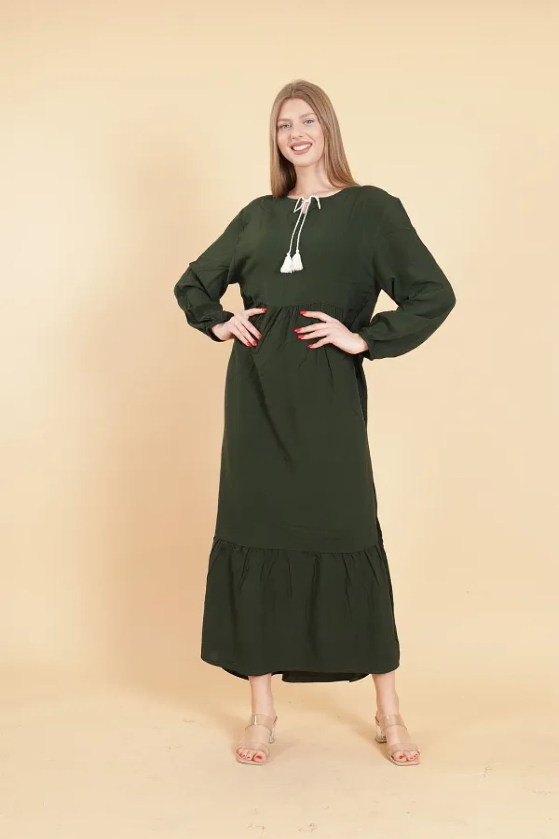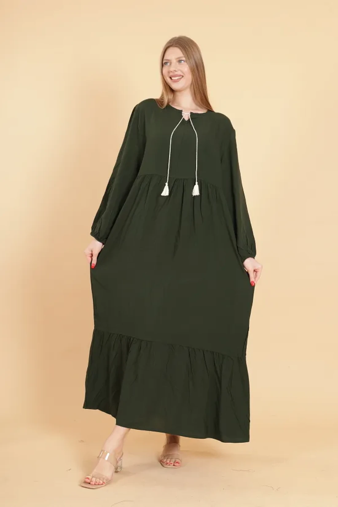 mervemoda Women's Khaki long sleeve full length Burgundy woven dress