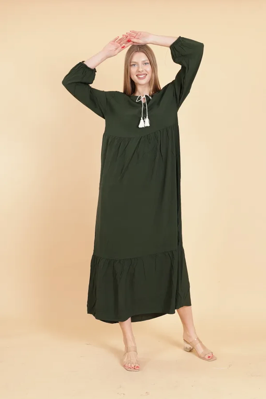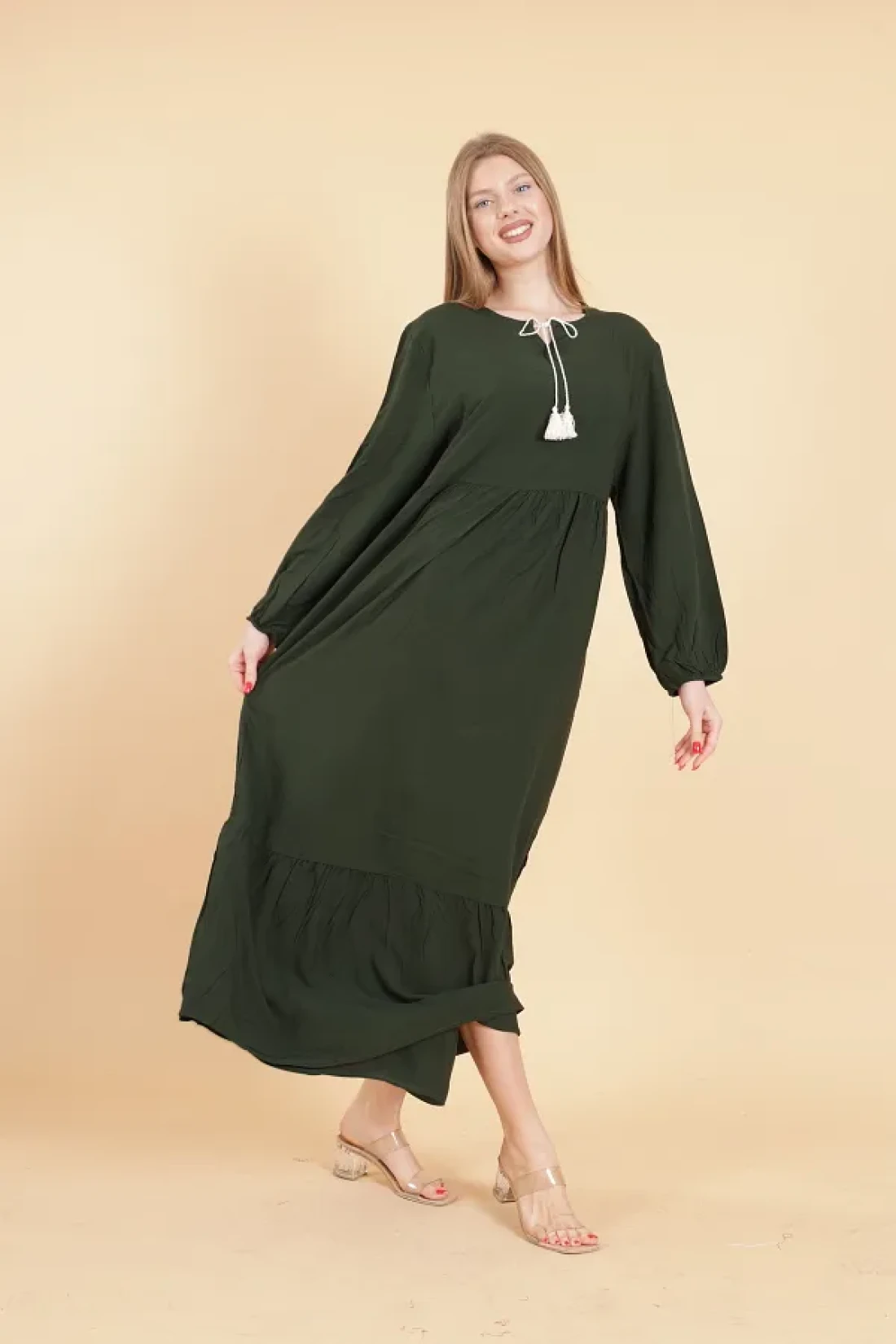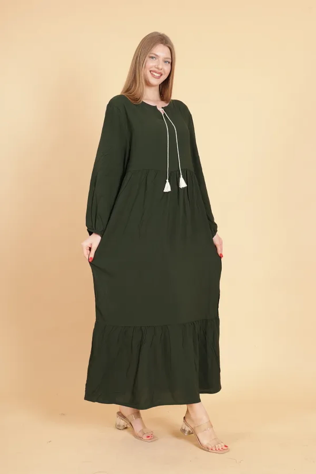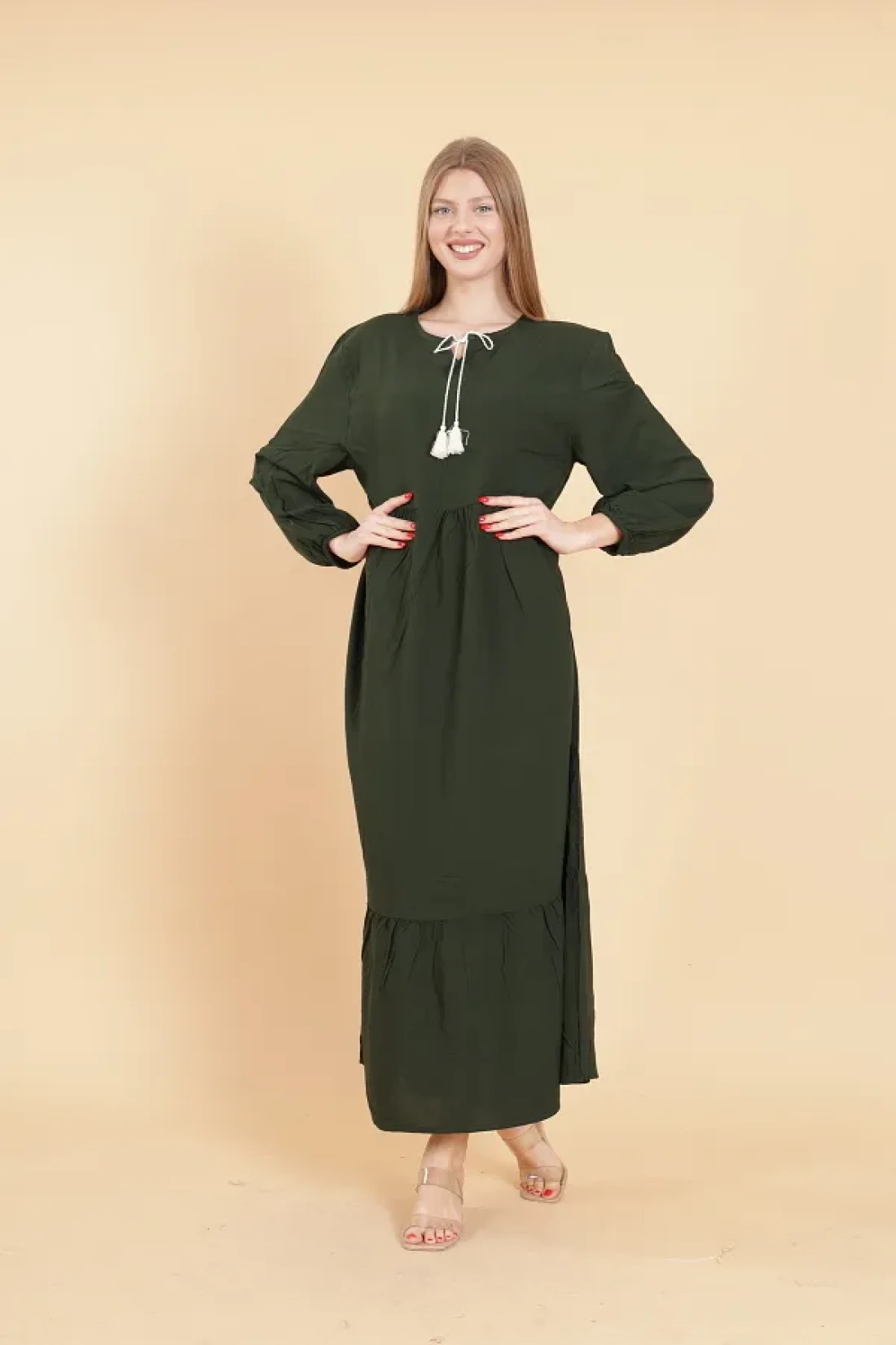 mervemoda Women's Khaki long sleeve full length Burgundy woven dress